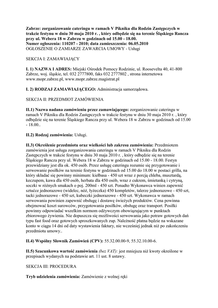 Zabrze: zorganizowanie cateringu w ramach V Pikniku dla Rodzin Zastępczych w trakcie festynu w dniu 30 maja 2010 r. , który odbędzie się na terenie Śląskiego Rancza przy ul. Webera 18 w Zabrzu w godzinach od 15.00 - 18.00. Numer ogłoszenia: 110207 - 2010; data zamieszczenia: 06.05.2010 OGŁOSZENIE O ZAMIARZE ZAWARCIA UMOWY - Usługi SEKCJA I: ZAMAWIAJĄCY I. 1) NAZWA I ADRES: Miejski Ośrodek Pomocy Rodzinie, ul. Roosevelta 40, 41-800 Zabrze, woj. śląskie, tel. 032 2777800, faks 032 2777802 , strona internetowa www.mopr.zabrze.pl, www.mopr.zabrze.magistrat.pl I. 2) RODZAJ ZAMAWIAJĄCEGO: Administracja samorządowa. SEKCJA II: PRZEDMIOT ZAMÓWIENIA II.1) Nazwa nadana zamówieniu przez zamawiającego: zorganizowanie cateringu w ramach V Pikniku dla Rodzin Zastępczych w trakcie festynu w dniu 30 maja 2010 r. , który odbędzie się na terenie Śląskiego Rancza przy ul. Webera 18 w Zabrzu w godzinach od 15.00 - 18.00.. II.2) Rodzaj zamówienia: Usługi. II.3) Określenie przedmiotu oraz wielkości lub zakresu zamówienia: Przedmiotem zamówienia jest usługa zorganizowania cateringu w ramach V Pikniku dla Rodzin Zastępczych w trakcie festynu w dniu 30 maja 2010 r. , który odbędzie się na terenie Śląskiego Rancza przy ul. Webera 18 w Zabrzu w godzinach od 15.00 - 18.00. Festyn przewidziany jest dla ok. 450 osób. Przez usługę cateringu rozumie się przygotowanie i serwowanie posiłków na terenie festynu w godzinach od 15.00 do 18.00 w postaci grilla, na który składać się powinny minimum: kiełbasa - 450 szt wraz z porcją chleba, musztardą, keczupem, kawa dla 450 osób, herbata dla 450 osób, wraz z cukrem, śmietanką i cytryną, soczki w różnych smakach o poj. 200ml - 450 szt. Ponadto Wykonawca winien zapewnić sztućce jednorazowe (widelec, nóż, łyżeczka) 450 kompletów, talerze jednorazowe - 450 szt, tacki jednorazowe - 450 szt, kubeczki jednorazowe - 450 szt. Wykonawca w ramach serwowania powinien zapewnić obsługę i dostawę świeżych produktów. Cena powinna obejmować koszt surowców, przygotowania posiłków, obsługę oraz transport. Posiłki powinny odpowiadać wszelkim normom odżywczym obowiązującym w punktach zbiorowego żywienia. Nie dopuszcza się możliwości serwowania jako potraw gotowych dań typu fast food oraz gotowych sproszkowanych zup. Należność płatna będzie na wskazane konto w ciągu 14 dni od daty wystawienia faktury, nie wcześniej jednak niż po zakończeniu przedmiotu umowy.. II.4) Wspólny Słownik Zamówień (CPV): 55.32.00.00-9, 55.32.10.00-6. II.5) Szacunkowa wartość zamówienia (bez VAT): jest mniejsza niż kwoty określone w przepisach wydanych na podstawie art. 11 ust. 8 ustawy. SEKCJA III: PROCEDURA Tryb udzielenia zamówienia: Zamówienie z wolnej ręki 1. Podstawa prawna Postępowanie wszczęte zostało na podstawie art. 5 ust. 1 i 1a ustawy z dnia 29 stycznia 2004 r. – Prawo zamówień publicznych. 2. Uzasadnienie wyboru trybu zgodnie z art. 5 ust. 1 i 1a w postępowaniach o udzielenie zamówień, których przedmiotem są usługi o charakterze niepriorytetowym wymienione w załączniku II B do dyrektywy 2004/18/WE Parlamentu Europejskiego i Rady z dnia 31 marca 2004 r. w sprawie koordynacji procedur udzielania zamówień publicznych na roboty budowlane, dostawy i usługi zamawiający nie musi stosować przepisów dotyczących przesłanek wyboru trybu zamówienia z wolnej ręki. W związku z tym, że zamawiana usługa mieści się w katalogu usług hotelarskich i restauracyjnych wymienionych w powyższym załączniku oraz z uwagi na dbałość o właściwą jakość tych usług zamawiający zastosował tryb zamówienia z wolnej ręki. SEKCJA IV: UDZIELENIE ZAMÓWIENIA NAZWA I ADRES WYKONAWCY KTÓREMU ZAMAWIAJĄCY ZAMIERZA UDZIELIĆ ZAMÓWIENIA POINT RESTAURANT, ul. Franciszkańska 8, 41-800 Zabrze, kraj/woj. śląskie.
