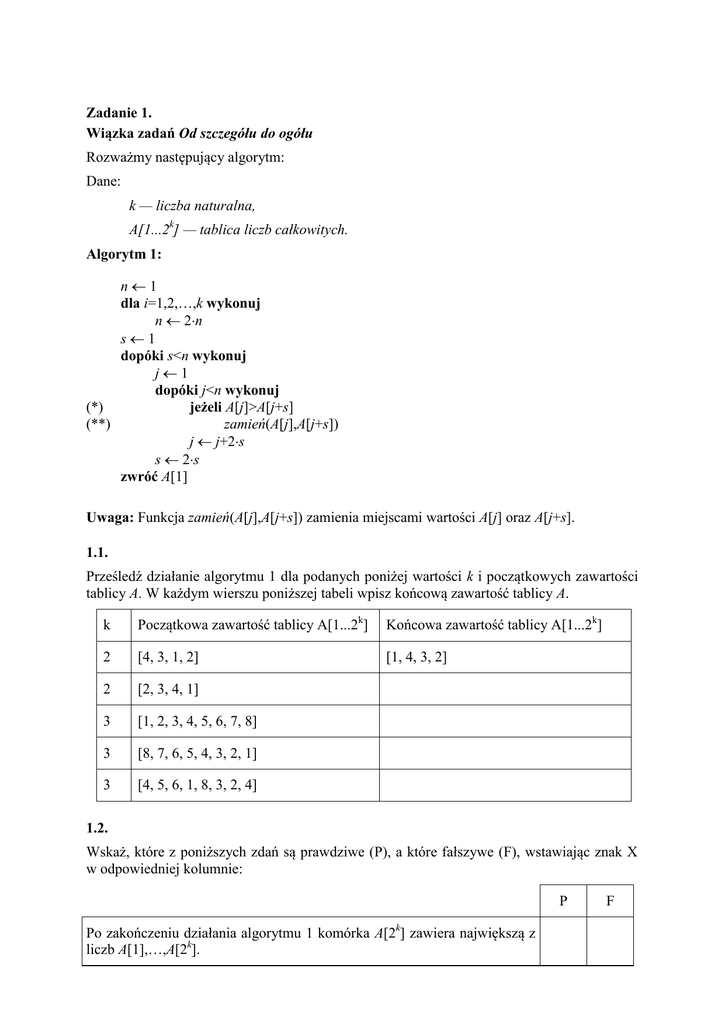 Zadanie 1. Wiązka zadań Od szczegółu do ogółu Rozważmy następujący algorytm: Dane: k — liczba naturalna, A[1...2k] — tablica liczb całkowitych. Algorytm 1: n1 dla i=1,2,…,k wykonuj n 2n s1 dopóki s<n wykonuj j1 dopóki j<n wykonuj (*) jeżeli A[j]>A[j+s] (**) zamień(A[j],A[j+s]) j j+2s s 2s zwróć A[1] Uwaga: Funkcja zamień(A[j],A[j+s]) zamienia miejscami wartości A[j] oraz A[j+s]. 1.1. Prześledź działanie algorytmu 1 dla podanych poniżej wartości k i początkowych zawartości tablicy A. W każdym wierszu poniższej tabeli wpisz końcową zawartość tablicy A. k Początkowa zawartość tablicy A[1...2k] Końcowa zawartość tablicy A[1...2k] 2 [4, 3, 1, 2] [1, 4, 3, 2] 2 [2, 3, 4, 1] 3 [1, 2, 3, 4, 5, 6, 7, 8] 3 [8, 7, 6, 5, 4, 3, 2, 1] 3 [4, 5, 6, 1, 8, 3, 2, 4] 1.2. Wskaż, które z poniższych zdań są prawdziwe (P), a które fałszywe (F), wstawiając znak X w odpowiedniej kolumnie: P Po zakończeniu działania algorytmu 1 komórka A[2k] zawiera największą z liczb A[1],…,A[2k]. F Po zakończeniu działania algorytmu 1 spełniona jest nierówność A[i] A[i+1] dla każdego i, takiego że 1 i 2k. Po zakończeniu działania algorytmu 1 komórka A[1] zawiera najmniejszą z liczb A[1],…,A[2k]. 1.3. Wskaż, które z poniższych zdań są prawdziwe (P), a które fałszywe (F), wstawiając znak X w odpowiedniej kolumnie. Przyjmij, że n=2k oraz k>1: P Instrukcja jeżeli w wierszu (*) jest wykonywana mniej niż 2n razy. Instrukcja jeżeli w wierszu (*) jest wykonywana mniej niż n/2 razy. Możliwe jest dobranie takiej początkowej zawartości A[1..2k], że instrukcja zamiany z wiersza (**) nie zostanie wykonana ani razu. Możliwe jest dobranie takiej początkowej zawartości A[1..2k], że instrukcja zamiany z wiersza (**) zostanie wykonana co najmniej 2n2 razy. 1.4. Rozważmy poniższy algorytm podobny do algorytmu 1. Wejście: k — liczba naturalna, A[1...2k] — tablica liczb całkowitych. Algorytm 2: n1 dla i=1,2,…,k wykonuj n 2n s1 dopóki s<n wykonuj j1 dopóki j<n wykonuj (*) jeżeli A[j]>A[j+1] zamień(A[j],A[j+1]) j j+1 s s+1 zwróć A[1], A[2],…,A[n] Uwaga: Funkcja zamień(A[j],A[j+1]) zamienia miejscami wartości A[j] oraz A[j+1]. Uzupełnij luki w poniższych zdaniach. Przyjmij n=2k oraz k>1. Po zakończeniu działania algorytmu 2 element A[i] jest ........................ niż element A[i+1] dla każdego i większego od ...................................... oraz mniejszego od ................................................................................... Wiersz (*) algorytmu 2 wykonywany będzie w przebiegu algorytmu ..................................... niż n razy, F ..................................... niż n2 razy. Zadanie 2. Wiązka zadań Scalanie Rozważmy następujący algorytm, który jako dane przyjmuje tablicę n-elementową, gdzie n jest potęgą dwójki: Dane: tablica liczb rzeczywistych T[1..n], gdzie 𝑛 = 2𝑚 , a m jest liczbą całkowitą nieujemną funkcja uporządkuj(T[1..n]): jeżeli n=1 zwróć T[1..n] i zakończ k ← n/2 A[1..k] ← uporządkuj(T[1 .. k]) B[1..k] ← uporządkuj(T[k+1 .. n]) zwróć scal(A, B) i zakończ Funkcja scal(A,B) dla danych dwóch tablic o rozmiarze k zwraca tablicę o rozmiarze 2k, powstałą przez połączenie tablic A i B w sposób uporządkowany, tj. od elementu najmniejszego do największego. Na przykład dla tablic A = [4,6,18,22] i B = [1,3,10,15] wywołanie scal(A,B) zwróci tablicę [1,3,4,6,10,15,18,22]. 2.1. Spośród danych tablic wybierz te, które są zgodne ze specyfikacją algorytmu, a następnie podaj dla nich wynik jego działania. T = [ 15, 11 ], T = [ 1, 3, 8 ], T = [ 8, 4, 2, 1], T = [ 10, 15, 1 , 6, 9, 2, 5, 90 ]. 2.2. Funkcja uporządkuj jest funkcją rekurencyjną. Uzupełnij poniższe drzewo wywołań rekurencyjnych dla danej tablicy T = [8, 80, 90, 14, 3, 5, 20, 10, 5, 6, 90, 34, 11, 13, 56, 9]. 8, 80, 90, 14, 3, 5, 20, 10, 5, 6, 90, 34, 11, 13, 56, 9 8, 80, 90, 14, 3, 5, 20, 10 5, 6, 90, 34, 11, 13, 56, 9 2.3. Załóżmy, że wywołanie procedury scal(A,B) dla dwóch tablic o długości k wykonuje 2k–1 kosztownych operacji (porównywania liczb). Podaj liczbę kosztownych operacji, jaka zostanie wykonana przez funkcję uporządkuj dla tablicy T[1..16] = [ 8, 80, 90, 14, 3, 5, 20, 10, 5, 6, 90, 34, 11, 13, 56, 9 ]. Zadanie 3. Wiązka zadań Dwa ciągi Niech A[1..n] i B[1..n] będą uporządkowanymi rosnąco tablicami liczb całkowitych i niech x będzie liczbą całkowitą. Rozważmy następujący algorytm: i←1 j←n dopóki (i ≤ n oraz j > 0) wykonuj dopóki (i ≤ n oraz j > 0)wykonuj (*) jeżeli A[i] + B[j] = x podaj wynik PRAWDA i zakończ algorytm w przeciwnym razie jeżeli A[i] + B[j] < x i← i + 1 w przeciwnym razie j← j – 1 podaj wynik FAŁSZ 3.1. Uzupełnij poniższą tabelę. Podaj wynik działania algorytmu oraz liczbę porównań wykonanych w wierszu oznaczonym (*). Tablica A Tablica B x 3, 5, 12, 17 8, 10, 13, 14 21 4, 6, 8, 10 5, 7, 9, 11 13 Wynik działania algorytmu Liczba porównań w kroku (*) 3.2. Przeanalizuj działanie zaprezentowanego algorytmu i uzupełnij poniższą specyfikację. Dane: n — dodatnia liczba całkowita A[1..n], B[1..n] — n-elementowe tablice liczb całkowitych, posortowane rosnąco x — liczba całkowita Wynik: PRAWDA, gdy ................................................................................................................. FAŁSZ, gdy ....................................................................................................................... 3.3. Podaj przykład pięcioelementowych tablic A i B, dla których przy x = 20 algorytm wykona sześć porównań w wierszu (*), a wynikiem będzie PRAWDA. Zadanie 4. Wiązka zadań Dzielenie wielomianu Rozważamy wielomiany 𝑃(𝑥) stopnia 𝑛 − 1, gdzie 𝑛 jest potęgą dwójki: 𝑃(𝑥) = 𝑎0 + 𝑎1 𝑥 + 𝑎2 𝑥 2 + ⋯ + 𝑎𝑛−1 𝑥 𝑛−1 , 𝑛 = 2𝑚 . Do obliczania wartości 𝑃(𝑥) można zastosować technik