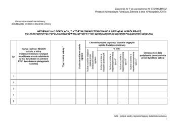 Załącznik Nr 7 do zarządzenia Nr 77/2015/DSOZ Prezesa Narodowego Funduszu Zdrowia z dnia 19 listopada 2015 r. Oznaczenie świadczeniodawcy składającego wniosek o zawarcie umowy INFORMACJA O SZKOŁACH, Z KTÓRYMI ŚWIADCZENIODAWCA NAWIĄZAŁ WSPÓŁPRACĘ Charakterystyka populacji uczniów objętych opieką Świadczeniodawcy liczba uczniów z niepełnosprawnością 2 typu C liczba uczniów z niepełnosprawnością 2 typu B liczba uczniów z niepełnosprawnością 2 typu A w tym: liczba uczniów w klasach sportowych liczba uczniów objętych opieką przez świadczeniodawcę ogółem Liczba uczniów w szkole ogółem Lp. Nazwa i adres i REGON szkoły, z którą świadczeniodawca nawiązał współpracę w celu udzielania w niej świadczeń w zakresie POZ: świadczenia pielęgniarki szkolnej Typ i rodzaj szkoły 1 I CHARAKTERYSTYCE POPULACJI UCZNIÓW OBJĘTYCH W TYCH SZKOŁACH ŚWIADCZENIAMI PIELĘGNIARKI SZKOLNEJ Oznaczenie i data podpisania porozumienia przez dyrektora szkoły 1 2 3 4 5 ........................................................................................ data i podpis osoby reprezentującej świadczeniodawcę 1 Załącznik Nr 7 do zarządzenia Nr 77/2015/DSOZ Prezesa Narodowego Funduszu Zdrowia z dnia 19 listopada 2015 r. Objaśnienia: 1 Typy i rodzaje szkół: Typ I – szkoła podstawowa, gimnazjum, liceum, liceum profilowane-bez nauki w warsztatach w szkole, szkoła artystyczna na prawach gimnazjum lub liceum, szkoła policealna z tokiem nauki nie dłuższym niż 2,5 roku; Typ II – szkoła prowadząca naukę zawodu z warsztatami w szkole albo szkoła sportowa Typ III – szkoła specjalna dla dzieci i młodzieży 2 Typy niepełnosprawności uczniów: A – uczniowie z upośledzeniem umysłowym w stopniu lekkim, sprawni ruchowo; słabowidzący i niedowidzący; słabosłyszący i niesłyszący; przewlekle chorzy (w tym osoby w szkołach dla dzieci i młodzieży niedostosowanej społecznie) B – uczniowie z upośledzeniem umysłowym w stopniu lekkim i niepełnosprawni ruchowo oraz z upośledzeniem umysłowym w stopniu umiarkowanym i sprawni ruchowo C – uczniowie z upośledzeniem umysłowym w stopniu umiarkowanym i uczniowie z upośledzeniem umysłowym w stopniu znacznym i niepełnosprawni ruchowo Uwaga! W przypadku Zespołu Szkół informację należy przekazać odrębnie dla każdej ze szkół wchodzących w skład Zespołu 2