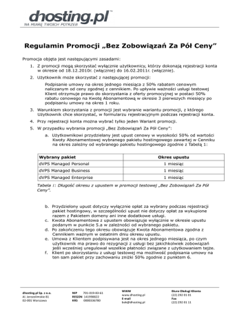 Regulamin Promocji „Bez Zobowiązań Za Pół Ceny” Promocja objęta jest następującymi zasadami: 1. Z promocji mogą skorzystać wyłącznie użytkownicy, którzy dokonają rejestracji konta w okresie od 18.12.2010r. (włącznie) do 16.02.2011r. (włącznie). 2. Użytkownik może skorzystać z następującej promocji: Podpisanie umowy na okres jednego miesiąca z 50% rabatem cenowym naliczanym od ceny zgodnej z cennikiem. Po upływie ważności usługi testowej Klient otrzymuje prawo do skorzystania z oferty promocyjnej w postaci 50% rabatu cenowego na Kwotę Abonamentową w okresie 3 pierwszych miesięcy po podpisaniu umowy na okres 1 roku. 3. Warunkiem skorzystania z promocji jest wybranie wariantu promocji, z którego Użytkownik chce skorzystać, w formularzu rejestracyjnym podczas rejestracji konta. 4. Przy rejestracji konta można wybrać tylko jeden Wariant promocji. 5. W przypadku wybrania promocji „Bez Zobowiązań Za Pół Ceny”: a. Użytkownikowi przydzielany jest upust cenowy w wysokości 50% od wartości Kwoty Abonamentowej wybranego pakietu hostingowego zawartej w Cenniku na okres zależny od wybranego pakietu hostingowego zgodnie z Tabelą 1: Wybrany pakiet Okres upustu dVPS Managed Personal 1 miesiąc dVPS Managed Business 1 miesiąc dVPS Managed Enterprise 1 miesiąc Tabela 1: Długość okresu z upustem w promocji testowej „Bez Zobowiązań Za Pół Ceny”. b. Przydzielony upust dotyczy wyłącznie opłat za wybrany podczas rejestracji pakiet hostingowy, w szczególności upust nie dotyczy opłat za wykupione razem z Pakietem domeny ani inne dodatkowe usługi. c. Kwota Abonamentowa z upustem obowiązuje wyłącznie w okresie upustu podanym w punkcie 5.a w zależności od wybranego pakietu. d. Po zakończeniu tego okresu obowiązuje Kwota Abonamentowa zgodna z Cennikiem ważnym w ostatnim dniu okresu upustu. e. Umowa z Klientem podpisywana jest na okres jednego miesiąca, po czym użytkownik ma prawo do rezygnacji z usługi bez jakichkolwiek zobowiązań jeśli wcześniej uregulował wszelkie płatności związane z użytkowaniem tejże. f. Klient po skorzystaniu z usługi testowej ma możliwość podpisania umowy na ten sam pakiet przy zachowaniu zniżki 50% zgodnie z punktem 6. dhosting.pl Sp. z o.o. Al. Jerozolimskie 81 02-001 Warszawa NIP 701-019-83-61 REGON 141998822 KRS 0000336780 WWW www.dhosting.pl E-mail [email protected] Biuro Obsługi Klienta (22) 292 01 01 Fax (22) 292 01 11 6. W przypadku przedłużenia umowy na okres jednego roku po skorzystaniu z promocji testowej „Bez Zobowiązań Za Pół Ceny”: a. Użytkownikowi przydzielany jest upust cenowy w wysokości 50% od wartości Kwoty Abonamentowej wybranego pakietu hostingowego zawartej w Cenniku na okres zależny od wybranego pakietu hostingowego zgodnie z Tabelą 2: Wybrany pakiet Okres upustu dVPS Managed Personal 3 miesiące dVPS Managed Business 3 miesiące dVPS Managed Enterprise 3 miesiące Tabela 2: Długość okresu z upustem przy podpisaniu umowy na okres 1 roku w promocji „Bez Zobowiązań Za Pół Ceny”. b. Przydzielony upust dotyczy wyłącznie opłat za wybrany podczas rejestracji pakiet hostingowy, w szczególności upust nie dotyczy opłat za wykupione razem z pakietem domeny ani inne dodatkowe usługi. c. Kwota Abonamentowa z upustem obowiązuje wyłącznie w okresie upustu podanym w punkcie 6.a w zależności od wybranego pakietu. d. Po zakończeniu tego okresu obowiązuje Kwota Abonamentowa zgodna z Cennikiem ważnym w ostatnim dniu okresu upustu. e. Umowa z Klientem podpisywana jest na okres jednego roku. 7. Promocja nie łączy się z innymi promocjami poza podanymi w niniejszym punkcie. 8. Jeżeli Umowa zostanie rozwiązana z winy Użytkownika, to Użytkownik zobowiązuje się do zapłaty kary umownej zgodnie z Regulaminem Usługi. 9. Podmiot lub osoba fizyczna może zamówić tylko jeden serwer w promocji „Bez Zobowiązań Za Pół Ceny”. 10. Podmiot lub osoba fizyczna może posiadać tylko jeden aktywny serwer zamówiony w promocji „Bez Zobowiązań Za Pół Ceny”. 11. W sprawach nieuregulowanych niniejszym regulaminem ma zastosowanie Regulamin Usług Hostingowych. dhosting.pl Sp. z o.o. Al. Jerozolimskie 81 02-001 Warszawa NIP 701-019-83-61 REGON 141998822 KRS 0000336780 WWW www.dhosting.pl E-mail [email protected] Biuro Obsługi Klienta (22) 292 01 01 Fax (22) 292 01 11