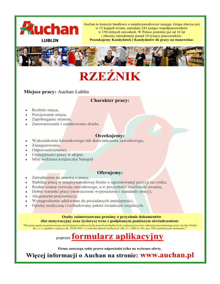 LUBLIN Auchan to koncern handlowy o międzynarodowym zasięgu. Grupa obecna jest w 12 krajach świata, zatrudnia 243 tysiące współpracowników w 150 różnych zawodach. W Polsce jesteśmy już od 16 lat i obecnie zatrudniamy ponad 10 tysięcy pracowników. Poszukujemy Kandydatek i Kandydatów do pracy na stanowisku: RZEŹNIK Miejsce pracy: Auchan Lublin Charakter pracy: Rozbiór mięsa, Porcjowanie mięsa, Zapobieganie stratom, Zatowarowanie i oznakowanie działu. Oczekujemy: Wykształcenia kierunkowego lub doświadczenia zawodowego, Zaangażowania, Odpowiedzialności, Umiejętności pracy w ekipie, Mile widziana książeczka Sanepid Oferujemy: Zatrudnienie na umowę o pracę, Stabilną pracę w międzynarodowej firmie o ugruntowanej pozycji na rynku, Realne szanse rozwoju zawodowego, a w przyszłości możliwość awansu, Dobre warunki pracy (nowoczesne wyposażenie i standardy pracy), Akcjonariat pracowniczy, Wynagrodzenie adekwatne do posiadanych umiejętności, Opiekę medyczną i rozbudowany pakiet świadczeń socjalnych. Osoby zainteresowane prosimy o przysłanie dokumentów (list motywacyjny oraz życiorys) wraz z podpisanym poniższym oświadczeniem: "Wyrażam zgodę na przetwarzanie moich danych osobowych dla potrzeb niezbędnych do realizacji procesów rekrutacji prowadzonego przez Auchan Polska Sp. z o. o. zgodnie z ustawą z dn. 29.08.1997 r. o ochronie danych osobowych, (Dz. U. z 2002 nr 101. poz. 926 z późniejszymi zmianami).", poprzez formularz aplikacyjny Firma zastrzega sobie prawo odpowiedzi tylko na wybrane oferty. Więcej informacji o Auchan na stronie: www.auchan.pl