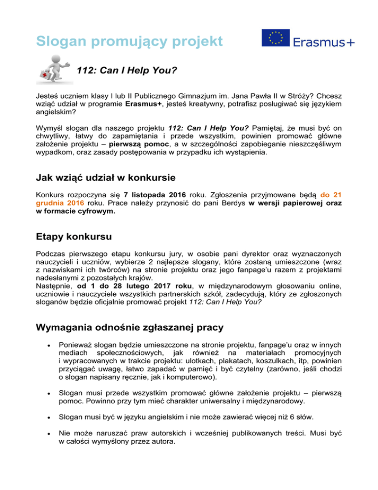Slogan promujący projekt 112: Can I Help You? Jesteś uczniem klasy I lub II Publicznego Gimnazjum im. Jana Pawła II w Stróży? Chcesz wziąć udział w programie Erasmus+, jesteś kreatywny, potrafisz posługiwać się językiem angielskim? Wymyśl slogan dla naszego projektu 112: Can I Help You? Pamiętaj, że musi być on chwytliwy, łatwy do zapamiętania i przede wszystkim, powinien promować główne założenie projektu – pierwszą pomoc, a w szczególności zapobieganie nieszczęśliwym wypadkom, oraz zasady postępowania w przypadku ich wystąpienia. Jak wziąć udział w konkursie Konkurs rozpoczyna się 7 listopada 2016 roku. Zgłoszenia przyjmowane będą do 21 grudnia 2016 roku. Prace należy przynosić do pani Berdys w wersji papierowej oraz w formacie cyfrowym. Etapy konkursu Podczas pierwszego etapu konkursu jury, w osobie pani dyrektor oraz wyznaczonych nauczycieli i uczniów, wybierze 2 najlepsze slogany, które zostaną umieszczone (wraz z nazwiskami ich twórców) na stronie projektu oraz jego fanpage’u razem z projektami nadesłanymi z pozostałych krajów. Następnie, od 1 do 28 lutego 2017 roku, w międzynarodowym głosowaniu online, uczniowie i nauczyciele wszystkich partnerskich szkół, zadecydują, który ze zgłoszonych sloganów będzie oficjalnie promować projekt 112: Can I Help You? Wymagania odnośnie zgłaszanej pracy Ponieważ slogan będzie umieszczone na stronie projektu, fanpage’u oraz w innych mediach społecznościowych, jak również na materiałach promocyjnych i wypracowanych w trakcie projektu: ulotkach, plakatach, koszulkach, itp, powinien przyciągać uwagę, łatwo zapadać w pamięć i być czytelny (zarówno, jeśli chodzi o slogan napisany ręcznie, jak i komputerowo). Slogan musi przede wszystkim promować główne założenie projektu – pierwszą pomoc. Powinno przy tym mieć charakter uniwersalny i międzynarodowy. Slogan musi być w języku angielskim i nie może zawierać więcej niż 6 słów. Nie może naruszać praw autorskich i wcześniej publikowanych treści. Musi być w całości wymyślony przez autora. Pozostałe informacje Uczestnicy konkursu zgadzają się na publikacje swoich prac oraz użycie swoich nazwisk w celach reklamowych, jak i na materiałach wypracowanych w tracie trwania projektu, zarówno teraz, jak i w przyszłości. Zgłoszenie prac na konkurs uważane będzie za wyrażenie zgody na publikowanie danych osobowych zgodnie z ustawą z dnia 28.08.1997r. o ochronie danych osobowych (Dz.U.Nr.133 poz. 883) oraz przeniesienie bezpłatnie praw autorskich w całości na rzecz programu Erasmus+. Organizator zastrzega sobie prawo do ewentualnych modyfikacji zwycięskiego sloganu. Nagrody Zwycięska praca zostanie oficjalnym sloganem projektu i będzie drukowana na wszelkiego rodzaju materiałach informacyjnych, reklamowych i produktach wypracowanych podczas pracy nad projektem, promujących ideę pierwszej pomocy.