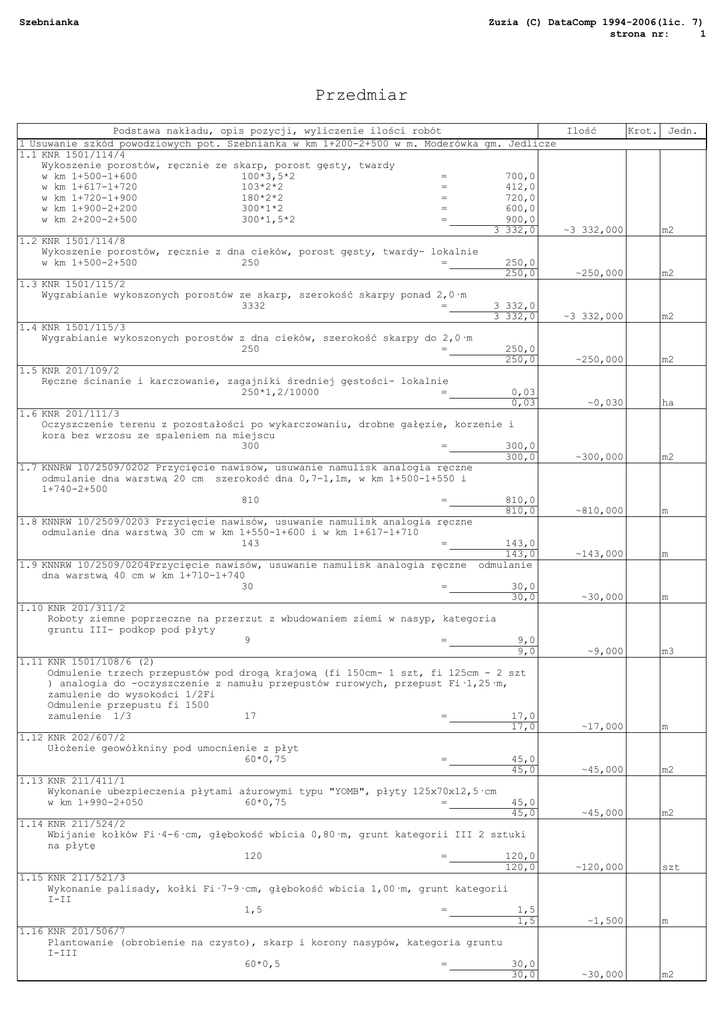 Szebnianka Zuzia (C) DataComp 1994-2006(lic. 7) strona nr: 1 Przedmiar Podstawa nakładu, opis pozycji, wyliczenie ilości robót Ilość Krot. Jedn. 1 Usuwanie szkód powodziowych pot. Szebnianka w km 1+200-2+500 w m. Moderówka gm. Jedlicze 1.1 KNR 1501/114/4 Wykoszenie porostów, ręcznie ze skarp, porost gęsty, twardy w km 1+500-1+600 100*3,5*2 = 700,0 w km 1+617-1+720 103*2*2 = 412,0 w km 1+720-1+900 180*2*2 = 720,0 w km 1+900-2+200 300*1*2 = 600,0 w km 2+200-2+500 300*1,5*2 = 900,0 3 332,0 ~3 332,000 m2 1.2 KNR 1501/114/8 Wykoszenie porostów, ręcznie z dna cieków, porost gęsty, twardy- lokalnie w km 1+500-2+500 250 = 250,0 250,0 ~250,000 m2 1.3 KNR 1501/115/2 Wygrabianie wykoszonych porostów ze skarp, szerokość skarpy ponad 2,0·m 3332 = 3 332,0 3 332,0 ~3 332,000 m2 1.4 KNR 1501/115/3 Wygrabianie wykoszonych porostów z dna cieków, szerokość skarpy do 2,0·m 250 = 250,0 250,0 ~250,000 m2 1.5 KNR 201/109/2 Ręczne ścinanie i karczowanie, zagajniki średniej gęstości- lokalnie 250*1,2/10000 = 0,03 0,03 ~0,030 ha 1.6 KNR 201/111/3 Oczyszczenie terenu z pozostałości po wykarczowaniu, drobne gałęzie, korzenie i kora bez wrzosu ze spaleniem na miejscu 300 = 300,0 300,0 ~300,000 m2 1.7 KNNRW 10/2509/0202 Przycięcie nawisów, usuwanie namulisk analogia ręczne odmulanie dna warstwą 20 cm szerokość dna 0,7-1,1m, w km 1+500-1+550 i 1+740-2+500 810 = 810,0 810,0 ~810,000 m 1.8 KNNRW 10/2509/0203 Przycięcie nawisów, usuwanie namulisk analogia ręczne odmulanie dna warstwą 30 cm w km 1+550-1+600 i w km 1+617-1+710 143 = 143,0 143,0 ~143,000 m 1.9 KNNRW 10/2509/0204Przycięcie nawisów, usuwanie namulisk analogia ręczne odmulanie dna warstwą 40 cm w km 1+710-1+740 30 = 30,0 30,0 ~30,000 m 1.10 KNR 201/311/2 Roboty ziemne poprzeczne na przerzut z wbudowaniem ziemi w nasyp, kategoria gruntu III- podkop pod płyty 9 = 9,0 9,0 ~9,000 m3 1.11 KNR 1501/108/6 (2) Odmulenie trzech przepustów pod drogą krajową (fi 150cm- 1 szt, fi 125cm - 2 szt ) analogia do -oczyszczenie z namułu przepustów rurowych, przepust Fi·1,25·m, zamulenie do wysokości 1/2Fi Odmulenie przepustu fi 1500 zamulenie 1/3 17 = 17,0 17,0 ~17,000 m 1.12 KNR 202/607/2 UłoŜenie geowółkniny pod umocnienie z płyt 60*0,75 = 45,0 45,0 ~45,000 m2 1.13 KNR 211/411/1 Wykonanie ubezpieczenia płytami aŜurowymi typu "YOMB", płyty 125x70x12,5·cm w km 1+990-2+050 60*0,75 = 45,0 45,0 ~45,000 m2 1.14 KNR 211/524/2 Wbijanie kołków Fi·4-6·cm, głębokość wbicia 0,80·m, grunt kategorii III 2 sztuki na płytę 120 = 120,0 120,0 ~120,000 szt 1.15 KNR 211/521/3 Wykonanie palisady, kołki Fi·7-9·cm, głębokość wbicia 1,00·m, grunt kategorii I-II 1,5 = 1,5 1,5 ~1,500 m 1.16 KNR 201/506/7 Plantowanie (obrobienie na czysto), skarp i korony nasypów, kategoria gruntu I-III 60*0,5 = 30,0 30,0 ~30,000 m2