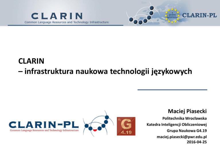 CLARIN-PL CLARIN – infrastruktura naukowa technologii językowych Maciej Piasecki Politechnika Wrocławska Katedra Inteligencji Obliczeniowej Grupa Naukowa G4.19 [email protected] 2016-04-25 Przykład: analiza pojęcia Infrastruktura badawcza Wrocław 2016-04-25 CLARIN-PL Problem: znalezienie w tekstach odwołań do pojęcia książka analiza przypisywanych cech i powiązań z innymi pojęciami Przykłady z sieci: W książce rękopiśmiennej najczęściej występowało ukształtowanie jedno- lub dwukolumnowe. (Wikipedia) W ciągu dziesięciu lat powstały cztery książki, nie jest to więc oszałamiający dorobek. (http://ksiazkioli.blogspot.com/) Jak napisać fascynującą książkę z intrygującą fabułą i odnieść sukces? (sites.google.com/site/pisarstwo/) Za książką kryje się autor. Jego pisanie jest więc zawsze listem do czytelnika. Piszemy zazwyczaj listy do przyjaciół. Książka jest listem autora do przyjaciela. [Jarosław Iwaszkiewicz] (za: http://www.sp21.lublin.pl/biblioteka/cytaty.htm) Przykład: Mapa Literacka Infrastruktura badawcza Wrocław 2016-04-25 CLARIN-PL Literaturoznawstwo – badania geokrytyczne przestrzeni kreowanej w tekstach literackich analiza przestrzeni kulturowych związanych ze środowiskiem elity intelektualnej w okresie powstania utworu Selekcja dzieł literackich oraz tekstów (pamiętników, reportaży, listów) związanych z postacią wybranego twórcy Odtwarzanie mapy mentalnej miejsca, które mają znaczenie dla danego twórcy miejsca, obiekty ważne w ówczesnej epoce literackiej lub na ówczesnej mapie politycznej Wizualizacja miejsc obecnych w powieści, np. ilustracja ścieżek pisarzy tworzenie mapy miejsc fikcyjnych Wsparcie: analizy prowadzone na dużym korpusie tekstów Przykład: droga do realizacji Infrastruktura badawcza Wrocław 2016-04-25 CLARIN-PL Wizualizacja miejsc obecnych w powieści przetwarzanie wstępne: analiza morfologiczna i morfo-syntaktyczna Słowa, lematy, klasy gramatyczne rozpoznanie i klasyfikacja jednostek pozasłownikowych, np. nazw własnych powiązanie wyrażeń językowych z obiektami mapy Np. miejsca nie są często nazwane w tekście nazwą a opisane wyrażeniem złożonym: nazwy, wyrażenia przestrzenne, relacje semantyczne, deskrypcje określone funkcje geolokalizacji mapy skonfigurowanie systemu: instalacja narzędzi, dopasowanie formatów, problemy wydajnościowe, wizualizacja wyników, … Wnioski: problemy użytkownika z użyciem istniejącej technologii językowej, konieczność rozszerzenia tej technologii Przykład: droga do realizacji Infrastruktura badawcza Wrocław 2016-04-25 CLARIN-PL Mapy wyobrażeniowe brak oparcia na istniejącej mapie i geolokalizacji konieczność głębokiej i szczegółowej analizy informacji zawartej w tekście rozpoznawanie niedospecyfikowania i sprzeczności budowa bazy wiedzy o świecie z tekstu zawierającej model mapy wizualizacja mapy na podstawie bazy wiedzy Wnioski: poważne i ciekawe wyzwania należałoby bardzo poprawić pokrycie i dokładność głębokiej analizy składniowo-semantycznej Bariery w zastosowaniu technologii językowej Fizyczna narzędzia i zasoby nie są dostępne w sieci Informacyjna brak opisu narzędzi i zasobów brak katalogów i możliwości łatwego odnalezienia Technologiczna brak standardów, możliwości łączenia elementów technologii brak wspólnej platformy – różnorodność rozwiązań technologicznych brak sprzętu o określonych parametrach Wiedzy wymagane umiejętności programistyczne wymagana wiedza z zakresu inżynierii języka naturalnego Prawna licencje ograniczające dostęp i wykorzystanie szczególnie w odniesieniu do korpusów Infrastruktura badawcza Wrocław 2016-04-25 CLARIN-PL Bariery w zastosowaniu technologii językowej Infrastruktura badawcza Wrocław 2016-04-25 CLARIN-PL Fizyczna dostępność: www.clarin-pl.eu, www.clarin.eu Informacyjna opis: metadane, dokumentacja katalog: Virtual Language Observatory Technologiczna standardy: CMDI, unifikacja standardów dla narzędzi platforma – WebLicht, platforma polska w ramach CTJ CLARIN-PL sprzęt: Centrum Technologii Językowych CLARIN-PL Wiedzy aplikacje badawcze rozwijane wspólnie z użytkownikami CTJ działające jako centrum typu K (szerzenia wiedzy) Prawna otwartość! (ang. Open source, open access) otwarte rozwiązania! trudne w odniesieniu do korpusów, ale model otwartości wyników przetwarzania Finansowa: otwartość kosztuje, a kto płaci? MNiSW? CLARIN Infrastruktura badawcza Wrocław 2016-04-25 CLARIN-PL CLARIN ERIC (Common Language Resources and Technology Infrastructure European Research Infrastructure Consortium) Wspólne zasoby językowe i infrastruktura technologiczna część europejskiej (ESFRI) i polskiej mapy drogowej infrastruktury naukowej Czym jest rozproszona infrastruktura badawcza technologii językowych dla nauk humanistycznych i społecznych kilkadziesiąt centrów technologicznych w 15 krajach działających jako jeden wspólny system jednolity dostęp do zasobów językowych oraz narzędzi i aplikacji badawczych do analizy tekstu i mowy w wielu językach europejskich CLARIN ERIC – Centres Infrastruktura badawcza Wrocław 2016-04-25 CLARIN-PL CLARIN – Członkowie Infrastruktura badawcza Wrocław 2016-04-25 CLARIN-PL 15 członków: Austria Bułgaria Czechy Dania Dutch Language Union Estonia Grecja Holandia Litwa Niemcy Norwegia Polska Portugalia Słowenia Szwecja Włochy Obserwatorzy: Wielka Brytania Podstawowe pojęcia Infrastruktura badawcza Wrocław 2016-04-25 CLARIN-PL Zasoby językowe zbiory danych i bazy danych opisujące język naturalny oraz jego użycie sformalizowany opis wybranych aspektów języka naturalnego Narzędzia językowe programy komputerowe do przetwarzania tekstu i mowy na różnych poziomach analizy języka naturalnego automatyczna analiza struktur językowych, np. analiza składniowa zastosowania użytkowe, np. rozpoznawanie i klasyfikacja nazw własnych Technologia językowa = zasoby + narz