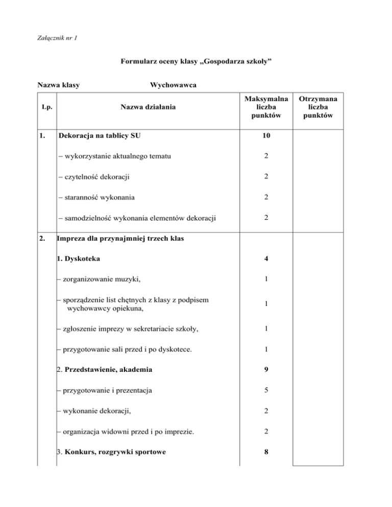 Załącznik nr 1 Formularz oceny klasy ,,Gospodarza szkoły” Nazwa klasy Nazwa działania Lp. 1. 2. Wychowawca Maksymalna liczba punktów Dekoracja na tablicy SU 10 − wykorzystanie aktualnego tematu 2 − czytelność dekoracji 2 − staranność wykonania 2 − samodzielność wykonania elementów dekoracji 2 Impreza dla przynajmniej trzech klas 1. Dyskoteka 4 − zorganizowanie muzyki, 1 − sporządzenie list chętnych z klasy z podpisem wychowawcy opiekuna, 1 − zgłoszenie imprezy w sekretariacie szkoły, 1 − przygotowanie sali przed i po dyskotece. 1 2. Przedstawienie, akademia 9 − przygotowanie i prezentacja 5 − wykonanie dekoracji, 2 − organizacja widowni przed i po imprezie. 2 3. Konkurs, rozgrywki sportowe 8 Otrzymana liczba punktów − przygotowanie i przeprowadzenie, 5 − organizacja widowni przed i po imprezie, 3 − przygotowanie nagród, dyplomów. 1 Konkurs dla wszystkich uczniów chętnych 6 − oryginalność pomysłu, 2 − przygotowanie zasad, regulaminu, 2 − prezentacja wyników, 1 − przygotowanie nagród, dyplomów. 1 4. Reklama imprez, aktualizacja imion dnia 3 5. Dyżury uczniów - ,,Dyżurny porządkowy” 10 6. Łączna liczba punktów 50 3.