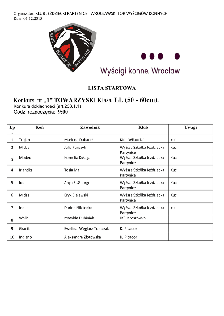 Organizator: KLUB JEŹDZIECKI PARTYNICE I WROCŁAWSKI TOR WYŚCIGÓW KONNYCH Data: 06.12.2015 LISTA STARTOWA Konkurs nr „1” TOWARZYSKI Klasa LL (50 - 60cm), Konkurs dokładności (art.238.1.1) Godz. rozpoczęcia: 9:00 Koń Lp . Zawodnik Klub Uwagi 1 Trojan Marlena Dubarek KKJ "Wiktoria" kuc 2 Midas Julia Pańczyk Kuc Modeo Kornelia Kułaga Wyższa Szkółka Jeździecka Partynice Wyższa Szkółka Jeździecka Partynice 4 Irlandka Tosia Maj Wyższa Szkółka Jeździecka Partynice Kuc 5 Idol Anya St.George Wyższa Szkółka Jeździecka Partynice Kuc 6 Midas Eryk Bielawski Wyższa Szkółka Jeździecka Partynice Kuc 7 Inola Darine Nikitenko kuc Walia Matylda Dubiniak Wyższa Szkółka Jeździecka Partynice JKS Jaroszówka 9 Granit Ewelina Węglarz-Tomczak KJ Picador 10 Indiano Aleksandra Złotowska KJ Picador 3 8 Kuc Organizator: KLUB JEŹDZIECKI PARTYNICE I WROCŁAWSKI TOR WYŚCIGÓW KONNYCH Data: 06.12.2015 Konkurs nr „2” TOWARZYSKI Klasa LL (70 - 80cm), Konkurs dokładności (art.238.1.1) Godz. rozpoczęcia: ok 9:15 Koń Lp . Zawodnik Klub Uwagi 1 Arian Victoria Kołodziejczyk KJ Stajnia Bukowiec kuc 2 Trojan Marlena Dubarek KKJ "Wiktoria" kuc 3 Sawa Oliwia Ziętara bpk 4 Lamia Małgorzata Brodziak KJ Picador 5 Sawa Oliwia Ziętara bpk 6 Granit Ewelina Węglarz-Tomczak KJ Picador 7 Indiano Aleksandra Złotowska KJ Picador 8 Pipi Aleksandra Wiśniewska KJ Picador 9 Sonet Amelia Mokrzycka bpk 10 Dzierlatka Aleksandra Benc bpk 11 Sonet Amelia Mokrzycka bpk 12 Dzierlatka Aleksandra Benc bpk 13 Mondeo Gabrysia Kassan bpk 14 Dallara Agnieszka Szlachta bpk 15 Mondeo Gabrysia Kassan bpk 16 Flavio Magdalena Kolbusz bpk 17 Dallara Agnieszka Szlachta bpk 18 Flavio Magdalena Kolbusz bpk 19 Galea Julia Szychowiak bpk 20 Cajero Zofia Kubacka KJ Bachmat 21 Galea Julia Szychowiak bpk 22 Cajero Zofia Kubacka KJ Bachmat Organizator: KLUB JEŹDZIECKI PARTYNICE I WROCŁAWSKI TOR WYŚCIGÓW KONNYCH Data: 06.12.2015 LISTA STARTOWA Konkurs nr 1 Konkurs LL 80-90 cm Konkurs dokładności (art.238.1.1) Godz. Rozpoczęcia: ok 10:10 Koń Lp . Zawodnik Klub Uwagi Osumi Antonina Urbanek SK Kruszyńscy Arian Victoria Kołodziejczyk KJ Stajnia Bukowiec Osumi Antonina Urbanek SK Kruszyńscy Tamerlan Klaudia Rogoża LKS Stragona Strzegom Genetyka Aleksandra Stępień Tamerlan Klaudia Rogoża Dla Sportu, Dla Zdrowia, Dla Życia LKS Stragona Strzegom 7 Genetyka Aleksandra Stępień Dla Sportu, Dla Zdrowia, Dla Życia 8 Rugia Oliwia Paździora LKS Stragona Strzegom 9 Lamia Małgorzata Brodziak KJ Picador 10 Pipi Aleksandra Wiśniewska KJ Picador 11 Brzoza Klaudia Hałoń KJ Picador 12 Puerto Rico Maja Kluka KJ Picador Panama Andrzej Kisilewicz KJ Picador 14 Puerto Rico Maja Kluka KJ Picador 15 Druhna Ewita Daria Sowa KJ Picador kuc Atlantic Magic Katarzyna Hałoń KJ Picador kuc Druhna Ewita Daria Sowa KJ Picador kuc 1 2 3 4 5 6 13 16 17 kuc kuc kuc Organizator: KLUB JEŹDZIECKI PARTYNICE I WROCŁAWSKI TOR WYŚCIGÓW KONNYCH Data: 06.12.2015 LISTA STARTOWA Konkurs nr 2 Konkurs L 100 cm Konkurs dokładności (art.238.1.1) Godz. rozpoczęcia: ok. 10:50 Koń Lp. Zawodnik Klub 1 Atlantic Magic Katarzyna Hałoń KJ Picador 2 Wróżbita Zuzanna Januszewska KJ Partynice 3 Shadow Maximilian Parkitny bpk 4 Celadine Dominika Luty Sk Kruszyńscy 5 Lionel Beata Biczysko OSK Michalscy Trzebnica 6 Celadine Dominika Luty Sk Kruszyńscy 7 Lionel Beata Biczysko OSK Michalscy Trzebnica Lalka W Ewelina Boruch KS Pegaz Chwałowice Lawina W Agnieszka Borkowska KS Pegaz Chwałowice Lalka W Ewelina Boruch KS Pegaz Chwałowice Quite Lassy Monika Matuszewska KJ Partynice Coral Paulina Latus bpk Quite Lassy Monika Matuszewska KJ Partynice Zawrat Daria Biedrzyńska bpk Brzoza Klaudia Hałoń KJ Picador Zawrat Daria Biedrzyńska bpk 17 Bachus Katarzyna Stąpor LKS Stragona Strzegom 18 Backet Jessica Malin LKS Stragona Strzegom 19 Bachus Katarzyna Stąpor LKS Stragona Strzegom 20 Backet Jessica Malin LKS Stragona Strzegom Panama Andrzej Kisilewicz KJ Picador Roberto R Jacek Gurbiel KJ Picador Csako Paulina Janiszewska KJ Picador 8 9 10 11 12 13 14 15 16 21 22 23 Uwagi kuc kuc 24 Insomnia Dominika Luty Sk Kruszyńscy Pan Grand Ewita Wiesław Nowak bpk Insomnia Dominika Luty Sk Kruszyńscy Etoile Jan Żurowski bpk 28 Sharon Aron Bartłomiej Rogaczewski KJ Dworzysko 29 Cuma Julita Popławska LKJ Platan 30 Pirat Olena Frąckowiak KJ Platan 31 Bartek Izabella Gawęcka KJ Platan 32 Pirat Olena Frąckowiak KJ Platan 33 Ucayali Kuba Czarnota KJ Platan 34 Gea-S Roksana Fortuniak KJ Jaroszówka 35 Sansierra Nina Jarosz KJ Platan 36 Gea-S Roksana Fortuniak KJ Jaroszówka 37 Dakar B Matylda Dubiniak JKS Jaroszówka 38 Poemat Kamila Krycz bpk 40 Cuma Julita Popławska LKJ Platan 41 Poemat Kamila Krycz bpk 42 Dark Julia Szut bpk Szafirka Agnieszka Cwynar JKS Szafir 44 Chacco Perfect S Marta Mszyca KJ Partynice 45 Rodrigo Marga Rudno- Rudzińska KJ Ślęża 46 Cor De Couleur Wojciech Pażucha KJ Pegaz Chwałowice 47 Atilan Karolina Kaczor bpk 48 Quidam de Henry Andrea Kreutzer KJ Stajnia Bukowiec 49 Ironia Zuzanna Januszewska KJ Partynice 50 Caspian Monika Matuszewska KJ Partynice 51 Aquitana Jagoda Wszędybył KJ Bachmat 52 Totmes Katarzyna Stąpor LKS Stragona Strzegom 53 Hochstyl Kamila Budzisz bpk 54 Totmes Katarzyna Stąpor LKS Stragona Strzegom 55 Sopran Maximilian Parkitny bpk 25 26 27 43 56 Clintella Dominika Luty Sk Kruszyńscy Organizator: KLUB JEŹDZIECKI PARTYNICE I WROCŁAWSKI TOR WYŚCIGÓW KONNYCH Data: 06.12.2015 LISTA STARTOWA Konkurs nr 3 Konkurs L 100 cm, PRZEBIERAŃCÓW Konkurs dokładności (art.238.1.1) Godz. rozpoczęcia: ok. 13:00 Koń Lp. 1 Zawodnik Klub Szafirka Agnieszka Cwynar JKS Szafir Hochstyl Kamila Budzisz bpk Csako Paulina Janiszewska KJ Picador 4 Wena Julia Bronś bpk 5 Aquitana Jagoda Wszędybył KJ Bachmat 6 Wena Julia Bronś bpk 7 Likura Pola Krzysiak bpk 8 Donja Lidia Bieniek bpk 9 Juste Milieu Sandra Pawlak bpk Bianca de la Cour Agnieszka Cwynar JKS Szafir 2 3 10 Uwagi Organizator: KLUB JEŹDZIECKI PARTYNICE I WROCŁAWSK