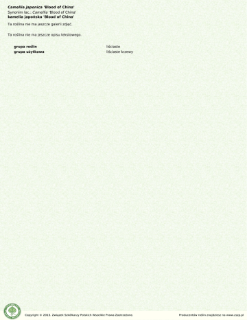 Camellia japonica 'Blood of China' Synonim lac.: Camellia 'Blood of China' kamelia japońska 'Blood of China' Ta roślina nie ma jeszcze galerii zdjęć. Ta roślina nie ma jeszcze opisu tekstowego. grupa roślin liściaste grupa użytkowa liściaste krzewy Copyright © 2013. Związek Szkółkarzy Polskich Wszelkie Prawa Zastrzeżone. Producentów roślin znajdziesz na www.zszp.pl