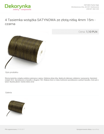 INFOBIS Rafał Głąb Mickiewicza 42a, 43-331 Dankowice +48 601 662 442 4 Tasiemka wstążka SATYNOWA ze złotą nitką 4mm 15m czarna Cena: 1,10 PLN Opis produktu Śliczna tasiemka, wstążka ozdobna wykonana z satyny. Zdobiona złotą nitką. Idealna do dekoracji, zdobienia i wyszywania. Szerokość wstążki 4mm. Sprzedawana w kawałku o długości 15m. Większe ilości w miarę możliwości sprzedawane w jednym kawałku. Kolor jak w tytule. Wysoka jakość i bardzo dobra cena! Galeria Plik wygenerowano: 07-03-2017 Powered by TCPDF (www.tcpdf.org) Oprogramowanie sklepu: AptusShop
