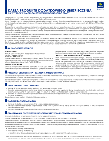 KARTA PRODUKTU DODATKOWEGO UBEZPIECZENIA NA WYPADEK TRWAŁEJ I CAŁKOWITEJ NIEZDOLNOŚCI DO PRACY Niniejsza Karta Produktu została sporządzona w celu wdrożenia wymogów Rekomendacji U oraz Wytycznych dotyczących dystrybucji ubezpieczeń, wydanych przez Komisję Nadzoru Finansowego. Karta Produktu ma na celu przybliżenie najważniejszych cech umowy Dodatkowego Ubezpieczenia na wypadek Trwałej i całkowitej niezdolności do pracy i nie stanowi integralnej części Umowy ubezpieczenia ani oferty w rozumieniu art. 66 i art. 71 Kodeksu cywilnego. Szczegółowe warunki, na podstawie jakich następuje zawarcie Umowy dodatkowej, w tym wszystkie prawa i obowiązki Ubezpieczającego i Ubezpieczonego, określone są w Ogólnych Warunkach Dodatkowego Ubezpieczenia na wypadek Trwałej i całkowitej niezdolności do pracy. Decyzja o zawarciu Umowy ubezpieczenia powinna zostać podjęta po wcześniejszym, szczegółowym zapoznaniu się z tym dokumentem. Umowa dodatkowa zawierana jest jako rozszerzenie zakresu umowy Indywidualnego Ubezpieczenia na Życie Acti OCHRONA i może zostać zawarta wyłącznie jako jej uzupełnienie. Z uwagi na fakt, iż Umowa dodatkowa może być zawarta wyłącznie jako uzupełnienie Umowy podstawowej, informacje zawarte w niniejszej Karcie Produktu oraz w Ogólnych Warunkach Dodatkowego Ubezpieczenia na wypadek Trwałej i całkowitej niezdolności do pracy należy analizować łącznie z informacjami zawartymi w Ogólnych Warunkach Indywidualnego Ubezpieczenia na Życie Acti OCHRONA oraz Karcie Produktu dotyczącej Indywidualnego Ubezpieczenia na Życie Acti OCHRONA. NAJWAŻNIEJSZE DEFINICJE TOWARZYSTWO MACIF Życie Towarzystwo Ubezpieczeń Wzajemnych. UMOWA PODSTAWOWA Umowa ubezpieczenia zawierana pomiędzy MACIF Życie TUW, a Ubezpieczającym, na podstawie Ogólnych Warunków Indywidualnego Ubezpieczenia na Życie Acti OCHRONA. UMOWA DODATKOWA Umowa ubezpieczenia zawarta pomiędzy MACIF Życie TUW, a Ubezpieczającym, na podstawie niniejszych Ogólnych Warunków Dodatkowego Ubezpieczenia na wypadek śmierci lub Trwałego i całkowitego inwalidztwa w wyniku Nieszczęśliwego wypadku. TRWAŁA I CAŁKOWITA NIEZDOLNOŚĆ DO PRACY Stan niesprawności Ubezpieczonego, trwający nieprzerwanie przez 12 miesięcy, uniemożliwiający mu świadczenie jakiejkolwiek pracy na podstawie stosunku pracy, umowy cywilnoprawnej, wykonywania wolnego zawodu lub prowadzenia działalności gospodarczej, potwierdzony orzeczeniem lekarza orzecznika lub komisji lekarskiej oraz decyzją odpowiedniego organu rentowego o niezdolności do pracy orzeczonej na okres dłuższy niż 5 lat. PRZEDMIOT UBEZPIECZENIA I ZDARZENIA OBJĘTE OCHRONĄ Dodatkowe Ubezpieczenie na wypadek Trwałej i całkowitej niezdolności do pracy to produkt ubezpieczeniowy, w ramach którego oferowana jest ochrona zdrowia Ubezpieczonego. Zakres ubezpieczenia obejmuje wystąpienie w okresie trwania ochrony ubezpieczeniowej Trwałej i całkowitej niezdolności Ubezpieczonego do pracy, na skutek przyczyny zaistniałej w czasie trwania ochrony ubezpieczeniowej. SUMA UBEZPIECZENIA I SKŁADKA • Wysokość Sumy ubezpieczenia określona jest w Umowie ubezpieczenia. • Składka ubezpieczeniowa za Umowę dodatkową zależy od wieku, wysokości Sumy ubezpieczenia, częstotliwości płatności składki, oceny ryzyka ubezpieczeniowego. Towarzystwo ustala wysokość składki na Okres ubezpieczenia. • Składka za Umowę dodatkową doliczana jest do składki za Umowę podstawową i płatna jest z tą samą częstotliwością i w tych samych terminach. Zobowiązanym do zapłaty Składki jest Ubezpieczający. WARUNKI ZAWARCIA UMOWY • Umowa dodatkowa zawierana jest na wniosek Ubezpieczającego. • Ubezpieczeniem może zostać objęta osoba, której wiek wynosi nie mniej niż 18 lat i nie więcej niż 54 lata w roku zawierania Umowy dodatkowej. • Umowa dodatkowa zawierana jest łącznie z Umową podstawową. CZAS TRWANIA ODPOWIEDZIALNOŚCI TOWARZYSTWA I ROZWIĄZANIE UMOWY Umowa dodatkowa zawierana jest łącznie z Umową podstawową. Umowa dodatkowa zawierana jest na taki sam okres, na jaki zawarta jest Umowa podstawowa. Odpowiedzialność Towarzystwa, z tytułu Umowy ubezpieczenia, rozpoczyna się od dnia wskazanego w Warunkach szczególnych, jednakże nie wcześniej niż od dnia następnego po opłaceniu Składki lub pierwszej raty Składki, należnej z tytułu Umowy ubezpieczenia. Wygaśnięcie odpowiedzialności Towarzystwa wobec Ubezpieczonego następuje w przypadkach określonych w Umowie podstawowej oraz w przypadku: • rozwiązania Umowy podstawowej, • rozwiązania Umowy dodatkowej, • w ostatnim dniu Okresu ubezpieczenia, przypadającym po 65. urodzinach Ubezpieczonego, MACIF Życie Towarzystwo Ubezpieczeń Wzajemnych — ul. Bema 89, 01-233 Warszawa, tel. + 48 22 535 02 00, faks + 48 22 535 02 01, www.macif.pl Sąd Rejonowy dla m. st. Warszawy XII Wydział Krajowego Rejestru Sądowego KRS 0000 1907 48, NIP 107-000-05-43, Kapitał zakładowy: 39 100 000 zł, Kapitał zakładowy wpłacony: 39 100 000 zł • wypłaty Świadczenia z tytułu Umowy podstawowej, • wypłaty Świadczenia z tytułu Umowy dodatkowej. Rozwiązanie Umowy dodatkowej nie skutkuje rozwiązaniem Umowy podstawowej. ODSTĄPIENIE OD UMOWY I WYPOWIEDZENIE UMOWY Ubezpieczający może odstąpić od Umowy ubezpieczenia w terminie 30 dni od dnia jej zawarcia, a jeżeli Ubezpieczający jest przedsiębiorcą termin ten wynosi 7 dni. Oświadczenie o odstąpieniu musi być sporządzone na piśmie. Oświadczenie o odstąpieniu staje się skuteczne z chwilą doręczenia Towarzystwu pisemnego oświadczenia Ubezpieczającego. W przypadku odstąpienia od Umowy ubezpieczenia Towarzystwo zwraca Ubezpieczającemu wpłaconą składkę ubezpieczeniową. Odstąpienie od Umowy dodatkowej nie stanowi odstąpienia od Umowy podstawowej. Ubezpieczający może wypowiedzieć Umowę ubezpieczenia w każdym czasie z zachowaniem dwumiesięcznego okresu wypowiedzenia. Wypowiedzenie wymag