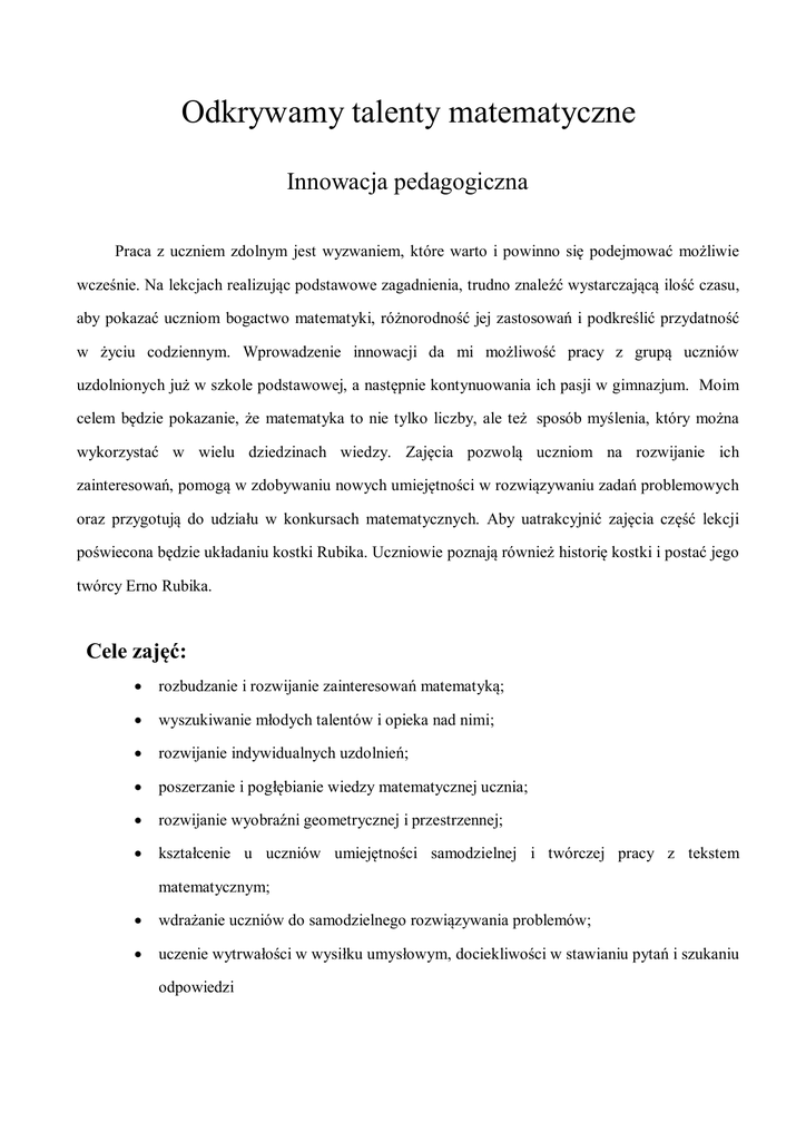 Odkrywamy talenty matematyczne Innowacja pedagogiczna Praca z uczniem zdolnym jest wyzwaniem, które warto i powinno się podejmować możliwie wcześnie. Na lekcjach realizując podstawowe zagadnienia, trudno znaleźć wystarczającą ilość czasu, aby pokazać uczniom bogactwo matematyki, różnorodność jej zastosowań i podkreślić przydatność w życiu codziennym. Wprowadzenie innowacji da mi możliwość pracy z grupą uczniów uzdolnionych już w szkole podstawowej, a następnie kontynuowania ich pasji w gimnazjum. Moim celem będzie pokazanie, że matematyka to nie tylko liczby, ale też sposób myślenia, który można wykorzystać w wielu dziedzinach wiedzy. Zajęcia pozwolą uczniom na rozwijanie ich zainteresowań, pomogą w zdobywaniu nowych umiejętności w rozwiązywaniu zadań problemowych oraz przygotują do udziału w konkursach matematycznych. Aby uatrakcyjnić zajęcia część lekcji poświecona będzie układaniu kostki Rubika. Uczniowie poznają również historię kostki i postać jego twórcy Erno Rubika. Cele zajęć: rozbudzanie i rozwijanie zainteresowań matematyką; wyszukiwanie młodych talentów i opieka nad nimi; rozwijanie indywidualnych uzdolnień; poszerzanie i pogłębianie wiedzy matematycznej ucznia; rozwijanie wyobraźni geometrycznej i przestrzennej; kształcenie u uczniów umiejętności samodzielnej i twórczej pracy z tekstem matematycznym; wdrażanie uczniów do samodzielnego rozwiązywania problemów; uczenie wytrwałości w wysiłku umysłowym, dociekliwości w stawianiu pytań i szukaniu odpowiedzi doskonalenie sprawności rachunkowej; posługiwanie się własnościami liczb i działań matematycznych; przygotowanie uczniów do konkursów matematycznych zewnętrznych, takich np. jak: „Kangur Matematyczny” czy Wojewódzki Konkurs Matematyczny; rozwijanie pamięci oraz kształtowanie logicznego myślenia i prawidłowego wnioskowania; umożliwianie uczniom sprawdzania i uzasadniania słuszności wybranej metody prowadzącej do prawidłowego rozwiązania zadania; wykorzystywanie inwencji własnej uczniów i zachęcanie do poszukiwania różnych sposobów rozwiązywania tego samego zadania. Metody i formy pracy: pogadanka, dyskusja, praca z tekstem, burza mózgów, gry dydaktyczne, krzyżówki, zagadki liczbowe, zapałczane konkursy matematyczne układanie kostki Rubika 3x3 i 2x2 Plan działań i treści nauczania: Program zawiera treści, które pozwolą na utrwalenie i pogłębienie wiedzy zdobytej w szkole, a także na dążenie uczniów do samodzielnego i logicznego myślenia. Tematyka została podzielona na kilka działów i realizowana jest w zależności od potrzeb i oczekiwań uczniów. W miarę możliwości niektóre zagadnienia można wykorzystać na lekcjach. 1. Z dziejów matematyki: 1. Wybitni matematycy 2. Systemy liczenia 2. Kostka Rubika 1. Historia kostki 2. Życiorys twórcy 3. Algorytmy układania kostki 3. Liczby naturalne 1. Działania na liczbach naturalnych 2. Wstawianie znaków, uzupełnianie cyfr 3. Znajdź liczby 4. Zadania tekstowe z arytmetyki 5. Podzielność liczb 6. Liczby pierwsze, rozkład liczby na czynniki pierwsze 7. Działania na liczbach naturalnych na różnym poziomie 4. Liczby wymierne 1. Ułamki zwykłe a dziesiętne 2. Zadania tekstowe 3. Matematyczny wiatr 4. Zamiana jednostek 5. Prędkość, droga, czas 6. Kalendarz 7. Zadania o ważeniu 8. Zadania z zastosowaniem, procentów i promili 5. Logika naturalna 1. Pułapki logiki 2. Zadania z zapałkami 3. Zadania z klockami domina 4. Zadania o Mikołajach 5. Zadania konkursowe 6. Geometria 1. Ćwiczymy spostrzegawczość (np. ile widzisz trójkątów?) 2. Tangramowe figury 3. Geometryczne problemy 4. Wskazówki zegara 5. Wielokąty, obliczanie pól figur 6. Proste, płaszczyzny, symetrie 7. Figury przestrzenne, problemy, objętość, pole powierzchni IV-V 7. Elementy kombinatoryki 1. Ile jest liczb ... 2. Na ile sposobów... 3. Monety i kostki 4. Rozmieszczanie liczb 8. Łamigłówki 1. Rebusy 2. Zagadki 3. Krzyżówki 8. Zadania różne 1. Zadania konkursowe „Kangur”, „Alfik”, Wojewódzki Konkurs Matematyczny Ewaluacja: 1. Analiza wyników konkursów matematycznych. 2. Obserwacja pracy uczniów podczas zajęć.