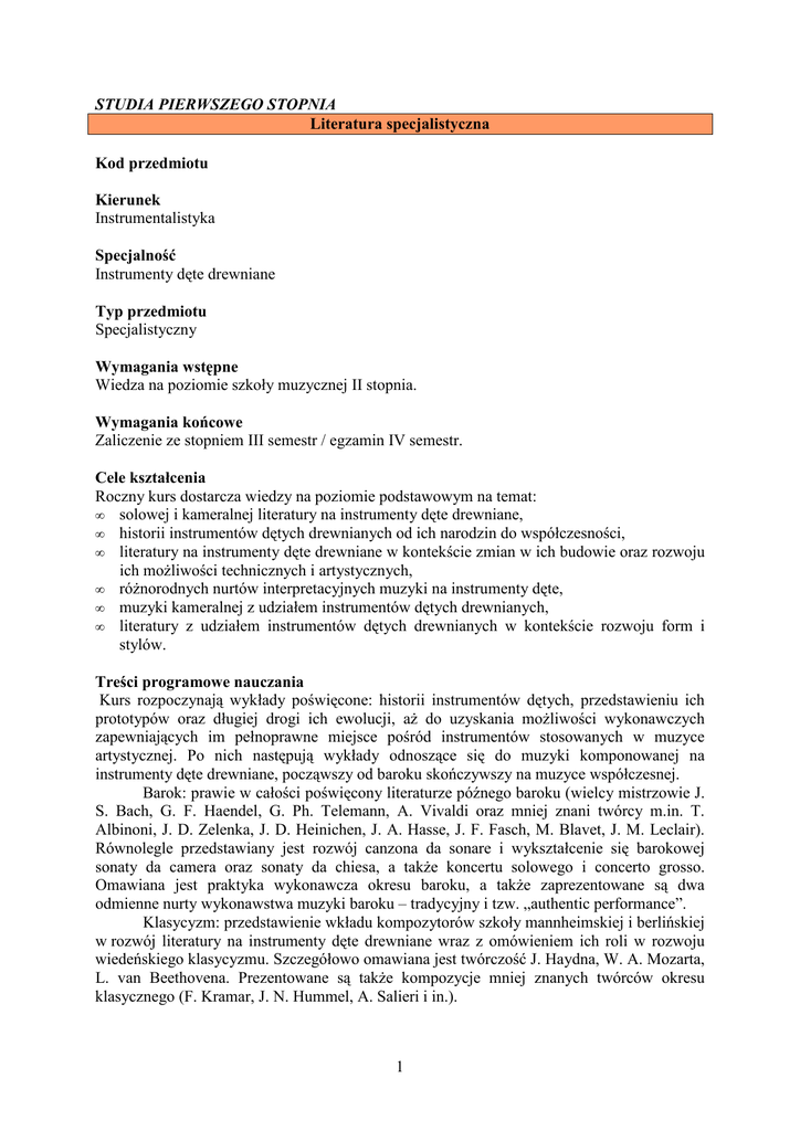 STUDIA PIERWSZEGO STOPNIA Literatura specjalistyczna Kod przedmiotu Kierunek Instrumentalistyka Specjalność Instrumenty dęte drewniane Typ przedmiotu Specjalistyczny Wymagania wstępne Wiedza na poziomie szkoły muzycznej II stopnia. Wymagania końcowe Zaliczenie ze stopniem III semestr / egzamin IV semestr. Cele kształcenia Roczny kurs dostarcza wiedzy na poziomie podstawowym na temat: • solowej i kameralnej literatury na instrumenty dęte drewniane, • historii instrumentów dętych drewnianych od ich narodzin do współczesności, • literatury na instrumenty dęte drewniane w kontekście zmian w ich budowie oraz rozwoju ich możliwości technicznych i artystycznych, • różnorodnych nurtów interpretacyjnych muzyki na instrumenty dęte, • muzyki kameralnej z udziałem instrumentów dętych drewnianych, • literatury z udziałem instrumentów dętych drewnianych w kontekście rozwoju form i stylów. Treści programowe nauczania Kurs rozpoczynają wykłady poświęcone: historii instrumentów dętych, przedstawieniu ich prototypów oraz długiej drogi ich ewolucji, aż do uzyskania możliwości wykonawczych zapewniających im pełnoprawne miejsce pośród instrumentów stosowanych w muzyce artystycznej. Po nich następują wykłady odnoszące się do muzyki komponowanej na instrumenty dęte drewniane, począwszy od baroku skończywszy na muzyce współczesnej. Barok: prawie w całości poświęcony literaturze późnego baroku (wielcy mistrzowie J. S. Bach, G. F. Haendel, G. Ph. Telemann, A. Vivaldi oraz mniej znani twórcy m.in. T. Albinoni, J. D. Zelenka, J. D. Heinichen, J. A. Hasse, J. F. Fasch, M. Blavet, J. M. Leclair). Równolegle przedstawiany jest rozwój canzona da sonare i wykształcenie się barokowej sonaty da camera oraz sonaty da chiesa, a także koncertu solowego i concerto grosso. Omawiana jest praktyka wykonawcza okresu baroku, a także zaprezentowane są dwa odmienne nurty wykonawstwa muzyki baroku – tradycyjny i tzw. „authentic performance”. Klasycyzm: przedstawienie wkładu kompozytorów szkoły mannheimskiej i berlińskiej w rozwój literatury na instrumenty dęte drewniane wraz z omówieniem ich roli w rozwoju wiedeńskiego klasycyzmu. Szczegółowo omawiana jest twórczość J. Haydna, W. A. Mozarta, L. van Beethovena. Prezentowane są także kompozycje mniej znanych twórców okresu klasycznego (F. Kramar, J. N. Hummel, A. Salieri i in.). 1 Romantyzm: omawiane utwory na instrumenty dęte tego okresu są dziełami C. M. Webera, F. Mendelssohna-Bartholdy, R. Schumanna, L. Spohra i J, Brahmsa. Poruszone zostają również zagadnienia związane z rosnącą rolą instrumentów dętych w orkiestrze, oraz udział wirtuozów w komponowaniu utworów na instrumenty dęte drewniane (P. Taffanel, C. Ciardi, A. Pasculli). XX wiek: ogólne przedstawienie zróżnicowanej stylistycznie twórczości na instrumenty dęte. Efekty kształcenia (uczenia się) po ukończeniu przedmiotu - w zakresie wiedzy • Orientuje się w piśmiennictwie dotyczącym kierunku studiów, zarówno w aspekcie historii danej dziedziny lub dyscypliny, jak też jej obecnej kondycji, dotyczy to także Internetu (K1_W05). • Posiada znajomość podstawowego repertuaru instrumentów dętych drewnianych (K1_W02). • Posiada wiedzę umożliwiającą docieranie do niezbędnych informacji (książki, nagrania, materiały nutowe, Internet), ich analizowanie, i interpretowanie we właściwy sposób (K1_W04). • Rozpoznaje i definiuje wzajemne relacje zachodzące pomiędzy teoretycznymi i praktycznymi aspektami studiowania (K1_W07). Metody nauczania Wykład, zajęcia grupowe Nakład pracy studenta potrzebny do osiągnięcia efektów uczenia się ROK SEMESTR Punkty ECTS Ilość godzin w semestrze Rodzaj zaliczenia LEGENDA I 1 II 2 III 3 4 1 1 15 15 zs egz 5 6 zal – zaliczony; zs – zaliczenie ze stopniem; egz – egzamin; ed – egzamin dyplomowy Kryteria oceny W semestrze I ocena zostaje wystawiona na podstawie omówienia przerobionego materiału. W semestrze II w ramach egzaminu odbywa się rozpoznawanie słuchowe podanych utworów oraz omówienie ich w zakresie przerobionego materiału. Ocenie podlega zasób wiedzy studenta z zakresu przedmiotu. Literatura (piśmiennictwo) Gwizdalanka D., Przewodnik po muzyce kameralne,j PWM Kraków 1998. Chylińska T., Haraschin St., Jabłoński M., Przewodnik po muzyce koncertowej PWM, Kraków 2003. Kowalska M., ABC historii muzyki, Musica Iagiellonica, Kraków 2001. Gwizdalanka D., Historia muzyki 1-4, PWM, Kraków 2005. 2 Język wykładowy Polski Imię i nazwisko wykładowcy kw. II st. Janusz Kopczyński, prof. AM 3
