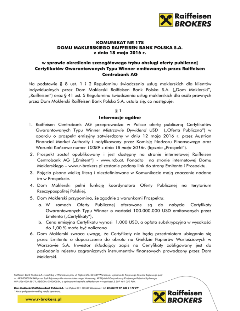 KOMUNIKAT NR 178 DOMU MAKLERSKIEGO RAIFFEISEN BANK POLSKA S.A. z dnia 18 maja 2016 r. w sprawie określenia szczegółowego trybu obsługi oferty publicznej Certyfikatów Gwarantowanych Typu Winner emitowanych przez Raiffeisen Centrobank AG Na podstawie § 8 ust. 1 i 2 Regulaminu świadczenia usług maklerskich dla klientów indywidualnych przez Dom Maklerski Raiffeisen Bank Polska S.A. („Dom Maklerski”, „Raiffeisen”) oraz § 41 ust. 5 Regulaminu świadczenia usług maklerskich dla osób prawnych przez Dom Maklerski Raiffeisen Bank Polska S.A. ustala się, co następuje: §1 Informacje ogólne 1. Raiffeisen Centrobank AG przeprowadza w Polsce ofertę publiczną Certyfikatów Gwarantowanych Typu Winner Mistrzowie Dywidend USD („Oferta Publiczna”) w oparciu o prospekt emisyjny zatwierdzony w dniu 12 maja 2016 r. przez Austrian Financial Market Authority i notyfikowany przez Komisję Nadzoru Finansowego oraz Warunki Końcowe numer 10089 z dnia 18 maja 2016r. (łącznie „Prospekt”). 2. Prospekt został opublikowany i jest dostępny na stronie internetowej Raiffeisen Centrobank AG („Emitent”) - www.rcb.at. Ponadto na stronie internetowej Domu Maklerskiego – www.r-brokers.pl zostanie podany link do strony Emitenta i Prospektu. 3. Pojęcia pisane wielką literą i niezdefiniowane w Komunikacie mają znaczenie nadane im w Prospekcie. 4. Dom Maklerski pełni funkcję Rzeczypospolitej Polskiej. koordynatora Oferty Publicznej na terytorium 5. Dom Maklerski przypomina, że zgodnie z warunkami Prospektu: a. W ramach Oferty Publicznej oferowane są do nabycia Certyfikaty Gwarantowanych Typu Winner o wartości 100.000.000 USD emitowanych przez Emitenta („Certyfikaty”), b. Cena emisyjna Certyfikatu wynosi 1.000 USD, a opłata subskrypcyjna w wysokości do 1,00 % może być naliczana. 6. Dom Maklerski zwraca uwagę, że Certyfikaty nie będą przedmiotem ubiegania się przez Emitenta o dopuszczenie do obrotu na Giełdzie Papierów Wartościowych w Warszawie S.A. Inwestor składający zapis na Certyfikaty zobligowany jest do posiadania rejestru zagranicznych instrumentów finansowych prowadzony przez Dom Maklerski. Raiffeisen Bank Polska S.A. z siedzibą w Warszawie przy ul. Pięknej 20, 00-549 Warszawa, wpisana do Krajowego Rejestru Sądowego pod nr. KRS 0000014540 przez Sąd Rejonowy dla miasta stołecznego Warszawy, XII Wydział Gospodarczy Krajowego Rejestru Sądowego, NIP: 526-020-58-71, REGON: 010000854, o opłaconym kapitale zakładowym w wysokości 2 207 461 050 PLN. Dom Maklerski Raiffeisen Bank Polska S.A. • ul. Piękna 20 • 00-549 Warszawa • tel. 22 548 97 77, 801 11 77 77* * Koszt połączenia według taryfy operatora. 7. Zgodnie z Rozdziałem Prospektu - Informacje Podstawowe (General Information) Punkt 15 Dom Maklerski jest upoważniony do określenia dodatkowych warunków przyjmowania zapisów na Certyfikaty. §2 Szczegółowe Informacje na temat warunków przyjmowania zapisów przez Dom Maklerski 1. Podmiotami uprawnionymi do udziału w Ofercie Publicznej są osoby fizyczne oraz osoby prawne i jednostki nieposiadające osobowości prawnej, zarówno rezydenci, jak i nierezydenci w rozumieniu przepisów ustawy z dnia 27 lipca 2002 r. - Prawo dewizowe (Dz. U. z 2002 r., Nr 141, poz. 1179, z późn. zm.) 2. Formularze zapisu udostępnione zostaną przez Dom Maklerski w języku polskim. 3. Jeden zapis musi obejmować co najmniej 1 Certyfikat. 4. Zapis jest nieodwołalny i bezwarunkowy. 5. Zapisy na oferowane Certyfikaty przyjmowane będą za pośrednictwem wyznaczonych Oddziałów Raiffeisen Bank Polska S.A. („Oddział”), w dniach i godzinach ich otwarcia, w okresie trwania Oferty Publicznej, z zastrzeżeniem, że w wybranych Oddziałach godziny przyjmowania zapisów mogą różnić się od godzin otwarcia Oddziałów. W ostatnim dniu przyjmowania zapisów, Zapisy będą przyjmowane do godziny 17.00 (CET). Aktualna lista Oddziałów przyjmujących zapisy jest dostępna na stronie internetowej Domu Maklerskiego www.r-brokers.pl. Lista zawiera godziny w których będą przyjmowane zapisy na Certyfikaty. 6. Składając zapis w Oddziale inwestor okazuje dokument tożsamości (dowód osobisty lub paszport) , a w przypadku inwestorów niebędących osobami fizycznymi również dokument potwierdzający umocowanie osoby składającej zapis do reprezentowania inwestora i podaje wszystkie dane niezbędne do wypełnienia formularza zapisu. 7. Osoba fizyczna, która zawarła z Domem Maklerskim umowę o świadczenie usług maklerskich lub aneks do umowy o świadczenie usług maklerskich, w zakresie przyjmowania zleceń i dyspozycji przekazywanych Domowi Maklerskiemu za pomocą telefonu może złożyć dyspozycję złożenia zapisu telefonicznie, dzwoniąc pod numery telefonów podane w systemie transakcyjnym R Broker lub do Centrum Telefonicznego. Identyfikacja inwestora składającego dyspozycję telefoniczną odbywa się zgodnie z warunkami określonymi w ww. aneksie oraz Regulaminie świadczenia usług maklerskich przez Dom Maklerski Raiffeisen Bank Polska S.A. Składając dyspozycję telefonicznie inwestor zobowiązany jest udzielić Domowi Maklerskiemu pełnomocnictwa do wystawienia zapisu na podstawie dyspozycji telefonicznej. Dyspozycje telefoniczne będą przyjmowane od poniedziałku do piątku, z wyłączeniem dni ustawowo wolnych od pracy, w godzinach 8:00 – 17:00. W ostatnim dniu przyjmowania zapisów, Zapisy będą przyjmowane do godziny 17.00 (CET). Raiffeisen Bank Polska S.A. z siedzibą w Warszawie przy ul. Pięknej 20, 00-549 Warszawa, wpisana do Krajowego Rejestru Sądowego pod nr. KRS 0000014540 przez Sąd Rejonowy dla miasta stołecznego Warszawy, XII Wydział Gospodarczy Krajowego Rejestru Sądowego, NIP: 526-020-58-71, REGON: 010000854, o opłaconym kapitale zakładowym w wysokości 2 207 461 050 PLN. Dom Maklerski Raiffeisen Bank Polska S.A. • ul. Piękna 20 • 00-549 Warszawa • tel. 22 548 97 77, 801 11 77 77* * Koszt połączenia według tar