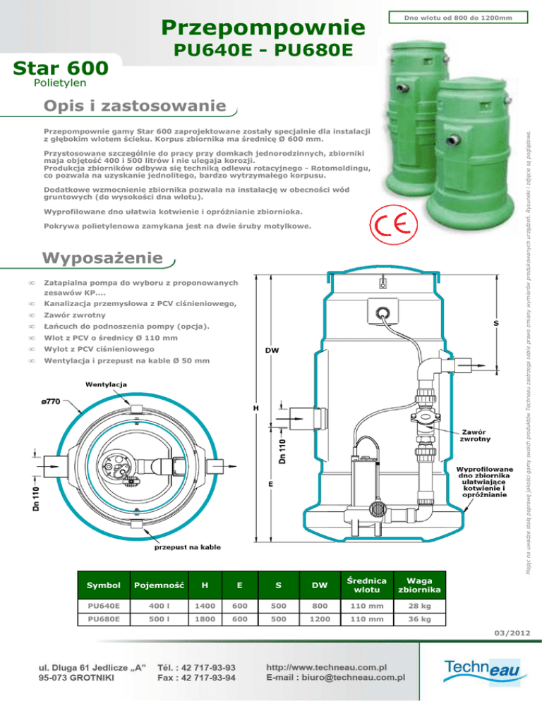 Przepompownie Dno wlotu od 800 do 1200mm PU640E - PU680E Star 600 Polietylen Opis i zastosowanie Mając na uwadze stałą poprawę jakości gamy swoich produktów Techneau zastrzega sobie prawo zmiany wymiarów produkowanych urządzeń. Rysuneki i zdjęcie są poglądowe. Przepompownie gamy Star 600 zaprojektowane zostały specjalnie dla instalacji z głębokim wlotem ścieku. Korpus zbiornika ma średnicę Ø 600 mm. Przystosowane szczególnie do pracy przy domkach jednorodzinnych, zbiorniki maja objętość 400 i 500 litrów i nie ulegaja korozji. Produkcja zbiorników odbywa się techniką odlewu rotacyjnego - Rotomoldingu, co pozwala na uzyskanie jednolitego, bardzo wytrzymałego korpusu. Dodatkowe wzmocnienie zbiornika pozwala na instalację w obecności wód gruntowych (do wysokości dna wlotu). Wyprofilowane dno ułatwia kotwienie i opróżnianie zbiornioka. Pokrywa polietylenowa zamykana jest na dwie śruby motylkowe. Wyposażenie • Zatapialna pompa do wyboru z proponowanych zesawów KP.... • • • • • • Kanalizacja przemysłowa z PCV ciśnieniowego, Zawór zwrotny Łańcuch do podnoszenia pompy (opcja). Wlot z PCV o średnicy Ø 110 mm Wylot z PCV ciśnieniowego Wentylacja i przepust na kable Ø 50 mm Symbol Pojemność H E S DW Średnica wlotu Waga zbiornika PU640E 400 l 1400 600 500 800 110 mm 28 kg PU680E 500 l 1800 600 500 1200 110 mm 36 kg 03/2012 Mając na uwadze stałą poprawę jakości gamy swoich produktów Techneau zastrzega sobie prawo zmiany wymiarów produkowanych urządzeń. Rysuneki i zdjęcie są poglądowe. Przepompownie PU640E - PU680E Star 600 Polietylen Instalacja 03/2012 Star 600 Polietylen Mając na uwadze stałą poprawę jakości gamy swoich produktów Techneau zastrzega sobie prawo zmiany wymiarów produkowanych urządzeń. Rysuneki i zdjęcie są poglądowe. Przepompownie PU640E - PU680E Zestawy pomp 03/2012 Star 600 Polietylen Mając na uwadze stałą poprawę jakości gamy swoich produktów Techneau zastrzega sobie prawo zmiany wymiarów produkowanych urządzeń. Rysuneki i zdjęcie są poglądowe. Przepompownie PU640E - PU680E Zestawy pomp 03/2012