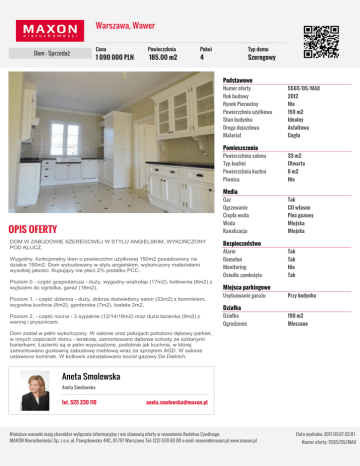 Warszawa, Wawer Dom - Sprzedaż Cena 1 090 000 PLN Powierzchnia 185.00 m2 Pokoi Typ domu 4 Szeregowy Podstawowe Numer oferty 5565/DS/MAX Rok budowy 2012 Rynek Pierwotny Nie Powierzchnia użytkowa 150 m2 Stan budynku Idealny Droga dojazdowa Asfaltowa Materiał Cegła Pomieszczenia Powierzchnia salonu 33 m2 Typ kuchni Otwarta Powierzchnia kuchni 8 m2 Piwnica Nie Media OPIS OFERTY Gaz Tak Ogrzewanie CO własne Ciepła woda Piec gazowy Woda Miejska Kanalizacja Miejska DOM W ZABUDOWIE SZEREGOWEJ W STYLU ANGIELSKIM, WYKOŃCZONY POD KLUCZ. Bezpieczeństwo Alarm Tak Wygodny, funkcjonalny dom o powierzchni użytkowej 150m2 posadowiony na działce 190m2. Dom wybudowany w stylu angielskim, wykończony materiałami wysokiej jakości. Kupujący nie płaci 2% podatku PCC. Domofon Tak Monitoring Nie Osiedle zamknięte Tak Poziom 0 - część gospodarcza - duży, wygodny wiatrołap (17m2), kotłownia (6m2) z wyjściem do ogródka, garaż (18m2), Poziom 1. - część dzienna - duży, dobrze doświetlony salon (33m2) z kominkiem, wygodna kuchnia (8m2), garderoba (7m2), toaleta 2m2, Poziom 2. - część nocna - 3 sypialnie (12/14/16m2) oraz duża łazienka (9m2) z wanną i prysznicem. Miejsca parkingowe Usytuowanie garażu Przy budynku Działka Działka 190 m2 Ogrodzenie Mieszane Dom został w pełni wykończony. W salonie oraz pokojach położono dębowy parkiet, w innych częściach domu - terakotę, zamontowano dębowe schody ze szklanymi barierkami. Łazienki są w pełni wyposażone, podobnie jak kuchnia, w której zamontowano gustowną zabudowę meblową wraz ze sprzętem AGD. W salonie ustawiono kominek. W kotłowni zainstalowano kocioł gazowy De Dietrich. Aneta Smolewska Aneta Smolewska tel. 525 230 110 [email protected] Niniejsze warunki mają charakter wyłącznie informacyjny i nie stanowią oferty w rozumieniu Kodeksu Cywilnego. MAXON Nieruchomości Sp. z o o. ul. Powązkowska 44C, 01-797 Warszawa Tel: (22) 530 60 00 e-mail: [email protected] www.maxon.pl Data wydruku: 2017-03-07 02:01 Numer oferty: 5565/DS/MAX