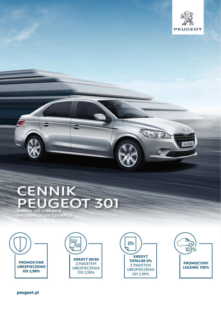 +$ $ odkup poad kk i eutpy style + st y l e CENNIK $ $ 301 PEUGEOT 3x 33% WAŻNY OD 2.04.2015 PRODUKCJA OD CZERWCA k re d y t k re d y t pakiety + + odkupodkup style style p a k i e tp yakiety reddyytt k re d y t k re d y t kkre 3x 33% u b ez p i e c ze n i e ko m u n iPROMOCYJNE ka c y j n e UBEZPIECZENIE OD 2,99% 3x 33% 3x 33% KREDYT b ez p i e c ze n i e KREDYTu50/50 TOTALNE 0% ko m fo rt leasing ko m fo r tk reZdPAKIETEM ing kodmyl e ut a n si ka ckyre j ndey tk reZdPAKIETEM y tk re yt k re d y tk re d y t PROMOCYJNY LEASING 103% UBEZPIECZENIA UBEZPIECZENIA OD 2,99% OD 2,99% peugeot.pl u b ez p iuebcez zepniieec ze n i e ko m fo ko r t m fo r t ko m u nko i k amcuynj ni kea c y j n e l e a s i n gl e a s i n g CENY SEDAN 4D SKRZYNIA BIEGÓW ACCESS ACTIVE ALLURE 1,2 PureTech 82 KM M5 41 900 zł 49 000 zł – 1,2 PureTech 82 KM ETG5 S&S – 51 500 zł – 1,6 VTi 115 KM M5 – 53 500 zł 56 700 zł 1,6 VTi 115 KM LPG M5 – 58 000 zł 61 200 zł 1,6 BlueHDi 95 KM M5 – 58 000 zł 61 500 zł M5 – manualna skrzynia biegów o 5 przełożeniach. ETG5 – zautomatyzowana skrzynia biegów o 5 przełożeniach. S&S – system Stop & Start. WYPOSAŻENIE BEZPIECZEŃSTWO I ZABEZPIECZENIA ANTYKRADZIEŻOWE ABS ze wspomaganiem hamowania awaryjnego (AFU) ACCESS ACTIVE ALLURE S S S ESP – system stabilizacji toru jazdy S S S ASR – system kontroli trakcji S S S REF – elektroniczny rozdzielacz siły hamowania (oś przednia/tylna) S S S Poduszki czołowe dla kierowcy i pasażera (pasażera z możliwością dezaktywacji) S S S Poduszki boczne w pierwszym rzędzie foteli S S S Przednie pasy bezpieczeństwa z napinaczami i ogranicznikami siły napięcia S S S Pasy bezpieczeństwa w drugim rzędzie 3-punktowe S S S Mocowania fotelika dziecięcego Isofix (x 2) w drugim rzędzie siedzeń S S S Reflektory przednie halogenowe + światła do jazdy dziennej S S S Reflektory przednie przeciwmgielne – S S System tylnego oświetlenia z funkcją ostrzegania innych użytkowników drogi przy nagłym hamowaniu pojazdu S S S Czujniki parkowania z tyłu – – 1000 zł Centralny zamek sterowany pilotem: – jeden pilot zdalnego sterowania – blokowanie drzwi podczas ruszania – odblokowanie zamka bagażnika z pilota S S S Mechaniczna blokada otwarcia tylnych drzwi przez dzieci S S S Immobiliser S S S Alarm (zawiera 2 piloty zdalnego sterowania) – – 800 zł Wspomaganie kierownicy elektryczne S S S Regulacja kolumny kierownicy w pionie S S S Tempomat i ogranicznik prędkości ze sterowaniem z kolumny kierownicy – S S Elektrycznie sterowane szyby boczne przednie S S S KOMFORT Elektrycznie sterowane szyby boczne tylne + blokada otwarcia tylnych okien przez dzieci – 400 zł S Lusterka boczne sterowane i podgrzewane elektrycznie – S S Schowek otwarty na desce rozdzielczej powyżej radia (brak przy wyborze WIP Bluetooth) S S S Schowek otwarty na desce rozdzielczej w miejscu radia S – – Schowek w desce rozdzielczej przed pasażerem, zamykany S S S Gniazdo 12 V w konsoli środkowej S S S Uchwyty (x 3) na napoje w konsoli środkowej (dla wersji Allure tylko 1 uchwyt) S S S Podłokietnik centralny z przodu + schowek – – S Podłokietniki w drzwiach przednich zintegrowane z uchwytami drzwi – – S Kieszenie w drzwiach bocznych z przodu S S S Osłony przeciwsłoneczne z lusterkiem po stronie pasażera S S S 2 OŚWIETLENIE WNĘTRZA ACCESS ACTIVE ALLURE Oświetlenie wnętrza: – 1 lampka główna + 2 lampki do czytania w konsoli sufitowej z przodu – oświetlenie bagażnika S S – Oświetlenie wnętrza: – 1 lampka główna + 2 lampki do czytania w konsoli sufitowej z przodu – 1 lampka w konsoli sufitowej z tyłu – oświetlenie bagażnika – – S 4000 zł S – Klimatyzacja manualna ze sterowaniem elektronicznym: – wyświetlacz monochromatyczny ustawień klimatyzacji – przycisk A/C MAX (maksymalne chłodzenie) – filtr przeciwpyłkowy – – S Tylna szyba ogrzewana S S S Fotel kierowcy: – manualna regulacja wzdłużna fotela – manualna regulacja pochylenia oparcia – manualna regulacja wysokości fotela – kieszeń na mapę w oparciu fotela S S S Fotel pasażera: – manualna regulacja wzdłużna fotela – manualna regulacja pochylenia oparcia S S S Podgrzewane przednie fotele (zawarte również w opcji Pakiet Zimowy, niedostępne z jasnymi tapicerkami Lama) – 700 zł/P 700 zł/P OGRZEWANIE I KLIMATYZACJA Klimatyzacja manualna + filtr przeciwpyłkowy SIEDZENIA Zagłówki przednich foteli z regulacją wysokości S S S Tylna kanapa: – zagłówki (x 2) zintegrowane z kanapą S – – Tylna kanapa: – składane i dzielone asymetrycznie oparcie – zagłówki (x 2) zintegrowane z kanapą – S S Komputer pokładowy S S S Instalacja do montażu radia S S S WIP Sound: – radio CD z MP3 + 2 głośniki – gniazdo AUX na panelu radia – S – WIP Bluetooth (dla Active zawarty również w opcji Pakiet Kierowcy): – radio CD z MP3 + 4 głośniki (2 przednie + 2 tylne) – gniazdo USB i AUX na konsoli środkowej – sterowanie z kolumny kierownicy – zestaw głośnomówiący Bluetooth – monochromatyczny wyświetlacz graficzny C- – 1000 zł S Kierownica 3-ramienna z tworzywa sztucznego S S – Kierownica 3-ramienna skórzana – – S SYSTEMY AUDIO I KOMUNIKACJI STYL WEWNĘTRZNY Klamki wewnętrzne czarne S – – Klamki wewnętrzne w kolorze satynowego chromu – S S Tablica zegarów: – czarne cyferblaty z białym podświetleniem – wykończenie zegarów czarne (Access) lub satynowy chrom (Active i Allure) – wyświetlacz monochromatyczny pomiędzy zegarami – wskaźnik zmiany biegów GSI S S S Tapicerka siedzeń materiałowa S S S S S S STYL ZEWNĘTRZNY Szyby barwione Klamki zewnętrzne i lusterka boczne w kolorze czarnym S – – Klamki zewnętrzne i lusterka boczne w kolorze nadwozia – S S Wlot powietrza do silnika z czarnym wykończeniem S S – Wlot powietrza do silnika z chromowanym wykończeniem – – S 3 STYL ZEWNĘTRZNY ACCESS ACTIVE ALLURE Chromowane listwy pod