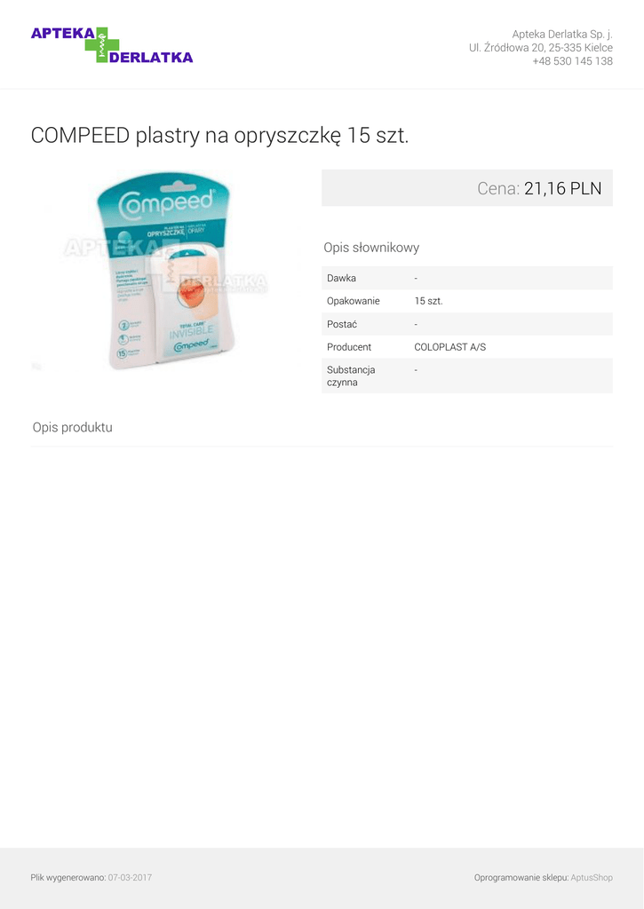 Apteka Derlatka Sp. j. Ul. Źródłowa 20, 25-335 Kielce +48 530 145 138 COMPEED plastry na opryszczkę 15 szt. Cena: 21,16 PLN Opis słownikowy Dawka - Opakowanie 15 szt. Postać - Producent COLOPLAST A/S Substancja czynna - Opis produktu Plik wygenerowano: 07-03-2017 Powered by TCPDF (www.tcpdf.org) Oprogramowanie sklepu: AptusShop