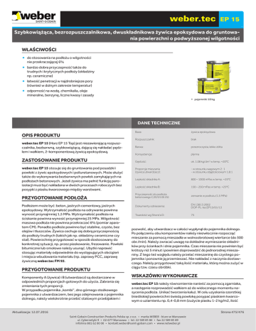 weber.tec EP 15 Szybkowiążąca, bezrozpuszczalnikowa, dwuskładnikowa żywica epoksydowa do gruntowania powierzchni o podwyższonej wilgotności WŁAŚCIWOŚCI • do stosowania na podłożu o wilgotności nie przekraczającej 6% • bardzo dobra przyczepność także do trudnych i krytycznych podłoży (okładziny np. ceramiczne) • łatwość penetracji w najdrobniejsze pory (również w dolnym zakresie temperatur) • odporność na wodę, chemikalia, oleje mineralne, benzynę, liczne kwasy i zasady • pojemniki 10 kg DANE TECHNICZNE OPIS PRODUKTU weber.tec EP 15 (Harz EP 15 Top) jest niezawierającą rozpuszczalnika, bezbarwną, szybkowiążącą, dającą się nakładać pędzlem i wałkiem, 2-komponentową żywicą epoksydową. ZASTOSOWANIE PRODUKTU weber.tec EP 15 stosuje się do gruntowania pod posadzki i powłoki z żywic epoksydowych i poliuretanowych. Może służyć także do wykonywania bezbarwnych powłok zamykających na podłożach betonowych. Jeżeli żywica ma pełnić funkcję paroizolacji musi być nakładana w dwóch procesach roboczych bez posypki z piasku kwarcowego między warstwami. PRZYGOTOWANIE PODŁOŻA Podłożem może być: beton, jastrych cementowy, jastrych epoksydowy. Wytrzymałość podłoża na odrywanie powinna wynosić przynajmniej 1,5 MPa. Wytrzymałość podłoża na ściskanie powinna wynosić przynajmniej 25 MPa. Wilgotność masowa podłoża nie powinna przekraczać 6% (pomiar aparatem CM). Ponadto podłoże powinno być stabilne, czyste, bez olejów i tłuszczów. Żywica cechuje się dobrą przyczepnością do podłoży trudnych (takich jak np. okładziny ceramiczne czy stal). Powierzchnię przygotować w sposób dostosowany do konkretnej sytuacji, np. przez piaskowanie, frezowanie. Powłoki bitumiczne lub smołowe należy usunąć. Ubytki naprawić stosując materiały odpowiednie do występujących obciążeń i miejsca wbudowania materiału (np. zaprawy PCC, zaprawę żywiczną weber.tec FM 93. PRZYGOTOWANIE PRODUKTU Komponenty A (żywica) i B (utwardzacz) są dostarczane w odpowiednich proporcjach gotowych do użycia. Zabrania się zmieniania tych proporcji. W przypadku pojemnika „kombi”, dno górnego stożkowego pojemnika z utwardzaczem, bez jego zdejmowania z pojemnika dolnego, należy wielokrotnie przebić stalowym przebijakiem i Baza: żywica epoksydowa Rozpuszczalnik: brak Barwa: przezroczysta, lekko żółta Konsystencja: płynna Gęstość: ok. 1,08 kg/dm3 w temp. +20°C Proporcje mieszania (żywica:utwardzacz): - w stosunku wagowym 2 : 1 - w stosunku objętościowym 1,8:1 Lepkość składnika A: 800 – 1000 mPas w temp. +25°C Lepkość składnika B: 150 – 250 mPas w temp. +25°C Przyczepność do podłoża betonowego C20/25 (B 25): zerwanie w podłożu (1,5 MPa) Dokumenty odniesienia: EN 13813:2002 DOP-PL-tecEP15/01/13 Twardość wg Shore'a D: 75 pozwolić, aby utwardzacz w całości wypłynął do pojemnika dolnego. Po połączeniu obu komponentów należy niezwłocznie rozpocząć mieszanie za pomocą mieszadła w wolnoobrotowej wiertarce (do 300 obr./min). Należy zwracać uwagę na dokładne wymieszanie składników przy ściankach i dnie pojemnika. Czas mieszania nie powinien być krótszy niż 5 minut i powinien doprowadzić do jednorodnej mieszaniny. Z tego też względu należy przelać mieszaninę do czystego pojemnika i ponownie ją przemieszać. Nie nakładać z naczynia dostawczego. Należy przygotować taką ilość materiału, którą można zużyć w ciągu tzw. czasu obróbki. WSKAZÓWKI WYKONAWCZE weber.tec EP 15 należy równomiernie nanieść za pomocą zgarniaka, a następnie rozprowadzić wałkiem aż do widocznego momentu nasycenia podłoża. Unikać tworzenia kałuż. W celu uzyskania szorstkiej (nieśliskiej) powierzchni świeżą powłokę posypać piaskiem kwarcowym o uziarnieniu np. 0,4-0,8 mm (zużycie piasku 1-2 kg/m2, ilość Aktualizacja: 12.07.2016 Strona 475/476 Saint-Gobain Construction Products Polska sp. z o.o. • marka WEBER - biuro w Warszawie ul. Cybernetyki 9 • 02-677 Warszawa • tel. 22 589 85 80 • fax 22 589 85 89 infolinia 801 62 00 00 • [email protected] • www.netweber.pl weber.tec EP 15 Szybkowiążąca, bezrozpuszczalnikowa, dwuskładnikowa żywica epoksydowa do gruntowania powierzchni o podwyższonej wilgotności niezbędna do całkowitego pokrycia ok. 3-4 kg/m2). Po związaniu nadmiar piasku usunąć. Aby uniknąć zabrudzenia i przyklejania się do wykonywanej powierzchni używać butów z kolcami. Jeżeli żywica ma pełnić funkcję paroizolacji, musi być nakładana w dwóch przejściach, bez posypki z piasku kwarcowego między warstwami. Należy bezwzględnie przestrzegać przepisów bezpieczeństwa umieszczonych na etykiecie. Czyszczenie narzędzi Narzędzia czyścić natychmiast po zakończeniu pracy (żywica musi być w stanie niezwiązanym) z zastosowaniem preparatu weber.sys 992. WARUNKI PODCZAS STOSOWANIA I WIĄZANIA UWAGA Prawidłowe, a tym samym skuteczne, zastosowanie naszych produktów nie podlega naszej kontroli. Dlatego też gwarancją objęta jest tylko, jakość naszych wyrobów w ramach naszych warunków sprzedaży i dostaw, z wyłączeniem ich skutecznego zastosowania. Należy przestrzegać przepisów BHP oraz instrukcji bezpieczeństwa na opakowaniach. Niniejsza instrukcja unieważnia wszystkie podane wcześniej dane techniczne tego produktu. Zastrzegamy sobie prawo do dokonywania wszelkich zmian wynikających z postępu technicznego. Informacje podane przez naszych pracowników, wykraczające poza ramy tej instrukcji, wymagają pisemnego potwierdzenia. Przy obróbce i składowaniu należy przestrzegać podanych na pojemnikach wskazówek dotyczących bezpieczeństwa pracy. Temperatura aplikacji (powietrza i podłoża) musi zawierać się w przedziale od +10C do +30°C. Jednocześnie temperatura podłoża musi być, co najmniej o 3°C wyższa od punktu rosy. Nie nakładać weber.tec EP 15 podczas deszczu lub też wtedy, gdy trzeba się liczyć