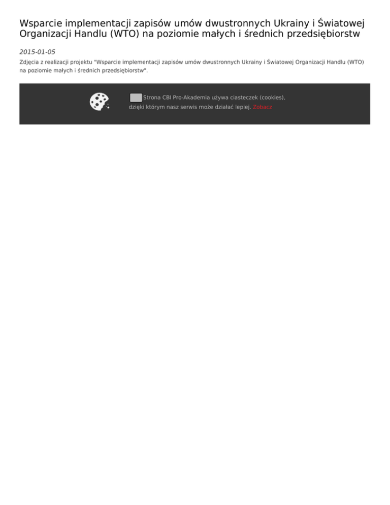 Wsparcie implementacji zapisów umów dwustronnych Ukrainy i Światowej Organizacji Handlu (WTO) na poziomie małych i średnich przedsiębiorstw 2015-01-05 Zdjęcia z realizacji projektu "Wsparcie implementacji zapisów umów dwustronnych Ukrainy i Światowej Organizacji Handlu (WTO) na poziomie małych i średnich przedsiębiorstw". Strona CBI Pro-Akademia używa ciasteczek (cookies), dzięki którym nasz serwis może działać lepiej. Zobacz