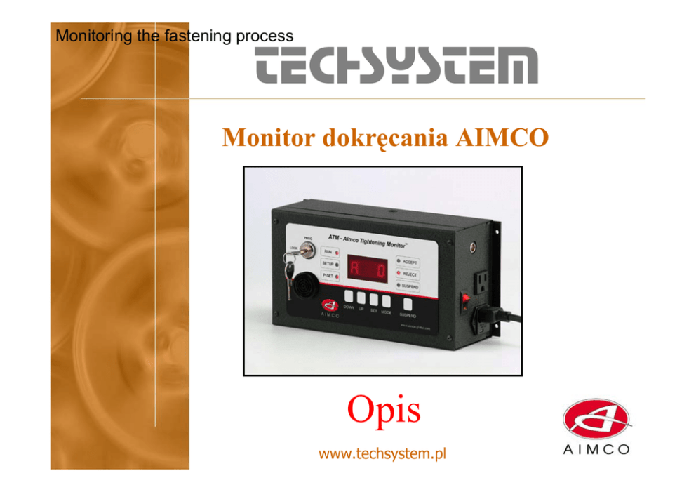 Monitoring the fastening process Techsystem Monitor dokręcania AIMCO Opis www.techsystem.pl www.aimco-global.com Monitoring the fastening process System ATM W skład systemu wchodzi: • • • Jednostka bazowa – ATM-1-1 Przewód, przetwornik i zawór nadmiarowy Oprogramowanie PC i interfejsy do komunikacji www.techsystem.pl www.aimco-global.com Monitoring the fastening process Zalety systemu • ¾ ¾ ¾ • • • • ¾ Weryfikacja procesu wkręcania Sygnalizacja końca procesu Sygnalizacja podwójnego impulsu Sygnalizacja zatarcia gwintu Zliczanie cykli Łatwe programowanie funkcji AutoCal Dostęp do komunikacji sieciowej I/O interfejs Łatwa integracja z PLC, PC, sygnalizacją świetlną, selektorem nasadek itp. www.techsystem.pl www.aimco-global.com Monitoring the fastening process Opis możliwości · Możliwość odrzucenia ograniczeń nałożonych przez system – wiedząc, że proces dokręcania jest zakończony poprawnie · Możliwość pracy z narzędziami impulsowymi Uryu ULT TM Sygnalizacja podwójnego uderzenia i przedwczesnego zwolnienia spustu Auto-Cal – automatyczne generowanie parametrów dla danego procesu wkręcania – proste programowanie 6 wskaźników LED sygnalizujących stan procesu wkręcania OK, NOK, „dokręcanie w toku” 8 możliwych do wyboru programów dla jednego narzędzia · · · · www.techsystem.pl www.aimco-global.com Monitoring the fastening process Opis możliwości • • • • • • Zliczanie serii widoczne na wyświetlaczu Zliczanie cykli widoczne na wyświetlaczu dla danej serii Sygnalizacja dźwiękowa dla cyklu OK. i NOK. 5 izolowanych wejść i 8 wyjść dla sterownika PLC Parametry widoczne na wyświetlaczu podczas cyklu wkręcania Możliwość podłączenia programatora lub klawiatury PC dla ułatwienia obsługi www.techsystem.pl www.aimco-global.com Monitoring the fastening process Opis możliwości • • • • • Przełącznik elektryczny z kluczem dla trybu programowania i trybu zabezpieczenia dostępu Możliwość podłączenia interfejsów sieciowych Pamięć ostatniego cyklu dla zdiagnozowania i usunięcia błędu Pamięć ostatnich 1000 cykli Możliwość użycia programatora lub oprogramowania PC www.techsystem.pl www.aimco-global.com Monitoring the fastening process Skrócona instrukcja obsługi Aby uruchomić funkcję AutoCal musimy wykonać następujące kroki. • Włączyć zasilanie i przekręcić klucz w pozycję PROG • Gdy na wyświetlaczu pojawi się ACAL należy wcisnąć przycisk SET • Należy sprawdzić poprawność podłączeń narzędzia i przetwornika i wcisnąć przycisk SET • Uruchomić narzędzie w docelowym procesie wkręcania aż do wyłączenia się • Zwolnić dźwignię włącznika i przycisnąć SET • Jeśli na wyświetlaczu pojawi się GOOD należy wcisnąć SET jeśli BAD wcisnąć SET i powtórzyć poprzednie kroki www.techsystem.pl www.aimco-global.com Monitoring the fastening process Skrócona instrukcja obsługi • • • • • Nacisnąć przycisk MODE dopóki nie pojawi się (X).BAT na wyświetlaczu Wcisnąć SET aby wyświetlić liczbę cykli w serii Naciskać UP lub DOWN aby ustawić właściwą wartość Wcisnąć SET aby zaakceptować nową wartość Przekręć klucz w pozycje LOCK www.techsystem.pl www.aimco-global.com Monitoring the fastening process Oprogramowanie PC • Podgląd bieżących parametrów • Edycja parametrów • Ustawianie hasła • Możliwość ustawienia użytkowników o różnym poziomie dostępu • Ustawianie daty i czasu • Menu historii zdarzeń • Menu rozwiązywania problemów www.techsystem.pl www.aimco-global.com Monitoring the fastening process Interfejsy sieciowe 4 PFCS – Chrysler Interface 8 RS232 8 Ethernet 4 Coss – GM DeviseNet Interface 4 Generic DeviseNet Interface www.techsystem.pl www.aimco-global.com Monitoring the fastening process Dlaczego AIMCO? • Potrzebujesz rejestracji błędów? • Potrzebujesz zliczania ilości cykli? • Potrzebujesz lżejszego, szybszego narzędzia? www.techsystem.pl www.aimco-global.com Monitoring the fastening process Dlaczego AIMCO? • AIMCO proponuje wszechstronne rozwiązania służące technice wkręcania • Narzędzia AIMCO są projektowane z uwzględnieniem światowych trendów w ergonomii • AIMCO posiada grupę profesjonalnych doradców z wieloletnim doświadczeniem w rozwiązywaniu problemów montażowych • AIMCO posiada grupę wykwalifikowanego i doświadczonego personelu, szkolącego pracowników serwisowych, aby Państwa narzędzia pozostawały w jak najlepszym stanie. www.techsystem.pl www.aimco-global.com Monitoring the fastening process Podsumowanie Dystrybutor systemu AcraDyne w Polsce: TECHSYSTEM Bielsko-Biała tel. 033 816 73 61 fax 033 816 73 62 mobil 602 269 638 [email protected] www.techsystem.pl www.aimco-global.com