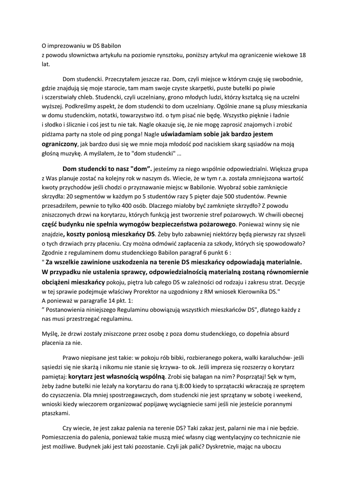 O imprezowaniu w DS Babilon z powodu słownictwa artykułu na poziomie rynsztoku, poniższy artykuł ma ograniczenie wiekowe 18 lat. Dom studencki. Przeczytałem jeszcze raz. Dom, czyli miejsce w którym czuję się swobodnie, gdzie znajdują się moje starocie, tam mam swoje czyste skarpetki, puste butelki po piwie i sczerstwiały chleb. Studencki, czyli uczelniany, grono młodych ludzi, którzy kształcą się na uczelni wyższej. Podkreślmy aspekt, że dom studencki to dom uczelniany. Ogólnie znane są plusy mieszkania w domu studenckim, notatki, towarzystwo itd. o tym pisać nie będę. Wszystko pięknie i ładnie i słodko i ślicznie i coś jest tu nie tak. Nagle okazuje się, że nie mogę zaprosić znajomych i zrobić pidżama party na stole od ping ponga! Nagle uświadamiam sobie jak bardzo jestem ograniczony, jak bardzo dusi się we mnie moja młodość pod naciskiem skarg sąsiadów na moją głośną muzykę. A myślałem, że to "dom studencki" … Dom studencki to nasz "dom”. jesteśmy za niego wspólnie odpowiedzialni. Większa grupa z Was planuje zostać na kolejny rok w naszym ds. Wiecie, że w tym r.a. została zmniejszona wartość kwoty przychodów jeśli chodzi o przyznawanie miejsc w Babilonie. Wyobraź sobie zamknięcie skrzydła: 20 segmentów w każdym po 5 studentów razy 5 pięter daje 500 studentów. Pewnie przesadziłem, pewnie to tylko 400 osób. Dlaczego miałoby być zamknięte skrzydło? Z powodu zniszczonych drzwi na korytarzu, których funkcją jest tworzenie stref pożarowych. W chwili obecnej część budynku nie spełnia wymogów bezpieczeństwa pożarowego. Ponieważ winny się nie znajdzie, koszty poniosą mieszkańcy DS. Żeby było zabawniej niektórzy będą pierwszy raz słyszeli o tych drzwiach przy płaceniu. Czy można odmówić zapłacenia za szkody, których się spowodowało? Zgodnie z regulaminem domu studenckiego Babilon paragraf 6 punkt 6 : " Za wszelkie zawinione uszkodzenia na terenie DS mieszkańcy odpowiadają materialnie. W przypadku nie ustalenia sprawcy, odpowiedzialnością materialną zostaną równomiernie obciążeni mieszkańcy pokoju, piętra lub całego DS w zależności od rodzaju i zakresu strat. Decyzje w tej sprawie podejmuje właściwy Prorektor na uzgodniony z RM wniosek Kierownika DS." A ponieważ w paragrafie 14 pkt. 1: ” Postanowienia niniejszego Regulaminu obowiązują wszystkich mieszkańców DS", dlatego każdy z nas musi przestrzegać regulaminu. Myślę, że drzwi zostały zniszczone przez osobę z poza domu studenckiego, co dopełnia absurd płacenia za nie. Prawo niepisane jest takie: w pokoju rób bibki, rozbieranego pokera, walki karaluchów- jeśli sąsiedzi się nie skarżą i nikomu nie stanie się krzywa- to ok. Jeśli impreza się rozszerzy o korytarz pamiętaj: korytarz jest własnością wspólną. Zrobi się bałagan na nim? Posprzątaj! Sęk w tym, żeby żadne butelki nie leżały na korytarzu do rana tj.8:00 kiedy to sprzątaczki wkraczają ze sprzętem do czyszczenia. Dla mniej spostrzegawczych, dom studencki nie jest sprzątany w sobotę i weekend, wnioski kiedy wieczorem organizować popijawę wyciągniecie sami jeśli nie jesteście porannymi ptaszkami. Czy wiecie, że jest zakaz palenia na terenie DS? Taki zakaz jest, palarni nie ma i nie będzie. Pomieszczenia do palenia, ponieważ takie muszą mieć własny ciąg wentylacyjny co technicznie nie jest możliwe. Budynek jaki jest taki pozostanie. Czyli jak palić? Dyskretnie, mając na uboczu popielniczkę- puszkę. W sumie to sytuacja palaczy od wprowadzenia zakazu dużo się nie zmieniła. Puszek na korytarzu nie zostawiamy i nie obnosimy się z zapalonymi fajkami przy pracownikach domu studenckiego. Można przyznać kulturę palenia za wysoką. Na koniec najważniejsze. Do czego służy sala telewizyjna? ...ok jest tam telewizor...może to podchwytliwe...ok, do oglądania telewizji?... Pan pyta czy odpowiada? Odpowiadam, że do oglądania telewizji. Bardzo ładnie, proszę indeks, zdał pan. Ponieważ wielu z Was zawaliło by ten egzamin i w trosce o takie osoby rada mieszkańców wprowadziła ograniczenie sale ze sprzętem bez wyjątku będą dostępne do godz.23. Przykro mi, bo z reguły mój wolny czas to przedział 22-1 w nocy, a takie ograniczenie zabiera mi możliwość wzięcia piwka i zagrania w piłkarzyki. Jednak jest na chwilę obecną przymus od kierownika na nałożenie tej granicy. Powtórzmy do 23:00 oddajemy klucze od sal ze sprzętem. Zastanawiam się, czemu ktoś organizuje imprezy w sali od ping ponga? Miejsc do siedzenia mało, przestrzeń też niewielka całą zajmuje stół do ping ponga, w segmencie możecie włączyć muzykę z laptopa, jest gdzie usiąść, jest lodówka do chłodzenia trunków, miejsca jest więcej jak posprząta się trochę. Czemu boimy się zaprosić ludzi do siebie? Bo nas okradną? Bo wstydzę się uprzedzić sąsiadów, że będzie trochę głośniej? Wasi sąsiedzi to także studenci. Za Waszą ścianą nie mieszka małżeństwo z małym dzieckiem lub złośliwa babka węgierskia (czyli z węgierskiej). Idź do swoich sąsiadów, powiedz co i jak- jestem przekonany, że nie będzie problemów. Nie jestem konserwatystą oraz abstynentem. Lubię whisky z colą i tanie piwo koniecznie z butelki. Nie jestem aspołeczny, siedząc pół dnia przy klawiaturze i klepiąc artykuły. Gdy kandydowałem na radnego poszedłem do kolegów i koleżanek, do mieszkańców domu studenckiego, rozmawiałem z Wami i poznawałem Was. Jeśli masz inne zdanie na temat imprezowania w DS: zaproś mnie lub czuj się zaproszonym do rozmowy, podziel się tym co myślisz- pewnie mylę się albo czegoś nie dostrzegam. Anegdotka z lutego: 9 w nocy, śpię sobie, a tu walenie w drzwi- wpada ktoś i chce mnie wylegitymować! Ja przebudzony w łóżku, pytam kim jest… okazało się, że kierownikiem. Zostałem o 9 nocy/rano oskarżony o zorganizowanie imprezy i rozwalenie drzwi. Dostałem opieprz za kogoś. Inna 