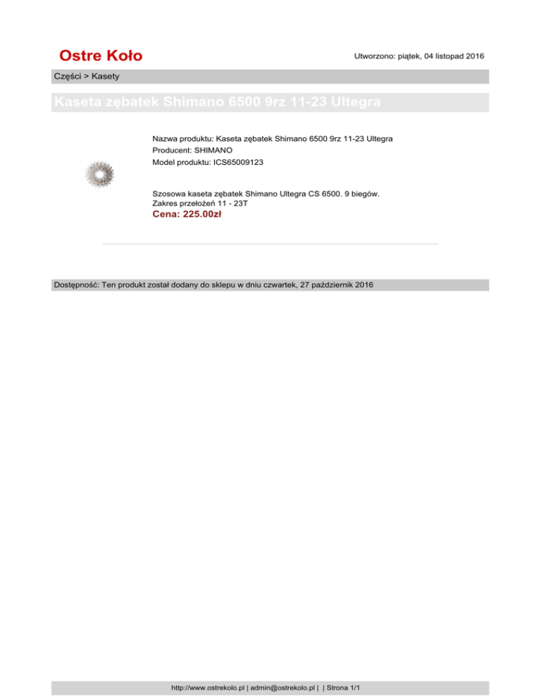 Ostre Koło Utworzono: piątek, 04 listopad 2016 Części > Kasety Kaseta zębatek Shimano 6500 9rz 11-23 Ultegra Nazwa produktu: Kaseta zębatek Shimano 6500 9rz 11-23 Ultegra Producent: SHIMANO Model produktu: ICS65009123 Szosowa kaseta zębatek Shimano Ultegra CS 6500. 9 biegów. Zakres przełożeń 11 - 23T Cena: 225.00zł Dostępność: Ten produkt został dodany do sklepu w dniu czwartek, 27 październik 2016 http://www.ostrekolo.pl | [email protected] | | Strona 1/1