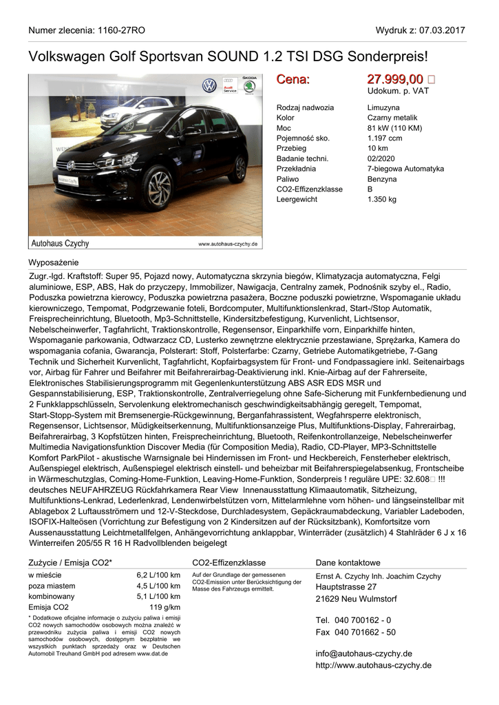 Numer zlecenia: 1160-27RO Wydruk z: 07.03.2017 Volkswagen Golf Sportsvan SOUND 1.2 TSI DSG Sonderpreis! Cena: 27.999,00 Rodzaj nadwozia Kolor Moc Pojemność sko. Przebieg Badanie techni. Przekładnia Paliwo CO2-Effizenzklasse Leergewicht Limuzyna Czarny metalik 81 kW (110 KM) 1.197 ccm 10 km 02/2020 7-biegowa Automatyka Benzyna B 1.350 kg Udokum. p. VAT Wyposażenie Zugr.-lgd. Kraftstoff: Super 95, Pojazd nowy, Automatyczna skrzynia biegów, Klimatyzacja automatyczna, Felgi aluminiowe, ESP, ABS, Hak do przyczepy, Immobilizer, Nawigacja, Centralny zamek, Podnośnik szyby el., Radio, Poduszka powietrzna kierowcy, Poduszka powietrzna pasażera, Boczne poduszki powietrzne, Wspomaganie układu kierowniczego, Tempomat, Podgrzewanie foteli, Bordcomputer, Multifunktionslenkrad, Start-/Stop Automatik, Freisprecheinrichtung, Bluetooth, Mp3-Schnittstelle, Kindersitzbefestigung, Kurvenlicht, Lichtsensor, Nebelscheinwerfer, Tagfahrlicht, Traktionskontrolle, Regensensor, Einparkhilfe vorn, Einparkhilfe hinten, Wspomaganie parkowania, Odtwarzacz CD, Lusterko zewnętrzne elektrycznie przestawiane, Sprężarka, Kamera do wspomagania cofania, Gwarancja, Polsterart: Stoff, Polsterfarbe: Czarny, Getriebe Automatikgetriebe, 7-Gang Technik und Sicherheit Kurvenlicht, Tagfahrlicht, Kopfairbagsystem für Front- und Fondpassagiere inkl. Seitenairbags vor, Airbag für Fahrer und Beifahrer mit Beifahrerairbag-Deaktivierung inkl. Knie-Airbag auf der Fahrerseite, Elektronisches Stabilisierungsprogramm mit Gegenlenkunterstützung ABS ASR EDS MSR und Gespannstabilisierung, ESP, Traktionskontrolle, Zentralverriegelung ohne Safe-Sicherung mit Funkfernbedienung und 2 Funkklappschlüsseln, Servolenkung elektromechanisch geschwindigkeitsabhängig geregelt, Tempomat, Start-Stopp-System mit Bremsenergie-Rückgewinnung, Berganfahrassistent, Wegfahrsperre elektronisch, Regensensor, Lichtsensor, Müdigkeitserkennung, Multifunktionsanzeige Plus, Multifunktions-Display, Fahrerairbag, Beifahrerairbag, 3 Kopfstützen hinten, Freisprecheinrichtung, Bluetooth, Reifenkontrollanzeige, Nebelscheinwerfer Multimedia Navigationsfunktion Discover Media (für Composition Media), Radio, CD-Player, MP3-Schnittstelle Komfort ParkPilot - akustische Warnsignale bei Hindernissen im Front- und Heckbereich, Fensterheber elektrisch, Außenspiegel elektrisch, Außenspiegel elektrisch einstell- und beheizbar mit Beifahrerspiegelabsenkug, Frontscheibe in Wärmeschutzglas, Coming-Home-Funktion, Leaving-Home-Funktion, Sonderpreis ! reguläre UPE: 32.608 !!! deutsches NEUFAHRZEUG Rückfahrkamera Rear View Innenausstattung Klimaautomatik, Sitzheizung, Multifunktions-Lenkrad, Lederlenkrad, Lendenwirbelstützen vorn, Mittelarmlehne vorn höhen- und längseinstellbar mit Ablagebox 2 Luftausströmern und 12-V-Steckdose, Durchladesystem, Gepäckraumabdeckung, Variabler Ladeboden, ISOFIX-Halteösen (Vorrichtung zur Befestigung von 2 Kindersitzen auf der Rücksitzbank), Komfortsitze vorn Aussenausstattung Leichtmetallfelgen, Anhängevorrichtung anklappbar, Winterräder (zusätzlich) 4 Stahlräder 6 J x 16 Winterreifen 205/55 R 16 H Radvollblenden beigelegt Zużycie / Emisja CO2* w mieście poza miastem kombinowany Emisja CO2 6,2 L/100 km 4,5 L/100 km 5,1 L/100 km 119 g/km * Dodatkowe oficjalne informacje o zużyciu paliwa i emisji CO2 nowych samochodów osobowych można znaleźć w przewodniku zużycia paliwa i emisji CO2 nowych samochodów osobowych, dostępnym bezpłatnie we wszystkich punktach sprzedaży oraz w Deutschen Automobil Treuhand GmbH pod adresem www.dat.de CO2-Effizenzklasse Dane kontaktowe Auf der Grundlage der gemessenen CO2-Emission unter Berücksichtigung der Masse des Fahrzeugs ermittelt. Ernst A. Czychy Inh. Joachim Czychy Hauptstrasse 27 21629 Neu Wulmstorf Tel. 040 700162 - 0 Fax 040 701662 - 50 [email protected] http://www.autohaus-czychy.de Numer zlecenia: 1160-27RO Wydruk z: 07.03.2017 Volkswagen Golf Sportsvan SOUND 1.2 TSI DSG Sonderpreis! Numer zlecenia: 1160-27RO Wydruk z: 07.03.2017 Volkswagen Golf Sportsvan SOUND 1.2 TSI DSG Sonderpreis! Numer zlecenia: 1160-27RO Wydruk z: 07.03.2017 Volkswagen Golf Sportsvan SOUND 1.2 TSI DSG Sonderpreis!