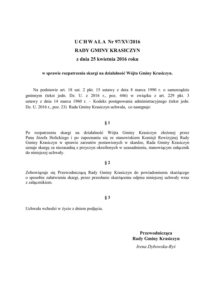 U C H W A Ł A Nr 97/XV/2016 RADY GMINY KRASICZYN z dnia 25 kwietnia 2016 roku w sprawie rozpatrzenia skargi na działalność Wójta Gminy Krasiczyn. Na podstawie art. 18 ust. 2 pkt. 15 ustawy z dnia 8 marca 1990 r. o samorządzie gminnym (tekst jedn. Dz. U. z 2016 r., poz. 446) w związku z art. 229 pkt. 3 ustawy z dnia 14 marca 1960 r. – Kodeks postępowania administracyjnego (tekst jedn. Dz. U. 2016 r., poz. 23) Rada Gminy Krasiczyn uchwala, co następuje: §1 Po rozpatrzeniu skargi na działalność Wójta Gminy Krasiczyn złożonej przez Pana Józefa Holickiego i po zapoznaniu się ze stanowiskiem Komisji Rewizyjnej Rady Gminy Krasiczyn w sprawie zarzutów postawionych w skardze, Rada Gminy Krasiczyn uznaje skargę za niezasadną z przyczyn określonych w uzasadnieniu, stanowiącym załącznik do niniejszej uchwały. §2 Zobowiązuje się Przewodniczącą Rady Gminy Krasiczyn do powiadomienia skarżącego o sposobie załatwienia skargi, przez przesłanie skarżącemu odpisu niniejszej uchwały wraz z załącznikiem. §3 Uchwała wchodzi w życie z dniem podjęcia. Przewodnicząca Rady Gminy Krasiczyn Irena Dybowska-Ryś Załącznik do uchwały Nr 97/XV/2016 Rady Gminy Krasiczyn z dnia 25.04.2016 r. UZASADNIENIE Pismem z dnia 25 lutego 2016 roku, adresowanym do Przewodniczącej Rady Gminy Krasiczyn, Pan Radny Józef Holicki złożył skargę na działalność Wójta Gminy Krasiczyn, zarzucając mu odmowę udostępnienia dokumentów dotyczących rozbudowy cmentarza komunalnego w Śliwnicy oraz niegospodarność w zarządzaniu środkami budżetowymi w związku z budową odcinka sieci wodociągowej w miejscowościach Śliwnica - Krasiczyn. W części skargi dotyczącej odmowy udostępnienia dokumentów z Urzędu Gminy trudno jednoznacznie określić zasadność, ponieważ żądanie o ich udostępnienie było skierowane ustnie do pracownika Urzędu Gminy – brak daty złożenia ustnego wniosku. Nadto, ustne żądanie udostępnienia dokumentów archiwalnych dotyczyło informacji przetworzonej. W związku z tym udostępnienie takiej informacji niezwłocznie może być niemożliwe z uwagi na zaangażowanie urzędu ponad zwykłą miarę. Oznacza to sięganie do archiwów i innych dokumentów źródłowych oraz ich przetwarzanie. Przetwarzanie informacji to np. konieczność zanonimizowania dokumentów. Pan Radny Józef Holicki w dniu 18 lutego 2016 roku wystosował do Wójta Gminy Krasiczyn pismo, w którym prosi o podanie przyczyny odmowy udostępnienia dokumentów. 29 lutego 2016 roku Wójt Gminy Krasiczyn odpowiedział na pismo Pana Radnego Józefa Holickiego, informując go o możliwości uzyskania wglądu do wnioskowanej dokumentacji w Urzędzie Gminy w Krasiczynie. Żądana informacja choć opóźniona została Skarżącemu udostępniona. W dalszej części skargi, Pan Radny Józef Holicki zarzucił Wójtowi Gminy Krasiczyn niegospodarność w kwestii budowy odcinka wodociągu do czterech nieruchomości, w tym do trzech budynków mieszkalnych, w miejscowości Krasiczyn. Powyższe uzasadnił tym, że właściciele wymienionych nieruchomości kilkanaście lat temu nie partycypowali w kosztach budowy sieci wodociągowej oraz nie byli zainteresowani przyłączeniem ich nieruchomości do budowanej przez gminę sieci wodociągowej w Krasiczynie. Nadto nie wyrazili zgody na planowaną rozbudowę cmentarza komunalnego w Śliwnicy w kierunku ich nieruchomości, co naraziło gminę na dodatkowe koszty związane z poszerzeniem cmentarza komunalnego z drugiej jego strony. Budowa odcinka wodociągu na terenie Śliwnicy i Krasiczyna (koszt wykonania projektu tego odcinka sfinansowali właściciele nieruchomości) za kwotę w wysokości 20 000 złotych, została ujęta w projekcie budżetu Gminy Krasiczyn na 2016 rok. Projekt budżetu gminy na 2016 rok był omawiany na posiedzeniach komisji stałych Rady Gminy Krasiczyn, które w swoich opiniach na temat środków przeznaczonych na omawianą inwestycję nie wniosły uwag. Rada Gminy Krasiczyn na XI sesji w dniu 29 grudnia 2016 roku przyjęła uchwałę budżetową Nr 83/XI/2015 bez zmian w stosunku do projektu uchwały. Uchwała Nr 83/XI/2016 została przyjęta przez Radę w głosowaniu: za: 12 głosów, przeciw: 0 głosów, wstrzymało się: 2 głosy, przy nieobecności jednego radnego w trakcie głosowania, tak więc decyzję o budowie odcinka wodociągu na terenie miejscowości Śliwnica - Krasiczyn zaakceptowała Rada Gminy Krasiczyn. Wobec powyższego na podstawie art. 229 pkt. 3 Kodeksu postępowania administracyjnego, Rada Gminy Krasiczyn rozpatrzyła skargę Pana Radnego Józefa Holickiego na działalność Wójta Gminy Krasiczyn i stwierdziła, że skarga Pana Radnego Józefa Holickiego z dnia 24 lutego 2016 roku na działalność Wójta Gminy Krasiczyn jest bezzasadna. Pouczenie: Jeśli ponownie wniesiona skarga, na już rozpatrzoną przez Radę Gminy Krasiczyn skargę uznaną za bezzasadną, nie wniesie nowych okoliczności faktycznych, to zostanie ona rozpatrzona przez radę na zasadzie art. 239 § 1 Kodeksu postępowania administracyjnego.