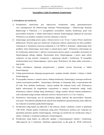 Załącznik nr 1- DZ-2501/530/14/1 przetarg nieograniczony na świadczenie usług gastronomicznych i cateringowych w PIWet-PIB Szczegółowy Opis Przedmiotu Zamówienia I. INFORMACJE OGÓLNE: 1) Przedmiotem zamówienia jest sukcesywne świadczenie usług gastronomicznych oraz cateringowych dla Państwowego Instytutu Weterynaryjnego – Państwowego Instytutu Badawczego w Puławach, a w szczególności uczestników szkoleń, konferencji, gości oraz pracowników Instytutu, w lokalu stanowiącym własność Zamawiającego oddanym do używania Wykonawcy na zasadzie wynajmu za kwotę wskazaną w umowie. 2) Zamawiający przewiduje prawo opcji, o którym mowa w art. 34 ust. 5 ustawy Prawo zamówień publicznych. Prawem opcji jest możliwość zwiększenia zakresu zamówienia do ilości posiłków wskazanych w formularzu cenowym (załącznik nr 3 do SIWZ) w kolumnie: „Maksymalna ilość posiłków, które Zamawiający może kupić w ramach prawa opcji”. Wykonawca zobowiązuje się do świadczenia zamówienia w zakresie rozszerzonym (prawo opcji) w przypadku otrzymania od Zamawiającego takiego żądania. Skorzystanie przez Zamawiającego z prawa opcji zależy wyłącznie od jego potrzeb, związanych z organizacją szkoleń i konferencji. W przypadku nieskorzystania przez Zamawiającego z prawa opcji, Wykonawcy nie służą żadne roszczenia z tego tytułu. 3) Usługi cateringowe obejmują przygotowanie i podanie serwisu kawowego w lokalu Zamawiającego. 4) Usługi gastronomiczne obejmują przygotowanie i podanie śniadań, obiadów i kolacji w lokalu Zamawiającego. 5) W przypadku zlecania w ramach umowy obsługi konferencji, Zamawiający zastrzega możliwość zmiany asortymentu posiłków. Zamawiający informuje, że dysponuje Salą z wyposażeniem dla 65 osób. Przy obsłudze konferencji i innych spotkań dla większej liczby osób, Wykonawca będzie zobowiązany do uzupełnienia wyposażenia w miejscu świadczenia usługi. Jeżeli Wykonawca odmówi obsługi danej konferencji i usługa zostanie zlecona innemu podmiotowi, cena wykonania usługi zostanie odliczona od kwot o których mowa w § 5 ust. 4 umowy. 6) Wykonawca zobowiązany jest do prowadzenia płatnej stołówki dla pracowników Instytutu oraz gości. Prowadzenie jakichkolwiek innych form działalności gastronomicznej może odbywać się wyłącznie za pisemną zgodą Zamawiającego. 7) Świadczenie usług będzie się odbywało w dni robocze, soboty i niedziele, zwykle w godzinach 7.00–20.00. Zmiana godzin świadczenia usług przez Wykonawcę możliwa jest wyłącznie po uprzedniej pisemnej zgodzie Zamawiającego. Zastrzega się możliwość nie świadczenia usług w soboty i niedziele w terminach ustalonych z Zamawiającym. 8) Świadczenie usług będzie się odbywało zgodnie z harmonogramem szkoleń i konferencji, odbywających się w Instytucie. Szkolenia organizowane są dla grup ok. 20-80 osobowych, 1 Załącznik nr 1- DZ-2501/530/14/1 przetarg nieograniczony na świadczenie usług gastronomicznych i cateringowych w PIWet-PIB a konferencje zwykle dla grup liczących ponad 100 osób. Harmonogram zajęć na dany miesiąc będzie przekazywany Wykonawcy min. na 3 dni przed rozpoczęciem kolejnego miesiąca. Na etapie przygotowania niniejszego postępowania, Zamawiający nie ma możliwości przedstawienia szczegółowego harmonogramu spotkań z podaniem dokładnej liczby uczestników. W poprzednim roku 2014 usługa objęła ok. 4500 osobodni. Dodatkowo, Zamawiający informuje, że w miesiącach: styczeń, lipiec, sierpień, grudzień, z uwagi na mniejszą liczbę szkoleń, ilość uczestników szkoleń, korzystających z usługi, może być mniejsza niż w pozostałych miesiącach roku. 9) Wykonawca będzie okresowo oceniany z jakości świadczenia usługi. Dla wybranych szkoleń przeprowadzona będzie ocena w formie anonimowych ankiet. II. OBOWIĄZKI WYKONAWCY: Wykonawca zapewni: 1) Czystą, nieuszkodzoną zastawę stołową porcelanową, ceramiczną lub szklaną, szklanki, filiżanki, sztućce platerowane, a także dekorację stołów, obejmującą czyste obrusy materiałowe, papierowe serwetki, wykałaczki oraz dekorację sezonową na stołach. Nie dopuszcza się stosowania naczyń jednorazowych styropianowych, tekturowych czy plastikowych. 2) Obsługę gości liczącą min. 8 osób zatrudnionych przez Wykonawcę, w tym: 1 zarządzający personelem, 2 kelnerów (min. 1 kelner ze znajomością języka angielskiego w stopniu komunikatywnym), 2 kucharzy/kucharki, 3 pomoce kuchenne. Ponadto Wykonawca zapewni obecną przez cały czas trwania spotkania obsługę gości – w proporcji min. 1 osoba obsługująca na 35 uczestników. 3) Przygotowanie zamówionych posiłków na godzinę, wskazaną przez Zamawiającego 4) Przygotowanie na miejscu, w lokalu Zamawiającego, posiłków świeżych, przyrządzonych w dniu świadczenia usługi, charakteryzujących się wysoką jakością produktów użytych do ich przyrządzenia. Produkty przetworzone będą posiadały termin przydatności do spożycia oraz będą serwowane w sposób gwarantujący utrzymanie ich odpowiedniej temperatury i jakości potraw. Wykonawca ponosi pełną odpowiedzialność za jakość i estetykę podawanych posiłków oraz zgodność świadczonych usług z obowiązującymi normami zbiorowego żywienia i wymogami sanitarno-epidemiologicznymi. 2 Załącznik nr 1- DZ-2501/530/14/1 przetarg nieograniczony na świadczenie usług gastronomicznych i cateringowych w PIWet-PIB 5) Ze względu na charakter placówki, Zamawiający bezwzględnie nie zezwala na podawanie i sprzedawanie napojów alkoholowych powyżej 18% zawartości alkoholu. Dopuszcza się podawanie i sprzedawanie piwa i napojów alkoholowych o zawartości alkoholu poniżej 18% uczestnikom szkoleń oraz gościom Instytutu, w dni powszednie po godzinie 16:00 oraz w soboty i niedziele, pod warunkiem uzyskania zezwolenia Prezydenta Miasta Puławy. 6) Zróżnicowany jadłospis podawanych posiłków, uzgadniany wc