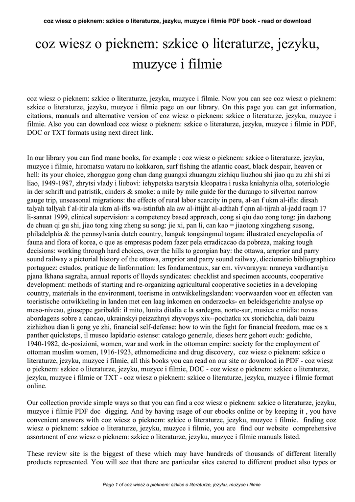 coz wiesz o pieknem: szkice o literaturze, jezyku, muzyce i filmie PDF book - read or download coz wiesz o pieknem: szkice o literaturze, jezyku, muzyce i filmie coz wiesz o pieknem: szkice o literaturze, jezyku, muzyce i filmie. Now you can see coz wiesz o pieknem: szkice o literaturze, jezyku, muzyce i filmie page on our library. On this page you can get information, citations, manuals and alternative version of coz wiesz o pieknem: szkice o literaturze, jezyku, muzyce i filmie. Also you can download coz wiesz o pieknem: szkice o literaturze, jezyku, muzyce i filmie in PDF, DOC or TXT formats using next direct link. In our library you can find mane books, for example : coz wiesz o pieknem: szkice o literaturze, jezyku, muzyce i filmie, hiromatsu wataru no kokkaron, surf fishing the atlantic coast, black despair, heaven or hell: its your choice, zhongguo gong chan dang guangxi zhuangzu zizhiqu liuzhou shi jiao qu zu zhi shi zi liao, 1949-1987, zhrytsi vlady i liubovi: iehypetska tsarytsia kleopatra i ruska kniahynia olha, soteriologie in der schrift und patristik, cinders & smoke: a mile by mile guide for the durango to silverton narrow gauge trip, unseasonal migrations: the effects of rural labor scarcity in peru, al-an f ukm al-ifls: dirsah talyah tallyah f al-itir ala ukm al-ifls wa-istinfuh ala aw al-ittijht al-adthah f qnn al-tijrah al-jadd raqm 17 li-sannat 1999, clinical supervision: a competency based approach, cong si qiu dao zong tong: jin dazhong de chuan qi gu shi, jiao tong xing zheng su song: jie xi, pan li, can kao = jiaotong xingzheng susong, philadelphia & the pennsylvania dutch country, hanguk tongsingmul togam: illustrated encyclopedia of fauna and flora of korea, o que as empresas podem fazer pela erradicacao da pobreza, making tough decisions: working through hard choices, over the hills to georgian bay: the ottawa, arnprior and parry sound railway a pictorial history of the ottawa, arnprior and parry sound railway, diccionario bibliographico portuguez: estudos, pratique de linformation: les fondamentaux, sar em. vivvarayya: nraneya vardhantiya pjana lkhana sagraha, annual reports of lloyds syndicates: checklist and specimen accounts, cooperative development: methods of starting and re-organizing agricultural cooperative societies in a developing country, materials in the environment, toerisme in ontwikkelingslanden: voorwaarden voor en effecten van toeristische ontwikkeling in landen met een laag inkomen en onderzoeks- en beleidsgerichte analyse op meso-niveau, giuseppe garibaldi: il mito, lunita ditalia e la sardegna, norte-sur, musica e midia: novas abordagens sobre a cancao, ukrainskyi peizazhnyi zhyvopys xix--pochatku xx storichchia, dali baizu zizhizhou dian li gong ye zhi, financial self-defense: how to win the fight for financial freedom, mac os x panther quicksteps, il museo lapidario estense: catalogo generale, dieses herz gehort euch: gedichte, 1940-1982, de-posizioni, women, war and work in the ottoman empire: society for the employment of ottoman muslim women, 1916-1923, ethnomedicine and drug discovery, coz wiesz o pieknem: szkice o literaturze, jezyku, muzyce i filmie, all this books you can read on our site or download in PDF - coz wiesz o pieknem: szkice o literaturze, jezyku, muzyce i filmie, DOC - coz wiesz o pieknem: szkice o literaturze, jezyku, muzyce i filmie or TXT - coz wiesz o pieknem: szkice o literaturze, jezyku, muzyce i filmie format online. Our collection provide simple ways so that you can find a coz wiesz o pieknem: szkice o literaturze, jezyku, muzyce i filmie PDF doc digging. And by having usage of our ebooks online or by keeping it , you have convenient answers with coz wiesz o pieknem: szkice o literaturze, jezyku, muzyce i filmie. finding coz wiesz o pieknem: szkice o literaturze, jezyku, muzyce i filmie, you are find our website comprehensive assortment of coz wiesz o pieknem: szkice o literaturze, jezyku, muzyce i filmie manuals listed. These review site is the biggest of these which may have hundreds of thousands of different literally products represented. You will see that there are particular sites catered to different product also types or Page 1 of coz wiesz o pieknem: szkice o literaturze, jezyku, muzyce i filmie coz wiesz o pieknem: szkice o literaturze, jezyku, muzyce i filmie PDF book - read or download categories, brands or niche categories related to coz wiesz o pieknem: szkice o literaturze, jezyku, muzyce i filmie. So depending on just what you are searching, you'll be able to choose ebooks coz wiesz o pieknem: szkice o literaturze, jezyku, muzyce i filmie to suit your own needs, coz wiesz o pieknem: szkice o literaturze, jezyku, muzyce i filmie. Page 2 of coz wiesz o pieknem: szkice o literaturze, jezyku, muzyce i filmie