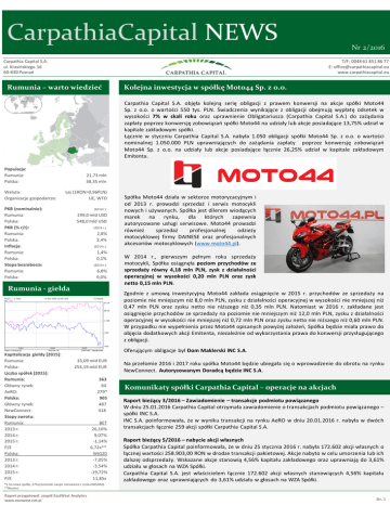 CarpathiaCapital NEWS Carpathia Capital S.A. ul. Krasińskiego 16 60-830 Poznań Nr 2/2016 T/F: 0048 61 851 86 77 E: [email protected] www.carpathiacapital.eu Rumunia – warto wiedzieć Kolejna inwestycja w spółkę Moto44 Sp. z o.o. Carpathia Capital S.A. objęła kolejną serię obligacji z prawem konwersji na akcje spółki Moto44 Sp. z o.o. o wartości 550 tys. PLN. Świadczenia wynikające z obligacji obejmują wypłatę odsetek w wysokości 7% w skali roku oraz uprawnienie Obligatariusza (Carpathia Capital S.A.) do zażądania zapłaty poprzez konwersję zobowiązań spółki Moto44 na udziały lub akcje posiadające 13,75% udział w kapitale zakładowym spółki. Łącznie w styczniu Carpathia Capital S.A. nabyła 1.050 obligacji spółki Moto44 Sp. z o.o. o wartości nominalnej 1.050.000 PLN uprawniających do zażądania zapłaty poprzez konwersję zobowiązań Moto44 Sp. z o.o. na udziały lub akcje posiadające łącznie 26,25% udział w kapitale zakładowym Emitenta. Populacja: Rumunia: Polska: Waluta: Organizacje gospodarcze: 21,73 mln 38,35 mln Lej (1RON=0,96PLN) UE, WTO PKB (nominalnie): Rumunia: Polska: PKB (% r/r): Rumunia: Polska: Inflacja: Rumunia: Polska: Stopa bezrobocia: Rumunia: Polska: (2014 r.) 199,0 mld USD 548,0 mld USD (2014 r.) 2,8% 3,4% (2014 r.) 1,4% 0,1% (2014 r.) 6,8% 9,0% Rumunia - giełda Kapitalizacja giełdy [2015]: Rumunia: Polska: Liczba spółek [2015]: Rumunia: Główny rynek: AeRO: Polska: Główny rynek: NewConnect: Stopy zwrotu: Rumunia: 2013 r: 2014 r: 2015 r: P/E Polska: 2013 r: 2014 r: 2015 r: P/E Spółka Moto44 działa w sektorze motoryzacyjnym i od 2013 r. prowadzi sprzedaż i serwis motocykli nowych i używanych. Spółka jest dilerem wiodących marek na rynku, dla których zapewnia autoryzowane usługi serwisowe. Moto44 prowadzi również sprzedaż profesjonalnej odzieży motocyklowej firmy DAINESE oraz profesjonalnych akcesoriów motocyklowych (www.moto44.pl). W 2014 r., pierwszym pełnym roku sprzedaży motocykli, Spółka osiągnęła poziom przychodów ze sprzedaży równy 4,18 mln PLN, zysk z działalności operacyjnej w wysokości 0,20 mln PLN oraz zysk netto 0,15 mln PLN. Zgodnie z umową inwestycyjną Moto44 zakłada osiągnięcie w 2015 r. przychodów ze sprzedaży na poziomie nie mniejszym niż 8,0 mln PLN, zysku z działalności operacyjnej w wysokości nie mniejszej niż 0,47 mln PLN oraz zysku netto nie niższego niż 0,35 mln PLN. Natomiast w 2016 r. zakładane jest osiągnięcie przychodów ze sprzedaży na poziomie nie mniejszym niż 12,0 mln PLN, zysku z działalności operacyjnej w wysokości nie mniejszej niż 0,72 mln PLN oraz zysku netto nie niższego niż 0,60 mln PLN. W przypadku nie wypełnienia przez Moto44 opisanych powyżej założeń, Spółka będzie miała prawo do objęcia dodatkowych akcji Emitenta, niezależnie od wykorzystania prawa do konwersji przysługującego z obligacji. Oferującym obligacje był Dom Maklerski INC S.A. 33,09 mld EUR 254,19 mld EUR 363 84 279* 905 487 418 BET 26,10% 9,07% -1,14% 6,72x** WIG20 -7,05% -3,54% -19,72% 11,85x Na przełomie 2016 i 2017 roku spółka Moto44 będzie ubiegała się o wprowadzenie do obrotu na rynku NewConnect. Autoryzowanym Doradcą będzie INC S.A. Komunikaty spółki Carpathia Capital – operacje na akcjach Raport bieżący 3/2016 – Zawiadomienie – transakcje podmiotu powiązanego W dniu 25.01.2016 Carpathia Capital otrzymała zawiadomienie o transakcjach podmiotu powiązanego – spółki INC S.A. INC S.A. poinformowała, że w wyniku transakcji na rynku AeRO w dniu 20.01.2016 r. nabyła w dwóch transakcjach łącznie 259 akcji spółki Carpathia Capital S.A. Raport bieżący 5/2016 – nabycie akcji własnych Spółka Carpathia Capital poinformowała, że w dniu 25 stycznia 2016 r. nabyła 172.602 akcji własnych o łącznej wartości 258.903,00 RON w drodze transakcji pakietowej. Akcje nabyto w celu umorzenia lub ich dalszej odsprzedaży. Wskazane akcje stanowią 4,56% kapitału zakładowego oraz uprawniają do 3,61% udziału w głosach na WZA Spółki. Carpathia Capital S.A. jest właścicielem łącznie 172.602 akcji własnych stanowiących 4,56% kapitału zakładowego oraz uprawniających do 3,61% udziału w głosach na WZA Spółki. *5 to nowe spółki, 274 przeniosło swoje notowania z rynku RASDAQ **Reuters Raport przygotował zespół EastWest Analytics www.eastwest.net.pl Str. 1 CarpathiaCapital NEWS Carpathia Capital S.A. ul. Krasińskiego 16 60-830 Poznań T/F: 0048 61 851 86 77 E: [email protected] www.carpathiacapital.eu Przegląd informacji z rynku Bittnet Systems po raz kolejny w rankingu Deloitte Technology Fast 500 14.12.2015 r. Trzynaście rumuńskich spółek w rankingu Deloitte Technology Fast 500 Bittnet Systems, spółka portfelowa Carpathii Capital, już drugi rok z rzędu została ujęta w prestiżowym rankingu Deloitte’s Technology Fast 500 dla Europy, Bliskiego Wschodu i Afryki (EMEA). W tegorocznym rankingi spółka znalazła się na 360. pozycji. Trzynaście rumuńskich spółek znalazło się w prestiżowym rankingu Deloitte’s Technology Fast 500 dla Europy, Bliskiego Wschodu i Afryki (EMEA) w roku 2015. W zeszłorocznym rankingu uwzględnionych zostało 7 rumuńskich spółek z branży IT. Ranking Deloitte uwzględnia najszybciej rozwijające się prywatne i publiczne spółki z branży nowych technologii, mediów, telekomunikacji, nauk przyrodniczych i czystych technologii z ponad 20 krajów regionu. Wyniki rankingu są opracowywane na podstawie przychodów spółki z ostatnich 4 lat. Ranking uwzględnia najszybciej rozwijające się prywatne i publiczne spółki z branży nowych technologii, mediów, telekomunikacji, nauk przyrodniczych i czystych technologii z ponad 20 krajów regionu. Wyniki rankingu są opracowywane na podstawie przychodów spółek z ostatnich 4 lat. Bittnet Systems S.A. zawiązana została w 2007 roku i prowadzi działalność na rynku rozwiązań informatycznych. Spółka jest liderem ry