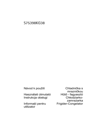 S75398KG38 Návod k použití Használati útmutató Instrukcja obsługi Informaţii pentru utilizator Chladnička s mrazničkou Hűtő - fagyasztó Chłodziarkozamrażarka Frigider-Congelator 2 Obsah Děkujeme, že jste si vybrali jeden z našich vysoce kvalitních výrobků. Přečtěte si prosím pozorně tento návod k použití, abyste zajistili optimální a správný chod svého spotřebiče. Najdete v něm rady k dokonalému a co nejúčinnějšímu používání spotřebiče. Doporučujeme vám, abyste návod uložili na bezpečném místě, a mohli ho kdykoliv znovu použít. Předejte ho prosím i případnému dalšímu majiteli spotřebiče. Přejeme vám s novým spotřebičem hodně radosti. Obsah Bezpečnostní informace 3 Bezpečnost dětí a hendikepovaných osob 3 Všeobecné bezpečnostní informace 3 Denní používání 4 Čištění a údržba 5 Instalace 5 Servis 5 Ovládací panel 6 Zapnutí 6 Vypnutí 6 Displeje teploty 6 Nastavení teploty 7 Funkce COOLMATIC 7 Funkce FROSTMATIC 8 Poplach vysoké teploty 8 Při prvním použití 8 Čistění vnitřku spotřebiče 8 Denní používání 8 Skladování zmrazených potravin 8 Rozmrazování 8 Uhlíkový vzduchový filtr 9 Přemístitelné police 9 Rošt na láhve 9 Zásuvka na zeleninu 10 Umístění dveřních poliček 10 Chladná zóna 10 Vyjmutí mrazicích košů z mrazničky 11 Užitečné rady a tipy 12 Normální provozní zvuky 12 Tipy pro úsporu energie 12 Tipy pro chlazení čerstvých potravin 12 Tipy pro chlazení 12 Tipy pro zmrazování potravin 12 Tipy pro skladování zmrazených potravin 13 Čištění a údržba 13 Pravidelné čištění 13 Výměna uhlíkového vzduchového filtru 14 Odmrazování 14 Co dělat, když... 14 Výměna žárovky 16 Zavření dveří 16 Technické údaje 17 Instalace 17 Umístění 17 Umístění 17 Připojení k elektrické síti 18 Zadní podložky 18 Vyrovnání 18 Odstranění držáků polic 19 Instalace uhlíkového vzduchového filtru 19 Změna směru otvírání dveří 19 Poznámky k životnímu prostředí 21 Zmĕny vyhrazeny Bezpečnostní informace 3 Bezpečnostní informace V zájmu své bezpečnosti a správného chodu spotřebiče si před jeho instalací a prvním použitím pozorně Přečtěte návod k použití včetně rad a upozornění. K ochraně před nežádoucími omyly a nehodami je důležité, aby se všechny osoby, které budou používat tento spotřebič, seznámily s jeho provozem a bezpečnostními funkcemi. Tyto pokyny uschovejte a zajistěte, aby zůstaly u spotřebiče i v případě jeho přestěhování na jiné místo nebo prodeje dalším osobám, aby se tak všichni uživatelé po celou dobu životnosti spotřebiče mohli řádně informovat o jeho používání a bezpečnosti. Dodržujte pokyny uvedené v tomto návodu k použití, abyste neohrozili své zdraví a majetek, a uvědomte si, že výrobce neručí za úrazy a poškození způ‐ sobené jejich nedodržením. Bezpečnost dětí a hendikepovaných osob • Tento spotřebič nesmějí používat osoby (včetně dětí) se sníženými fyzický‐ mi, smyslovými nebo duševními schopnostmi, nebo bez patřičných zkuše‐ ností a znalostí, pokud je nesledují osoby odpovědné za jejich bezpečnost, nebo jim nedávají příslušné pokyny k použití spotřebiče. Na děti je třeba dohlédnout, aby si se spotřebičem nehrály. • Všechny obaly uschovejte z dosahu dětí. Hrozí nebezpečí udušení. • Jestliže likvidujete starý spotřebič, vytáhněte zástrčku ze zásuvky, odřízněte napájecí kabel (co nejblíže u spotřebiče) a odstraňte dveře, aby nedošlo k úrazu dětí elektrickým proudem, nebo se děti nemohly zavřít uvnitř. • Jestliže je tento spotřebič vybaven magnetickým těsněním dveří a nahrazuje starší spotřebič s pružinovým zámkem (západkou) na dveřích nebo víku, nezapomeňte před likvidací pružinový zámek znehodnotit. Děti se pak ne‐ mohou ve spotřebiči zavřít jako ve smrtelně nebezpečné pasti. Všeobecné bezpečnostní informace POZOR Udržujte větrací otvory volně průchodné. • Tento spotřebič je určen k uchování potravin a nápojů v běžné domácnosti, jak je uvedeno v návodu k použití. • K urychlení odmrazování nepoužívejte mechanické ani jiné pomocné prostředky. • V prostoru chladicích spotřebičů nepoužívejte jiné elektrické přístroje (např. zmrzlinové strojky), než typy schválené k tomuto účelu výrobcem. • Nepoškozujte okruh chladicí kapaliny. Bezpečnostní informace 4 • Chladivo isobutan (R600a) je obsaženo v chladicím okruhu spotřebiče; je to zemní plyn s vysokým stupněm slučitelnosti s životním prostředím, ale je hořlavý. Během přepravy a instalace spotřebiče dbejte na to, aby nedošlo k poško‐ zení žádné části chladicího okruhu. Pokud dojde k poškození chladicího okruhu: – odstraňte z blízkosti spotřebiče otevřený plamen a všechny zdroje ohně – důkladně vyvětrejte místnost, ve které je spotřebič umístěný. • Změna technických parametrů nebo jakákoli jiná úprava spotřebiče je ne‐ bezpečná. Jakékoli poškození kabelu může mít za následek zkrat, požár a/ nebo úraz elektrickým proudem. UPOZORNĚNÍ Jakýkoli elektrický díl (napájecí kabel, zástrčka, kompresor) smí vyměnit pouze autorizovaný zástupce servisu nebo kvalifikovaný pracovník servisu. 1. Napájecí kabel nelze nastavovat. 2. Zkontrolujte, zda není zástrčka stlačená nebo poškozená zadní stranou spotřebiče. Stlačená nebo poškozená zástrčka se může přehřát a způ‐ sobit požár. 3. Ověřte si, že je zástrčka spotřebiče dobře přístupná. 4. Netahejte za napájecí kabel. 5. Pokud je zásuvka uvolněná, nezasunujte do ní zástrčku. Hrozí nebez‐ pečí úrazu elektrickým proudem nebo požár. 6. Nespouštějte spotřebič bez krytu žárovky 1) vn