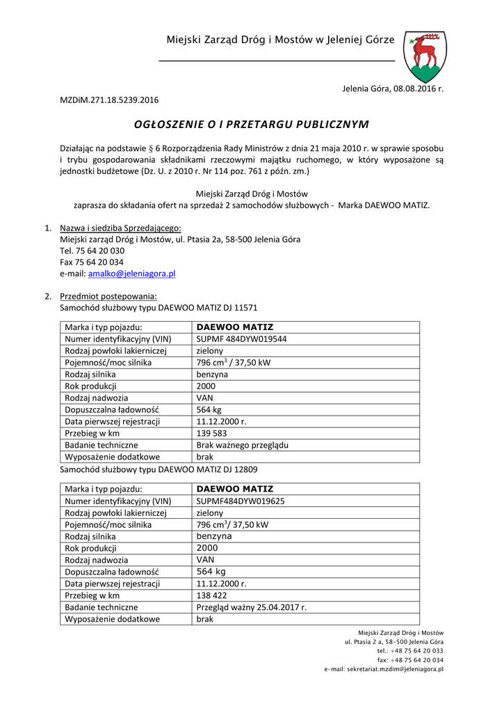 Miejski Zarząd Dróg i Mostów w Jeleniej Górze Jelenia Góra, 08.08.2016 r. MZDiM.271.18.5239.2016 OGŁOSZENIE O I PRZETARGU PUBLICZNYM Działając na podstawie § 6 Rozporządzenia Rady Ministrów z dnia 21 maja 2010 r. w sprawie sposobu i trybu gospodarowania składnikami rzeczowymi majątku ruchomego, w który wyposażone są jednostki budżetowe (Dz. U. z 2010 r. Nr 114 poz. 761 z późn. zm.) Miejski Zarząd Dróg i Mostów zaprasza do składania ofert na sprzedaż 2 samochodów służbowych - Marka DAEWOO MATIZ. 1. Nazwa i siedziba Sprzedającego: Miejski zarząd Dróg i Mostów, ul. Ptasia 2a, 58-500 Jelenia Góra Tel. 75 64 20 030 Fax 75 64 20 034 e-mail: [email protected] 2. Przedmiot postepowania: Samochód służbowy typu DAEWOO MATIZ DJ 11571 DAEWOO MATIZ Marka i typ pojazdu: Numer identyfikacyjny (VIN) SUPMF 484DYW019544 Rodzaj powłoki lakierniczej zielony Pojemność/moc silnika 796 cm3 / 37,50 kW Rodzaj silnika benzyna Rok produkcji 2000 Rodzaj nadwozia VAN Dopuszczalna ładowność 564 kg Data pierwszej rejestracji 11.12.2000 r. Przebieg w km 139 583 Badanie techniczne Brak ważnego przeglądu Wyposażenie dodatkowe brak Samochód służbowy typu DAEWOO MATIZ DJ 12809 Marka i typ pojazdu: Numer identyfikacyjny (VIN) Rodzaj powłoki lakierniczej Pojemność/moc silnika Rodzaj silnika Rok produkcji Rodzaj nadwozia Dopuszczalna ładowność Data pierwszej rejestracji Przebieg w km Badanie techniczne Wyposażenie dodatkowe DAEWOO MATIZ SUPMF484DYW019625 zielony 796 cm3/ 37,50 kW benzyna 2000 VAN 564 kg 11.12.2000 r. 138 422 Przegląd ważny 25.04.2017 r. brak Miejski Zarząd Dróg i Mostów ul. Ptasia 2 a, 58-500 Jelenia Góra tel.: +48 75 64 20 033 fax: +48 75 64 20 034 e-mail: [email protected] Samochody będące przedmiotem zamówienia można obejrzeć w dniach 10-19 sierpnia 2016 w godzinach od 09:00 do 14:00 w siedzibie Sprzedającego tj. w Miejskim Zarządzie Dróg i Mostów, ul. Ptasia 2a, 58-500 Jelenia Góra. 3. Tryb postepowania: a. Postepowanie prowadzone jest w trybie przetargu publicznego; b. Komisja wybierze oferenta, który zaoferuje najwyższą cenę na pojazdy będące przedmiotem przetargu; c. Nabywca zobowiązany jest zapłacić cenę nabycia pojazdu przed podpisaniem umowy kupna – sprzedaży; d. Wydanie przedmiotu sprzedaży nabywcy nastąpi niezwłocznie po podpisaniu umowy kupna – sprzedaży. 4. Termin związania ofertą: Termin związania ofertą sprzedający określa na 7 dni. 5. Cena wywoławcza samochodów: a. Samochód Daewoo Matiz nr rejestracyjny DJ 11571 – 1.300,00 PLN b. Samochód Daewoo Matiz nr rejestracyjny DJ 12809 – 1.400,00 PLN 6. Wadium: a. Oferenci winni okazać dowód wpłacenia wadium w wysokości 5% ceny wywoławczej tj.: 65,00 PLN dla auta Daewoo Matiz nr rejestracyjny DJ 11571 70,00 PLN dla auta Daewoo Matiz nr rejestracyjny DJ 12809 b. Wadium wnosi się wyłącznie w pieniądzu. Wadium należy wpłacić przelewem na następujący rachunek Sprzedającego: Bank Millennium S.A. nr konta 27 1160 2202 0000 0002 9801 3709 c. Wadium złożone przez nabywcę zalicza się na poczet ceny. d. Wadium wpłacone przez oferentów, których oferty nie zostaną przyjęte zostaną zwrócone w ciągu 7 dni po dokonaniu wyboru oferty. e. Wadium nie podlega zwrotowi w przypadku gdy oferent, który wygrał przetarg, uchyli się od zawarcia umowy sprzedaży. 7. Miejsce i termin złożenia oferty: Ofertę należy złożyć w siedzibie Zamawiającego w Miejskim Zarządzie Dróg i Mostów, ul. Ptasia 2a, pok. 1 (sekretariat), 58-500 Jelenia Góra, Polska, w nieprzekraczalnym terminie do dnia 23 sierpnia do godz. 09:00. 8. Termin otwarcia ofert: Otwarcie ofert nastąpi w siedzibie Zamawiającego w Miejskim Zarządzie Dróg i Mostów ul. Ptasia 2a, pokój nr 2, 58-500 Jelenia Góra, Polska, w dniu 23 sierpnia 2016 r. godz. 10:00 Organizatorowi przetargu przysługuje prawo zamknięcia przetargu bez wybrania którejkolwiek z ofert, bez podania przyczyn. 9. Kryterium oceny ofert: Kryterium ofert jest najwyższa cena – 100% ceny Cena nie może być niższa niż cena wywoławcza. 10. Wzór oferty - załącznik Nr 1 do ogłoszenia. 11. Sposób przygotowania oferty: a. Ofertę należy sporządzić w formie pisemnej w języku polskim; b. Złożyć w nieprzezroczystej, zabezpieczonej przed otwarciem kopercie z opisem: Miejski Zarząd Dróg i Mostów ul. Ptasia 2a, pokój nr 1, 58-500 Jelenia Góra Oferta na zadanie pn.: „Zakup 2 samochodów służbowych – Marka Daewoo Matiz” Nr postępowania: MZDiM.271.18.2016 Nazwa i adres Wykonawcy: …………………………………………………………………………………………. Nie otwierać przed dniem 23 sierpnia 2016 r. godz. 10:30 11. Inne informacje: 1) Złożona oferta nie podlega wyjaśnieniom, ani nie może być przedmiotem negocjacji pomiędzy stronami. 2) Komisja przetargowa odrzuca ofertę jeżeli: a. została złożona po wyznaczonym terminie, w niewłaściwym miejscu lub przez oferenta, który nie wniósł wadium, b. oferta jest niekompletna, nieczytelna lub budzi inne wątpliwości, zaś złożenie wyjaśnień mogłoby prowadzić do uznania jej za nową ofertę. 3) O odrzuceniu oferty komisja przetargowa zawiadamia niezwłocznie Oferenta. 4) W przypadku złożenia dwóch lub więcej ofert o tej samej najwyższej cenie, pomiędzy Oferentami, którzy zaproponowali najwyższą cenę, zostanie przeprowadzona aukcja, której ceną wywoławczą będzie cena zaproponowana w ofertach. 5) O terminie ewentualnej aukcji Oferenci zostaną powiadomieni pisemnie, a w przypadku gdy byli obecni przy otwarciu ofert, o którym mowa w pkt. 3, ustnie, podczas otwarcia. 6) Umowę uznaje się za zawartą z chwilą wyboru najkorzystniejszej oferty w przypadku przetargu lub z chwilą ostatniego przebicia niższej ceny w przypadku aukcji. 12. Termin zawarcia umowy sprzedaży: 1) Zawarcie umowy sprzedaży nastąpi po wyborze przez komisję przetargową najkorzystniejszej oferty. 2) Nabywca jest zobowi