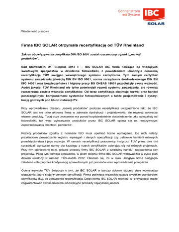 Firma IBC SOLAR otrzymała recertyfikację od TÜV Rheinland