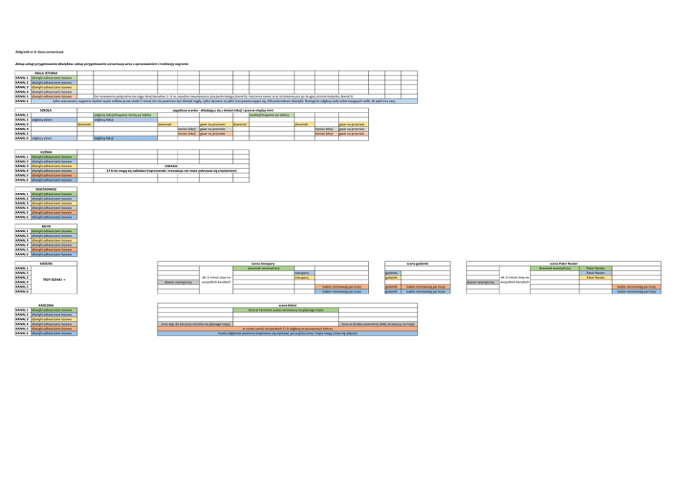 Załącznik nr 3: Zarys scenariusza Zakup usługi przygotowania dźwięków: zakup przygotowania scenariuszy wraz z opracowaniem i realizacją nagrania KANAŁ 1 KANAŁ 2 KANAŁ 3 KANAŁ 4 KANAŁ 5 KANAŁ 6 MAŁA ISTEBNA dźwięki odtwarzane losowo dźwięki odtwarzane losowo dźwięki odtwarzane losowo dźwięki odtwarzane losowo dźwięki odtwarzane losowo Do rozważenia połączenie (w ciągu dnia) kanałów 5 i 6 na zasadzie nawoływania psa pasterskiego (kanał 6) i beczenia owiec oraz szczekania psa po drugiej stronie budynku (kanał 5) tylko wieczorem, najpierw słychać wycie wilków przez około 5 minut (to nie powinien być dźwięk ciągły, tylko słyszane co jakiś czas powtarzające się, kilkusekundowe dźwięki). Następnie odgłosy ludzi odstraszających wilki. W pętli trzy razy. SZKOŁA KANAŁ 1 KANAŁ 2 odgłosy dzieci KANAŁ 3 KANAŁ 4 KANAŁ 5 KANAŁ 6 odgłosy dzieci KANAŁ 1 KANAŁ 2 KANAŁ 3 KANAŁ 4 KANAŁ 5 KANAŁ 6 KUŹNIA dźwięki odtwarzane losowo dźwięki odtwarzane losowo dźwięki odtwarzane losowo dźwięki odtwarzane losowo dźwięki odtwarzane losowo dźwięki odtwarzane losowo KANAŁ 1 KANAŁ 2 KANAŁ 3 KANAŁ 4 KANAŁ 5 KANAŁ 6 DZIEĆKOWICE dźwięki odtwarzane losowo dźwięki odtwarzane losowo dźwięki odtwarzane losowo dźwięki odtwarzane losowo dźwięki odtwarzane losowo dźwięki odtwarzane losowo KANAŁ 1 KANAŁ 2 KANAŁ 3 KANAŁ 4 KANAŁ 5 KANAŁ 6 MŁYN dźwięki odtwarzane losowo dźwięki odtwarzane losowo dźwięki odtwarzane losowo dźwięki odtwarzane losowo dźwięki odtwarzane losowo dźwięki odtwarzane losowo zapętlona scenka - składająca się z dwóch lekcji i przerw między nimi wykład/drapanie po tablicy odgłosy lekcji/drapanie kredą po tablicy odgłosy lekcji dzwonek dzwonek koniec lekcji koniec lekcji gwar na przerwie gwar na przerwie gwar na przerwie KANAŁ 1 KANAŁ 2 KANAŁ 3 KANAŁ 4 KANAŁ 5 KANAŁ 6 TRZY SCENKI -> dzwonek koniec lekcji koniec lekcji gwar na przerwie gwar na przerwie gwar na przerwie odgłosy lekcji UWAGA: 3 i 4 nie mogą się nakładać (reprymenda i transakcja nie może pokrywać się z kasłaniem) KOŚCIÓŁ KANAŁ 1 KANAŁ 2 KANAŁ 3 KANAŁ 4 KANAŁ 5 KANAŁ 6 dzwonek scena nieszpory dzwonek wewnętrzny dzwon zewnętrzny ok. 5 minut ciszy na wszystkich kanałach scena godzinki nieszpory nieszpory godzinki godzinki dzwon zewnętrzny ludzie rozmawiają po mszy ludzie rozmawiają po mszy KARCZMA dźwięki odtwarzane losowo dźwięki odtwarzane losowo dźwięki odtwarzane losowo dźwięki odtwarzane losowo dźwięki odtwarzane losowo dźwięki odtwarzane losowo godzinki godzinki ludzie rozmawiają po mszy ludzie rozmawiają po mszy scena kłótni żona w karczmie szuka i wrzeszczy na pijanego męża żona idąc do karczmy narzeka na pijanego mężą scena Pater Noster dzwonek wewnętrzny żona w drodze powrotnej dalej wrzeszczy na męża w czasie scenki na kanałach 5 i 6 odgłosy przesuwanych talerzy reszta odgłosów powinna stopniowo się wyciszać, po wyjściu żony i męża mogą znów się włączyć ok. 5 minut ciszy na wszystkich kanałach Pater Noster Pater Noster Pater Noster ludzie rozmawiają po mszy ludzie rozmawiają po mszy