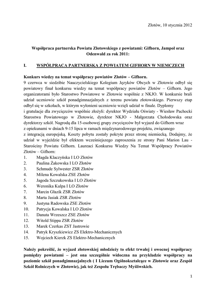 Złotów, 10 stycznia 2012 Współpraca partnerska Powiatu Złotowskiego z powiatami: Gifhorn, Jampol oraz Odenwald za rok 2011: I. WSPÓŁPRACA PARTNERSKA Z POWIATEM GIFHORN W NIEMCZECH Konkurs wiedzy na temat współpracy powiatów Złotów – Gifhorn. 9 czerwca w siedzibie Nauczycielskiego Kolegium Języków Obcych w Złotowie odbył się powiatowy finał konkursu wiedzy na temat współpracy powiatów Złotów – Gifhorn. Jego organizatorami było Starostwo Powiatowe w Złotowie wspólnie z NKJO. W konkursie brali udział uczniowie szkół ponadgimnazjalnych z terenu powiatu złotowskiego. Pierwszy etap odbył się w szkołach, w którym wyłonieni uczniowie wzięli udział w finale. Dyplomy i gratulacje dla zwycięzców wspólnie złożyli: dyrektor Wydziału Oświaty - Wiesław Pachocki Starostwa Powiatowego w Złotowie, dyrektor NKJO - Małgorzata Chołodowska oraz dyrektorzy szkół. Nagrodą dla 15-osobowej grupy zwycięzców był wyjazd do Gifhorn wraz z opiekunami w dniach 9-15 lipca w ramach międzynarodowego projektu, związanego z integracją europejską. Koszty pobytu zostały pokryte przez stronę niemiecką. Dodajmy, że udział w wyjeździe był efektem wcześniejszego zaproszenia ze strony Pani Marion Lau Starościny Powiatu Gifhorn. Laureaci Konkursu Wiedzy Na Temat Współpracy Powiatów Złotów – Gifhorn: 1. Magda Klaczyńska I LO Złotów 2. Paulina Żakowska I LO Złotów 3. Schmude Sylwester ZSR Złotów 4. Milena Kowalska ZSE Złotów 5. Jagoda Szczukowska I LO Złotów 6. Weronika Kulpa I LO Złotów 7. Marcin Głazik ZSR Złotów 8. Marta Jasiak ZSR Złotów 9. Justyna Radowska ZSE Złotów 10. Patrycja Kowalska I LO Złotów 11. Danuta Wrzeszcz ZSE Złotów 12. Witold Stippa ZSR Złotów 13. Marek Czerkas ZST Jastrowie 14. Patryk Kryszkiewicz ZS Elektro-Mechanicznych 15. Wojciech Kierzk ZS Elektro-Mechanicznych Należy pokreślić, że wyjazd złotowskiej młodzieży to efekt trwałej i owocnej współpracy pomiędzy powiatami – jest ona szczególnie widoczna na przykładzie współpracy na poziomie szkół ponadgimnazjalnych ( I Liceum Ogólnokształcące w Złotowie oraz Zespół Szkół Rolniczych w Złotowie), jak też Zespołu Trębaczy Myśliwskich. 1 Projekt polsko-niemiecki „Sygnały myśliwskie ponad granicami”. W ramach działań zrealizowano wymianę zespołów trębaczy myśliwskich ze Złotowa i niemieckiego miasta Gifhorn. Zaprezentowano szereg koncertów dla lokalnej publiczności wraz z rejestracją dźwiękową na płycie CD. Zainscenizowano polowanie na niedźwiedzia wg scen z „Pana Tadeusza” A. Mickiewicza w oprawie sygnałów myśliwskich. Projekt służył promocji regionów i integracji pomiędzy mieszkańcami partnerskich powiatów, których łączy wspólna pasja. W dniach 1-3.10.2010 r. odbyła się wizyta w Gifhorn – spotkanie z zespołami trębaczy myśliwskich w Meinersen i Hillersee , koncert podczas „Zielonego wieczoru” zorganizowanego z okazji jubileuszu 50 – lecia zespołu z Hillersee. Ponadto zespół uczestniczył w zwiedzaniu muzeum młynów, centrum wydry, zakładów produkcyjnych VW. W listopadzie 2011 roku miała miejsce rewizyta trębaczy z Gifhorn, podczas której odbył się wspólny koncert zespołów ze Złotowa i Gifhorn, a także – co wynikało z ustaleń poczynionych podczas wizyty w Niemczech – odsłonięcie obelisku (pamiątkowego kamienia) upamiętniającego dotychczasową współpracę. Wizyta w partnerskim Powiecie Gifhorn. W dniach 3-5 czerwca delegacja samorządu Powiatu Złotowskiego i Miasta Złotowa gościła w partnerskim powiecie Gifhorn w Dolnej Saksoni w Niemczech. Powiat Złotowski reprezentowali: Starosta Złotowski - Ryszard Goławski, Dyrektor Wydziału Promocji i Rozwoju Starostwa Powiatowego w Złotowie - Przemysław Maliszewski, Przewodniczący Rady Miejskiej w Złotowie - Stanisław Pikulik, radna - Mariola Wegner oraz Jan Tuschik z Lipki. Delegacja została zaproszona na uroczyste posiedzenie Stowarzyszenia Heimatskreis Flatow. Historia stowarzyszenia rozpoczyna się tuż po II Wojnie Światowej, kiedy to niemieccy mieszkańcy powiatu złotowskiego wyemigrowali do zachodnich Niemiec. Część z nich trafiła do Gifhorn, gdzie postanowiono zainicjować powstanie związku skupiającego dawnych mieszkańców ziemi złotowskiej. Delegacja złotowska uczestniczyła w oficjalnej uroczystości poświęconej Stowarzyszeniu Heimatskreis Flatow, podczas których obie strony spotkania polska i niemiecka wygłosiły przemówienia dotyczące programu dalszej, ścisłej współpracy. Stronę niemiecką reprezentowała pani Marion Lau 0- Starosta Powiatu Gifhorn, oraz Burmistrz Miasta Gifhorn - Manfred Birth. Starosta - Ryszard Goławski podczas wystąpienia przypomniał kierunki rozszerzania dalszej współpracy oraz mocne więzi łączące powiat złotowski z powiatem Gifhorn, kiedy to w kwietniu 2003 roku podpisano oficjalne porozumienie partnerskie. Starosta nawiązał również do spotkań młodzieży złotowskich szkół z ich niemieckimi rówieśnikami oraz podziękował inicjatorom wieloletniej współpracy polskoniemieckiej. Zaznaczył, iż jest to dobry fundament dla rozwijania dalszego partnerstwa. Przypomnijmy, że zgodnie z założeniami porozumienia współpraca rozwija się m.in. na płaszczyźnie promocji regionalnej, wymiany młodzieży oraz nawiązywania kontaktów gospodarczych. Szczególnie ważne są także inicjatywy w nawiązaniu prywatnych kontaktów. Wspólne funkcjonowanie we wspólnocie europejskiej wymaga nawiązywania i pogłębiania kontaktów z partnerami zagranicznymi oraz jest szansą na rozwój regionalny i zacieśnienie kontaktów międzyludzkich. Kolejnym punktem pobytu w Gifhorn był udział delegacji złotowskiej w odwiedzeniu Izby Pamięci (Heimatstube) dawnego powiatu złotowskiego, gdzie 2 zgromadzono szereg pamiątek, m.in. fotografii, pocztówek, portretów i makiet budowli. Zwiedzano także Muzeum Wiatraków i Młynów w Gifhorn, które