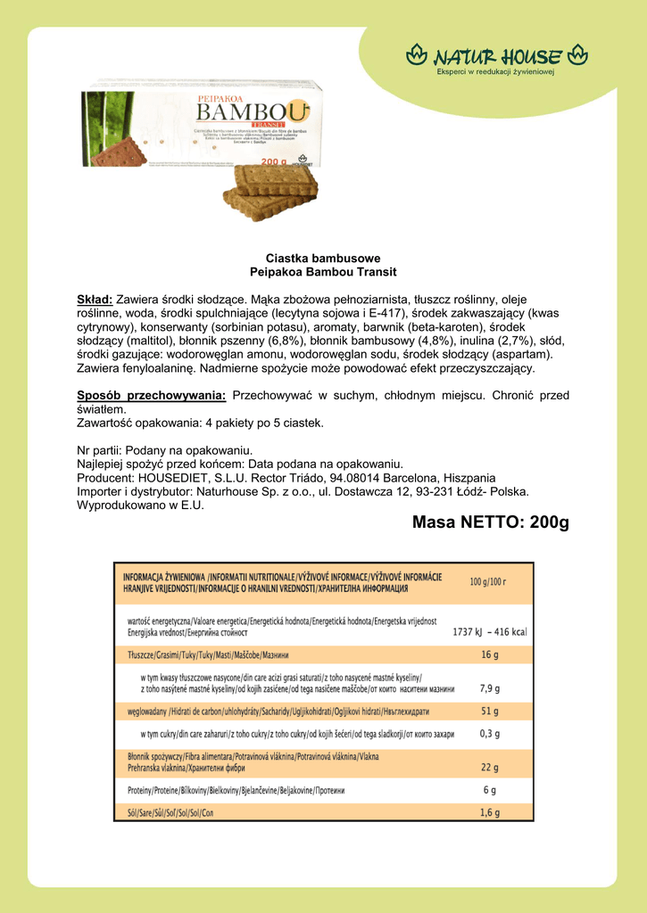 Ciastka bambusowe Peipakoa Bambou Transit Skład: Zawiera środki słodzące. Mąka zbożowa pełnoziarnista, tłuszcz roślinny, oleje roślinne, woda, środki spulchniające (lecytyna sojowa i E-417), środek zakwaszający (kwas cytrynowy), konserwanty (sorbinian potasu), aromaty, barwnik (beta-karoten), środek słodzący (maltitol), błonnik pszenny (6,8%), błonnik bambusowy (4,8%), inulina (2,7%), słód, środki gazujące: wodorowęglan amonu, wodorowęglan sodu, środek słodzący (aspartam). Zawiera fenyloalaninę. Nadmierne spożycie może powodować efekt przeczyszczający. Sposób przechowywania: Przechowywać w suchym, chłodnym miejscu. Chronić przed światłem. Zawartość opakowania: 4 pakiety po 5 ciastek. Nr partii: Podany na opakowaniu. Najlepiej spożyć przed końcem: Data podana na opakowaniu. Producent: HOUSEDIET, S.L.U. Rector Triádo, 94.08014 Barcelona, Hiszpania Importer i dystrybutor: Naturhouse Sp. z o.o., ul. Dostawcza 12, 93-231 Łódź- Polska. Wyprodukowano w E.U. Masa NETTO: 200g