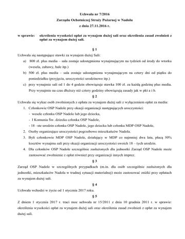 Uchwała nr 7/2016 Zarządu Ochotniczej Straży Pożarnej w Nadolu z dnia 27.11.2016 r. w sprawie: określenia wysokości opłat za wynajem dużej sali oraz określenia zasad zwolnień z opłat za wynajem dużej sali. §1 Uchwala się następujące stawki za wynajem dużej Sali: a) 800 zł. plus media – sala zostaje udostępniona wynajmującym na tydzień od środy do wtorku (wesela, zabawy, bale itp.) b) 500 zł. plus media – sala zostaje udostępniona wynajmującym na cztery dni od piątku do poniedziałku (przyjęcia, uroczystości urodzinowe itp.) c) przy wynajmie sali od 1 do 4 godzin obowiązuje stawka 100 zł. za każdą godzinę plus media. Przy wynajmie na czas dłuższy niż cztery godziny obowiązują zasady jak w pkt a i b. §2 Uchwala się wykaz osób zwolnionych z opłata za wynajem dużej sali z wyłączeniem opłat za media: 1. Członkowie OSP Nadole przy okazji organizacji następujących uroczystości: - wesele członka OSP Nadole lub jego dziecka, - I Komunia Św. dziecka członka OSP Nadole, - 18 –ste urodzin członka OSP Nadole, jego dziecka lub członka MDP OSP Nadole, 2. Osoby organizujące uroczystości pogrzebowe mieszkańców Nadola. 3. Byli członkowie MDP OSP Nadole, działający w MDP co najmniej dwa lata, płacą 50% kosztów wynajmu sali przy okazji organizacji uroczystości swoich 18 – tych urodzin. 4. Dla członków OSP Nadole szczególnie zasłużonych dla jednostki Zarząd OSP Nadole może zastosować zwolnienie z opłat również przy organizacji innych imprez. §3 Zarząd OSP Nadole w szczególnych przypadkach (m.in. dla osób szczególnie zasłużonych dla jednostki, mieszkańców Nadola w trudnej sytuacji materialnej) może zastosować zniżki przy opłatach za wynajem dużej sali. §4 Uchwała wchodzi w życie od 1 stycznia 2017 roku. §5 Z dniem 1 stycznia 2017 r. traci moc uchwała nr 15/2011 z dnia 10 grudnia 2011 r. w sprawie: określenia wysokości opłat za wynajem dużej sali oraz określenia zasad zwolnień z opłat za wynajem dużej sali.