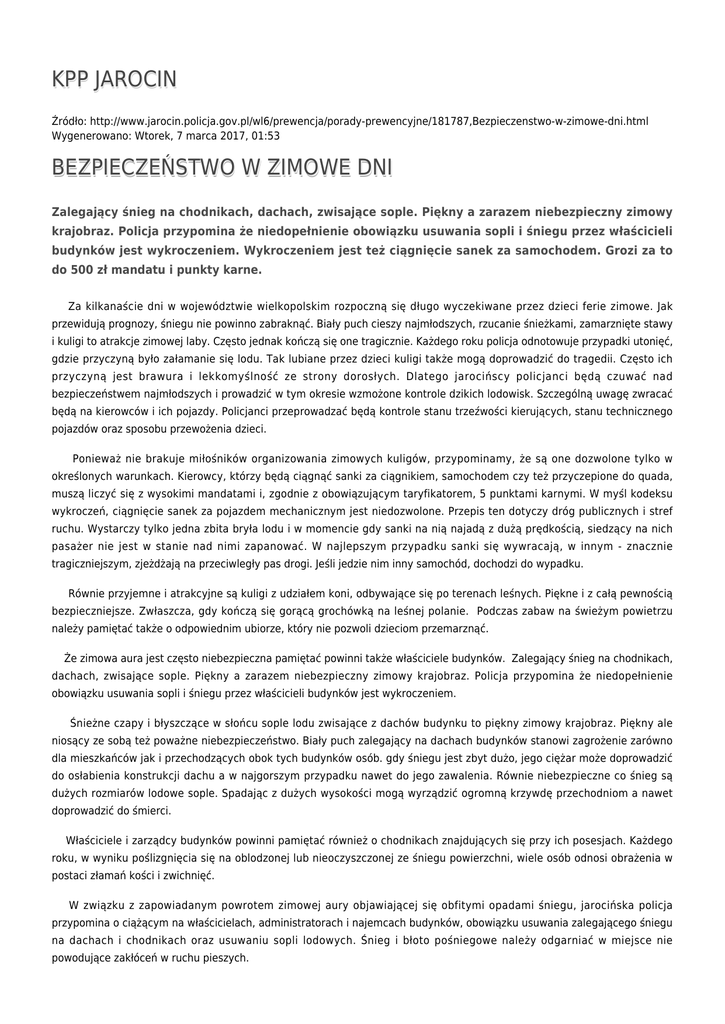 KPP JAROCIN Źródło: http://www.jarocin.policja.gov.pl/wl6/prewencja/porady-prewencyjne/181787,Bezpieczenstwo-w-zimowe-dni.html Wygenerowano: Wtorek, 7 marca 2017, 01:53 BEZPIECZEŃSTWO W ZIMOWE DNI Zalegający śnieg na chodnikach, dachach, zwisające sople. Piękny a zarazem niebezpieczny zimowy krajobraz. Policja przypomina że niedopełnienie obowiązku usuwania sopli i śniegu przez właścicieli budynków jest wykroczeniem. Wykroczeniem jest też ciągnięcie sanek za samochodem. Grozi za to do 500 zł mandatu i punkty karne. Za kilkanaście dni w województwie wielkopolskim rozpoczną się długo wyczekiwane przez dzieci ferie zimowe. Jak przewidują prognozy, śniegu nie powinno zabraknąć. Biały puch cieszy najmłodszych, rzucanie śnieżkami, zamarznięte stawy i kuligi to atrakcje zimowej laby. Często jednak kończą się one tragicznie. Każdego roku policja odnotowuje przypadki utonięć, gdzie przyczyną było załamanie się lodu. Tak lubiane przez dzieci kuligi także mogą doprowadzić do tragedii. Często ich przyczyną jest brawura i lekkomyślność ze strony dorosłych. Dlatego jarocińscy policjanci będą czuwać nad bezpieczeństwem najmłodszych i prowadzić w tym okresie wzmożone kontrole dzikich lodowisk. Szczególną uwagę zwracać będą na kierowców i ich pojazdy. Policjanci przeprowadzać będą kontrole stanu trzeźwości kierujących, stanu technicznego pojazdów oraz sposobu przewożenia dzieci. Ponieważ nie brakuje miłośników organizowania zimowych kuligów, przypominamy, że są one dozwolone tylko w określonych warunkach. Kierowcy, którzy będą ciągnąć sanki za ciągnikiem, samochodem czy też przyczepione do quada, muszą liczyć się z wysokimi mandatami i, zgodnie z obowiązującym taryfikatorem, 5 punktami karnymi. W myśl kodeksu wykroczeń, ciągnięcie sanek za pojazdem mechanicznym jest niedozwolone. Przepis ten dotyczy dróg publicznych i stref ruchu. Wystarczy tylko jedna zbita bryła lodu i w momencie gdy sanki na nią najadą z dużą prędkością, siedzący na nich pasażer nie jest w stanie nad nimi zapanować. W najlepszym przypadku sanki się wywracają, w innym - znacznie tragiczniejszym, zjeżdżają na przeciwległy pas drogi. Jeśli jedzie nim inny samochód, dochodzi do wypadku. Równie przyjemne i atrakcyjne są kuligi z udziałem koni, odbywające się po terenach leśnych. Piękne i z całą pewnością bezpieczniejsze. Zwłaszcza, gdy kończą się gorącą grochówką na leśnej polanie. Podczas zabaw na świeżym powietrzu należy pamiętać także o odpowiednim ubiorze, który nie pozwoli dzieciom przemarznąć. Że zimowa aura jest często niebezpieczna pamiętać powinni także właściciele budynków. Zalegający śnieg na chodnikach, dachach, zwisające sople. Piękny a zarazem niebezpieczny zimowy krajobraz. Policja przypomina że niedopełnienie obowiązku usuwania sopli i śniegu przez właścicieli budynków jest wykroczeniem. Śnieżne czapy i błyszczące w słońcu sople lodu zwisające z dachów budynku to piękny zimowy krajobraz. Piękny ale niosący ze sobą też poważne niebezpieczeństwo. Biały puch zalegający na dachach budynków stanowi zagrożenie zarówno dla mieszkańców jak i przechodzących obok tych budynków osób. gdy śniegu jest zbyt dużo, jego ciężar może doprowadzić do osłabienia konstrukcji dachu a w najgorszym przypadku nawet do jego zawalenia. Równie niebezpieczne co śnieg są dużych rozmiarów lodowe sople. Spadając z dużych wysokości mogą wyrządzić ogromną krzywdę przechodniom a nawet doprowadzić do śmierci. Właściciele i zarządcy budynków powinni pamiętać również o chodnikach znajdujących się przy ich posesjach. Każdego roku, w wyniku poślizgnięcia się na oblodzonej lub nieoczyszczonej ze śniegu powierzchni, wiele osób odnosi obrażenia w postaci złamań kości i zwichnięć. W związku z zapowiadanym powrotem zimowej aury objawiającej się obfitymi opadami śniegu, jarocińska policja przypomina o ciążącym na właścicielach, administratorach i najemcach budynków, obowiązku usuwania zalegającego śniegu na dachach i chodnikach oraz usuwaniu sopli lodowych. Śnieg i błoto pośniegowe należy odgarniać w miejsce nie powodujące zakłóceń w ruchu pieszych. Zabronione jest uprzątanie śniegu, lodu, błota i innych zanieczyszczeń z chodników na teren jezdni oraz składowania pod drzewami: śniegu, lodu, błota pośniegowego zawierających środki chemiczne używane do usuwania śliskości. Osoby, które nie przestrzegają powyższych przepisów podlegają karze: - za uchylanie się od obowiązku uprzątania chodnika ze śniegu, lodu i błota pośniegowego oraz likwidacja śliskości – 100 zł mandatu bądź grzywną nawet do 1500 zł, - za uchylanie się od obowiązku uprzątania zwisających sopli i nawisów śnieżnych z dachu – do 500 zł. Ocena: 0/5 (0) Tweetnij