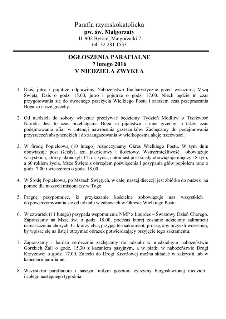Parafia rzymskokatolicka pw. św. Małgorzaty 41-902 Bytom, Małgorzatki 7 tel: 32 281 1533 OGŁOSZENIA PARAFIALNE 7 lutego 2016 V NIEDZIELA ZWYKŁA 1. Dziś, jutro i pojutrze odprawimy Nabożeństwo Eucharystyczne przed wieczorną Mszą Świętą. Dziś o godz. 15.00, jutro i pojutrze o godz. 17.00. Niech będzie to czas przygotowania się do owocnego przeżycia Wielkiego Postu i zarazem czas przepraszania Boga za nasze grzechy. 2. Od niedzieli do soboty włącznie przeżywać będziemy Tydzień Modlitw o Trzeźwość Narodu. Jest to czas przebłagania Boga za pijaństwo i inne grzechy, a także czas podejmowania ofiar w intencji nawrócenia grzeszników. Zachęcamy do podejmowania przyrzeczeń abstynenckich i do zaangażowania w wielkopostną akcję trzeźwości. 3. W Środę Popielcową (10 lutego) rozpoczynamy Okres Wielkiego Postu. W tym dniu obowiązuje post (ścisły), tzn. jakościowy i ilościowy. Wstrzemięźliwość obowiązuje wszystkich, którzy ukończyli 14 rok życia, natomiast post ścisły obowiązuje między 18-tym, a 60 rokiem życia. Msze Święte z obrzędem poświęcenia i posypania głów popiołem rano o godz. 7.00 i wieczorem o godz. 18.00. 4. W Środę Popielcową, po Mszach Świętych, w całej naszej diecezji jest zbiórka do puszek na pomoc dla naszych misjonarzy w Togo. 5. Pragnę przypomnieć, iż przykazanie kościelne zobowiązuje nas wszystkich do powstrzymywania się od udziału w zabawach w Okresie Wielkiego Postu. 6. W czwartek (11 lutego) przypada wspomnienie NMP z Lourdes – Światowy Dzień Chorego. Zapraszamy na Mszę św. o godz. 18.00, podczas której zostanie udzielony sakrament namaszczenia chorych. Ci którzy chcą przyjąć ten sakrament, proszę, aby przyszli wcześniej, by wpisać się na listę i otrzymać obrazek potwierdzający przyjęcie tego sakramentu. 7. Zapraszamy i bardzo serdecznie zachęcamy do udziału w niedzielnym nabożeństwie Gorzkich Żali o godz. 15.30 z kazaniem pasyjnym, a w piątki w nabożeństwie Drogi Krzyżowej o godz. 17.00. Zalecki do Drogi Krzyżowej można składać w zakrystii lub w kancelarii parafialnej. 8. Wszystkim parafianom i naszym miłym gościom życzymy błogosławionej niedzieli i całego następnego tygodnia.