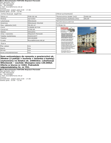 Biuro Nieruchomości FORTUNA Wojciech Pierowski Plac Wolności 16/1 87-800 Włocławek tel.: 501262600 e-mail: [email protected] Czynne: poniedziałek- piątek godz.9.00 - 17.00 sobota godz. 10.00 - 12.00 Informacje ogólne Nieruchomość Oferta nr FOR-DS-46 Powierzchnia działki [m2] 2400.00 Rodzaj sprzedaż Powierzchnia użytkowa [m2] 50,00 Lokalizacja Włocławek Dzielnica Włocławek Wschód Pow. całkowita [m2] 50.00 m² Cena 135000.00 PLN Cena/m2 2700.00 Status aktualna Imię i nazwisko Wojciech Pierowski Telefon komórkowy 542314477 Telefon 501262600 E-mail [email protected] Opis Plac zabaw nie Alarm nie Winda nie Drzwi antywłamaniowe nie Dom wolnostojący do remontu o powierzchni ok. 50mkw (2 pokoje + kuchnia + łazienka z toaletą) usytuowany na działce ok. 2400mkw. Lokalizacja Włocławek – wschód. Okazyjna cena 135.000zł. Oferta w biurze nr 3202. Pośrednik odpowiedzialny lic. nr 791. Biuro Nieruchomości FORTUNA Wojciech Pierowski Plac Wolności 16/1 87-800 Włocławek tel.: 501262600 e-mail: [email protected] Czynne: poniedziałek- piątek godz.9.00 - 17.00 sobota godz. 10.00 - 12.00 Pomieszczenia Zdjęcia