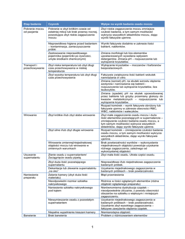 Etap badania Czynnik Wpływ na wynik badania osadu moczu Pobranie moczu od pacjenta Pobranie w zbyt krótkim czasie od ostatniej mikcji lub brak przerwy nocnej, powodujące zbyt niskie zagęszczenie moczu Zbyt niskie zagęszczenie moczu zmniejsza czułość badania, a tym samym możliwość wykrycia wszystkich składników moczu, dając wyniki fałszywie ujemne. Nieprawidłowa higiena przed badaniem – kontaminacja, zanieczyszczenie próbki Zastosowanie nieprawidłowego pojemnika (pojemniki po żywności, umyte środkami chemicznymi) Wyniki fałszywie dodatnie w zakresie ilości bakterii, nabłonków. Transport i przechowywanie Wirowanie Zbyt niska temperatura lub zbyt długi czas przechowywania w niskiej temperaturze Zbyt wysoka temperatura lub zbyt długi czas przechowywania Zbyt krótkie i/lub zbyt słabe wirowanie Zbyt silne i/lub zbyt długie wirowanie Wirowanie zmiennej/niejednakowej objętości moczu lub wirowanie w zmiennych warunkach Usuwanie supernatantu Zlanie osadu z supernatantem/ Zaciągnięcie osadu pipetą. Naniesienie preparatu Zbyt duża ilość pozostającego supernatantu Dekantacja lub zlewanie supernatatntu „na oko” Zalanie kamery (zbyt duża ilość materiału) Nieodpowiedni rozmiar szkiełka nakrywkowego Naniesienie szkiełka nakrywkowego pod kątem Niewymieszanie osadu z pozostałym supernatantem Barwienie Niepełne wypełnienie kieszeni kamery Brak barwienia 1 Zmiana morfologii lub liza elementów upostaciowanych wywołana wpływem detergentów. Zmiana pH – rozpuszczenie lub wytrącenie kryształów. Wytrącanie kryształów – moczanów i fosforanów bezpostaciowych Fałszywie zwiększona ilość bakterii wskutek namnażania in vitro. Zmiana (wzrost) pH, na skutek wzrostu stężenia azotynów i namnażania się bakterii rozpuszczenie lub wytrącenie kryształów, liza leukocytów. Zmiana (spadek) pH na skutek spowodowanej przez bakterie lub grzyby przemiany glukozy do kwasów metabolicznych – rozpuszczenie lub wytrącenie kryształów. Rozpad komórek – wynik fałszywie obniżony lub fałszywie ujemny w zakresie obecności RBC, WBC, nabłonków i wałeczków. Zbyt małe zagęszczenie osadu moczu i duża ilość elementów pozostających w supernatancie – zmniejszenie czułości badania osadu moczu, a tym samym możliwości wykrycia wszystkich składników, dając wyniki fałszywie ujemne. Rozpad komórek – zmniejszenie czułości badania osadu moczu, a tym samym możliwości wykrycia wszystkich składników, dając wyniki fałszywie ujemne. Brak powtarzalności wyników – wykorzystanie niejednakowych objętości powoduje uzyskanie różnego zagęszczenia, zależnego od wykorzystanej objętości. Zbyt mała ilość osadu. Utrata części osadu. Nieprawidłowe i/lub niejednakowe zagęszczenie badanych próbek. Uzyskanie niejednakowego zagęszczenia w badanych próbkach – brak powtarzalności. Błąd przeniesienia Różnice w ilości oglądanych elementów (różna objętość oglądanego preparatu) Nierównomierna dystrybucja cząstek – nieodpowiednie zliczanie, z powodu obecności obszarów na szkiełku o większym i mniejszym zagęszczeniu. Uzyskanie niejednakowego zagęszczenia w badanych próbkach – brak powtarzalności. Uzyskanie zbyt wysokiego zagęszczenia – fałszywe zawyżenie stężenia cząstek. Niemiarodajna objętość. Problem z różnicowaniem elementów Etap badania Czynnik Wpływ na wynik badania osadu moczu Ocena mikroskopowa Subiektywna ocena upostaciowanych w niewybarwionym preparacie. Różna wartość wyniku zależna od doświadczenia i wiedzy osoby oceniającej. Obiektywy o różnej charakterystyce liczby polowej – uzyskanie innej średnicy pola nawet przy tym samym powiększeniu Niewystarczająca rozdzielczość układu soczewek Nieprawidłowa konserwacja mikroskopu Brak standaryzacji oceny ilości pół Niereprezentatywna ilość pól widzenia. Niewłaściwy dobór powiększenia do ocenianych elementów. Użycie mikroskopu świetlnego zamiast kontrastowo-fazowego Ustawienie mikroskopu (natężenie światła, mikroskopy różnych producentów) Raportowanie wyniku Używanie prostej skali do raportowania wyniku Raportowanie wyniku jako liczba cząstek/pole widzenia Różna ilość elementów w „polu widzenia”, nawet przy ocenie tego samego preparatu Brak możliwości właściwej klasyfikacji cząstek Zanieczyszczenia na układzie optycznym, rozmazany lub niewyraźny obraz Brak powtarzalności wyniku. Brak identyfikacji niektórych elementów osadu / niewłaściwa identyfikacja Trudności z różnicowaniem elementów upostaciowanych Zmienność objętości pola widzenia (przy tym samym powiększeniu). Zbyt oświetlony lub ciemny preparat - trudności z identyfikacją elementów Brak możliwości porównania ilościowego utrudnia właściwą interpretację i monitorowanie wyników pacjenta Zastosowanie różnych obiektywów może wpływać na uzyskanie różnych wyników przy ocenie tego samego preparatu – brak możliwości porównania wyników Tabela 1 Wpływ czynników przedanalitycznych i analitycznych na wynik badania osadu moczu 2