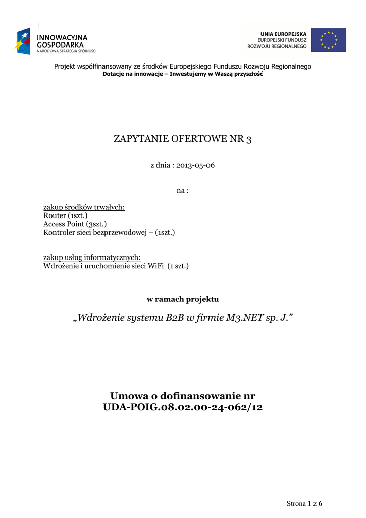 Projekt współfinansowany ze środków Europejskiego Funduszu Rozwoju Regionalnego Dotacje na innowacje – Inwestujemy w Waszą przyszłość ZAPYTANIE OFERTOWE NR 3 z dnia : 2013-05-06 na : zakup środków trwałych: Router (1szt.) Access Point (3szt.) Kontroler sieci bezprzewodowej – (1szt.) zakup usług informatycznych: Wdrożenie i uruchomienie sieci WiFi (1 szt.) w ramach projektu „Wdrożenie systemu B2B w firmie M3.NET sp. J.” Umowa o dofinansowanie nr UDA-POIG.08.02.00-24-062/12 Strona 1 z 6 Projekt współfinansowany ze środków Europejskiego Funduszu Rozwoju Regionalnego Dotacje na innowacje – Inwestujemy w Waszą przyszłość Firma M3.NET R.Niesyt M.Uczniak W.Wardas Sp. J. stosując zasadę konkurencyjności zaprasza do złożenia oferty cenowej, której celem będzie wyłonienie wykonawcy/dostawcy: zakupu środków trwałych i usług informatycznych w ramach realizowanego projektu: Wdrożenie systemu B2B w firmie M3.NET Sp. J. Niniejsze zapytanie ofertowe zostało ogłoszone na stronie internetowej www.m3.net.pl oraz w siedzibie firmy. 1. TRYB POSTĘPOWANIA Zamawiający wybierze najkorzystniejszą spośród złożonych ofert w oparciu o ustalone w zapytaniu ofertowym kryteria oceny, patrz punkt 7. 2. INFORMACJE O ZAMAWIAJĄCYM M3.NET R.Niesyt M.Uczniak W.Wardas spółka jawna ul. Międzyrzecka 183 43-382 Bielsko-Biała NIP: 5472085147 REGON: 240857950 KRS: 0000299512 Osoba do kontaktu: Wojciech Wardas Tel: 608 648 210 Strona 2 z 6 Projekt współfinansowany ze środków Europejskiego Funduszu Rozwoju Regionalnego Dotacje na innowacje – Inwestujemy w Waszą przyszłość 3. PRZEDMIOT ZAMÓWIENIA Przedmiotem zamówienia jest: zakup środków trwałych: Router (1szt.) Access Point (3szt.) Kontroler sieci bezprzewodowej – (1szt.) zakup usług informatycznych: Wdrożenie i uruchomienie sieci WiFi (1 szt.) 4. TERMIN WYKONANIA PRZEDMIOTU ZAPYTANIA OFERTOWEGO Realizacja usługi powinna nastąpić do 30.06.2013r. 5. SZCZEGÓŁOWY OPIS PRZEDMIOTU ZAMÓWIENIA 1. Router 1szt.: Przewodowa sieć lan Ilość portów Ethernet LAN (RJ-45) - 3 Liczba portów USB 2.0 - 2 Port RS-232 - 1 Gniazdko wyjścia CD Wielkość pamięci flash min. 256 MB Pojemność pamięci wewnętrznej min. 512 MB Bezpieczeństwo- UL 60950-1, CAN/CSA C22.2 No. 60950-1, EN 60950-1, AS/NZS 60950-1, IEC 60950-1 Certyfikaty- 47 CFR 15, ICES-003 A, EN55022 A,\nCISPR22 A, AS/NZS 3548 A, VCCI V3,\nCNS 13438, EN 300-386, EN 61000, \nEN 55024, CISPR 24, EN50082-1 Obsługa PoE Zakres temperatur (eksploatacja) - 0 - 40 °C Zakres temperatur (przechowywanie) - -40 - 70 °C Zakres wilgotności względnej - 5 - 85 % Dopuszczalna wilgotność względna - 5 - 95 % Możliwości montowania w stelażu Rozmiar układu - 19" Napięcie 100 - 240 V Gniazdo rozszerzeń - 3 GE, 4 EHWIC, 3 DSP, 1 ISM 2. Access Point 3szt.: Prędkość transmisji 802.11a: 6, 9, 12, 18, 24, 36, 48, and 54 Mbps 802.11g: 1, 2, 5.5, 6, 9, 11, 12, 18, 24, 36, 48, and 54 Mbps IEEE 802.11a, 802.11b, and 802.11g Standard sieciowy Częstotliwość ETSI 2.412 to 2.472 GHz 5.15 to 5.725 GHz Strona 3 z 6 Projekt współfinansowany ze środków Europejskiego Funduszu Rozwoju Regionalnego Dotacje na innowacje – Inwestujemy w Waszą przyszłość Ilość kanałów 802.11a: 19 802.11b/g: 3 Czułość odbioru 802.11a: 6 Mbps: -87 dBm 9 Mbps: -86 dBm 12 Mbps: -85 dBm 18 Mbps: -84 dBm 24 Mbps: -80 dBm 36 Mbps: -78 dBm 48 Mbps: -73 dBm 54 Mbps: -71 dBm 802.11g: 1 Mbps: -93 dBm 2 Mbps: -91 dBm 5.5 Mbps: -88 dBm 6 Mbps: -86 dBm 9 Mbps: -85 dBm 11 Mbps: -85 dBm 12 Mbps: -84 dBm 18 Mbps: -83 dBm 24 Mbps: -79 dBm 36 Mbps: -77 dBm 48 Mbps: -72 dBm 54 Mbps: -70 dBm 3. Kontroler sieci bezprzewodowej Liczba obsługiwanych punktów dostępowych - 25 Liczba portów sieciowych - 8 Zarządzanie, monitorowanie i konfiguracja: SNMPv1 - Simple Network Management Protocol ver. 1 SNMPv2 - Simple Network Management Protocol ver. 2 SNMPv3 - Simple Network Management Protocol ver. 3 Telnet SSH - Secure Shell Console managment interface zarządzanie przez przeglądarkę WWW RMON - Remote Monitoring Protokoły uwierzytelniania i kontroli dostępu: IEEE 802.1x - Network Login RADIUS - zdalne uwierzytelnianie użytkowników EAP - Extensible Authentification Protocol Obsługiwane protokoły i standardy: WPA - Wi-Fi Protected Access WPA2 MD5 - algorytm uwierzytelniania (haszujący) TLS - Transport Layer Security WEP 64/128-bit SSL - Secure Sockets Layer AES - standard szyfrowania danych Strona 4 z 6 Projekt współfinansowany ze środków Europejskiego Funduszu Rozwoju Regionalnego Dotacje na innowacje – Inwestujemy w Waszą przyszłość 4. Wdrożenie i uruchomienie sieci WiFi: Sprzęt należy zainstalować w siedzibie firmy tak aby zasięgiem pokryte było całe biuro. Dostępne mają być 2 siecie bezprzewodowe dla pracowników i dla gości. Obie należy odpowiednio zabezpieczyć. 6. PRZYGOTOWANIE OFERTY Wykonawca, który posiada możliwość wykonania przedmiotu zamówienia z powyższą specyfikacją i jest zainteresowany realizacją zamówienia, powinien przygotować i złożyć do zamawiającego ofertę wg formularza ofertowego stanowiącego załącznik do niniejszego zapytania. Oferta powinna zawierać: a. b. c. d. e. f. Dane teleadresowe oferenta Datę sporządzenia oferty Cenę netto, kwotę VAT i cenę brutto Termin realizacji Termin ważności oferty Czytelny podpis wykonawcy wraz z pieczątką. Wykonawca będzie związany ofertą przez 30 dni od daty zamknięcia terminu składania ofert. 7. KRYTERIUM OCENY OFERT Kryterium Cena Waga (%) 100% Oferta, która otrzyma największą ilość punktów zostanie wybrana jako najkorzystniejsza. Strona 5 z 6 Projekt współfinansowany ze środków Europejskiego Funduszu Rozwoju Regionalnego Dotacje na innowacje – Inwestujemy w Waszą przyszłość 8. TERMIN I MIEJSCE SKŁADANIA OFERT Oferty można składać: Ofertę należy złożyć w terminie do dnia 2013-05-20 osobiście lub pisemnie drogą pocztową na adres firmy: ul. Międzyrzecka 1