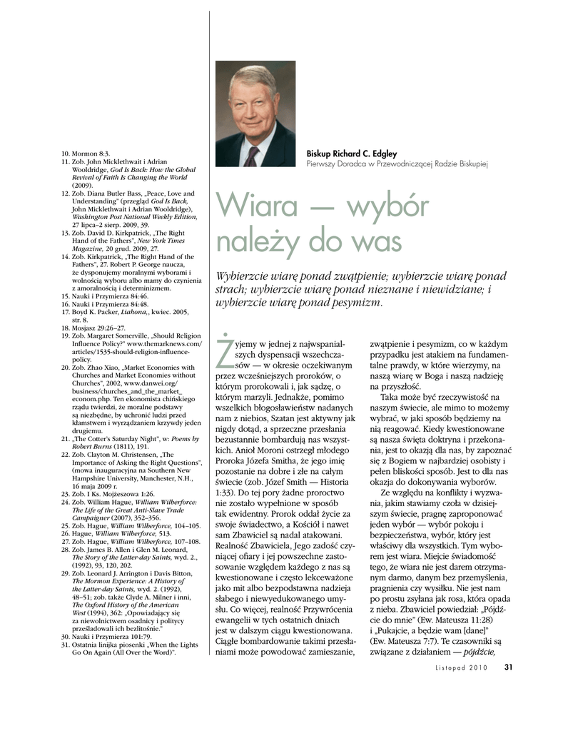 10. Mormon 8:3. 11. Zob. John Micklethwait i Adrian Wooldridge, God Is Back: How the Global Revival of Faith Is Changing the World (2009). 12. Zob. Diana Butler Bass, „Peace, Love and Understanding” (przegląd God Is Back, John Micklethwait i Adrian Wooldridge), Washington Post National Weekly Edition, 27 lipca–2 sierp. 2009, 39. 13. Zob. David D. Kirkpatrick, „The Right Hand of the Fathers”, New York Times Magazine, 20 grud. 2009, 27. 14. Zob. Kirkpatrick, „The Right Hand of the Fathers”, 27. Robert P. George naucza, że dysponujemy moralnymi wyborami i wolnością wyboru albo mamy do czynienia z amoralnością i determinizmem. 15. Nauki i Przymierza 84:46. 16. Nauki i Przymierza 84:48. 17. Boyd K. Packer, L iahona,, kwiec. 2005, str. 8. 18. Mosjasz 29:26–27. 19. Zob. Margaret Somerville, „Should Religion Influence Policy?” www.themarknews.com/ articles/1535-should-religion-influencepolicy. 20. Zob. Zhao Xiao, „Market Economies with Churches and Market Economies without Churches”, 2002, www.danwei.org/ business/churches_and_the_market_ econom.php. Ten ekonomista chińskiego rządu twierdzi, że moralne podstawy są niezbędne, by uchronić ludzi przed kłamstwem i wyrządzaniem krzywdy jeden drugiemu. 21. „The Cotter’s Saturday Night”, w: Poems by Robert Burns (1811), 191. 22. Zob. Clayton M. Christensen, „The Importance of Asking the Right Questions”, (mowa inauguracyjna na Southern New Hampshire University, Manchester, N.H., 16 maja 2009 r. 23. Zob. I Ks. Mojżeszowa 1:26. 24. Zob. William Hague, William Wilberforce: The Life of the Great Anti-Slave Trade Campaigner (2007), 352–356. 25. Zob. Hague, William Wilberforce, 104–105. 26. Hague, William Wilberforce, 513. 27. Zob. Hague, William Wilberforce, 107–108. 28. Zob. James B. Allen i Glen M. Leonard, The Story of the Latter-day Saints, wyd. 2., (1992), 93, 120, 202. 29. Zob. Leonard J. Arrington i Davis Bitton, The Mormon Experience: A History of the Latter-day Saints, wyd. 2. (1992), 48–51; zob. także Clyde A. Milner i inni, The Oxford History of the American West (1994), 362: „Opowiadający się za niewolnictwem osadnicy i politycy prześladowali ich bezlitośnie.” 30. Nauki i Przymierza 101:79. 31. Ostatnia linijka piosenki „When the Lights Go On Again (All Over the Word)”. Biskup Richard C. Edgley Pierwszy Doradca w Przewodniczącej Radzie Biskupiej Wiara — wybór należy do was Wybierzcie wiarę ponad zwątpienie; wybierzcie wiarę ponad strach; wybierzcie wiarę ponad nieznane i niewidziane; i wybierzcie wiarę ponad pesymizm. Ż yjemy w jednej z najwspanial szych dyspensacji wszechcza sów — w okresie oczekiwanym przez wcześniejszych proroków, o którym prorokowali i, jak sądzę, o którym marzyli. Jednakże, pomimo wszelkich błogosławieństw nadanych nam z niebios, Szatan jest aktywny jak nigdy dotąd, a sprzeczne przesłania bezustannie bombardują nas wszyst kich. Anioł Moroni ostrzegł młodego Proroka Józefa Smitha, że jego imię pozostanie na dobre i złe na całym świecie (zob. Józef Smith — Historia 1:33). Do tej pory żadne proroctwo nie zostało wypełnione w sposób tak ewidentny. Prorok oddał życie za swoje świadectwo, a Kościół i nawet sam Zbawiciel są nadal atakowani. Realność Zbawiciela, Jego zadość czy niącej ofiary i jej powszechne zasto sowanie względem każdego z nas są kwestionowane i często lekceważone jako mit albo bezpodstawna nadzieja słabego i niewyedukowanego umy słu. Co więcej, realność Przywrócenia ewangelii w tych ostatnich dniach jest w dalszym ciągu kwestionowana. Ciągłe bombardowanie takimi przesła niami może powodować zamieszanie, zwątpienie i pesymizm, co w każdym przypadku jest atakiem na fundamen talne prawdy, w które wierzymy, na naszą wiarę w Boga i naszą nadzieję na przyszłość. Taka może być rzeczywistość na naszym świecie, ale mimo to możemy wybrać, w jaki sposób będziemy na nią reagować. Kiedy kwestionowane są nasza święta doktryna i przekona nia, jest to okazją dla nas, by zapoznać się z Bogiem w najbardziej osobisty i pełen bliskości sposób. Jest to dla nas okazja do dokonywania wyborów. Ze względu na konflikty i wyzwa nia, jakim stawiamy czoła w dzisiej szym świecie, pragnę zaproponować jeden wybór — wybór pokoju i bezpieczeństwa, wybór, który jest właściwy dla wszystkich. Tym wybo rem jest wiara. Miejcie świadomość tego, że wiara nie jest darem otrzyma nym darmo, danym bez przemyślenia, pragnienia czy wysiłku. Nie jest nam po prostu zsyłana jak rosa, która opada z nieba. Zbawiciel powiedział: „Pójdź cie do mnie” (Ew. Mateusza 11:28) i „Pukajcie, a będzie wam [dane]” (Ew. Mateusza 7:7). Te czasowniki są związane z działaniem — pójdźcie, Listopad 2010 31 pukajcie. Są to wybory. Zatem mówię, wybierzcie wiarę. Wybierzcie wiarę ponad zwątpienie; wybierzcie wiarę ponad strach; wybierzcie wiarę ponad nieznane i niewidziane; i wybierzcie wiarę ponad pesymizm. Klasyczna rozprawa Almy na temat wiary w 32. rozdziale Księgi Almy w Księdze Mormona, jest wyszczegól nieniem wyborów, które zapewniają rozwój i utrzymanie naszej wiary. Alma poradził nam, jak dokonywać wyboru. Jego słowa były słowami działania poprzedzonego wyborem. Użył słów przebudzić się, wytężyć, wypróbować, wierzyć, pragnąć, wzra stać i zasadzić. Potem Alma wyjaśnił, że jeśli dokonamy tych wyborów i nie wypchniemy nasiona niewiarą, wtedy „zacznie ono wzbierać w waszym sercu” (Alma 32:28). Tak, wiara jest wyborem i trzeba się o nią starać i ją rozwijać. Dlatego jesteśmy odpowiedzialni za naszą własną wiarę. Jesteśmy również odpo wiedzialni za nasz brak wiary. Wybór należy do was. Dużo jeszcze nie wiem. Nie znam szczegółów zorganizowania materii w piękny świat, w którym żyjemy. Nie rozumiem złożoności Zadośćuczynie nia, tego, jak ofiara Zbawiciela może oczyścić wszystkich, którzy odpoku t