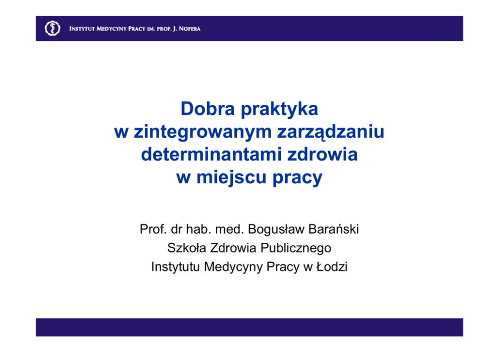 Dobra praktyka w zintegrowanym zarządzaniu determinantami zdrowia w miejscu pracy Prof. dr hab. med. Bogusław Barański Szkoła Zdrowia Publicznego Instytutu Medycyny Pracy w Łodzi Szacuje się, że około w Regionie Europejskim można by obniżyć poziom umieralności o około 30% poprzez znaczną poprawę jakości i zakresu ochrony i promocji zdrowia w miejscu pracy (na podstawie Murray Ch. and Lopez A. D. 1996) The Global Burden of Disease. Vol. 1. Harvard University Press, MA. W 2000 roku – 27 procent pracujących w krajach Unii Europejskiej uważało, że praca stwarza zagrożenie dla ich zdrowia i bezpieczeństwa Większość z nich wiązała się z pracą, takie dolegliwości jak: • • • • bóle kręgosłupa (33%) stres psychiczny (28%) ogólne zmęczenie (23%) bóle mięśni karku i barków (23%) Liczba niezdolnych do pracy z powodów zdrowotnych na 1000 pracujących • • • • W Polsce – 153 osoby Na Litwie – 100 osób W Niemczech – 66 osób W Szwajcarii – 44 osób ZUS podkreśla, ze renta z tytułu niezdolności do pracy nie ma charakteru socjalnej pomocy dla bezrobotnych Koszty chorób związanych z pracą w Niemczech w 1998 (źródło: BAuA 2002) Czynniki środowiska pracy • Ciężka praca/ Podnoszenie ciężarów (23%) • Niebezpieczne substancje • Wibracja • Uciążliwa pozycja pracy • Hałas • Niskie wymagania (9%) • Niska kontrola (14%) Bln € 16 14 12 10 8 6 Min. Koszt całk.: 28 mld € 14.9 13.5 11.1 13.4 4 2 Koszty bezpośrednie Koszty pośrednie 0 Obciążenie fizyczne Obciążenie psychiczne Koszty chorób związanych z pracą są to koszty leczenia i niezdolności do pracy pomnożone przez wartość ryzyka przypisanego (attributable risk -AR). AR określa udział pracy w rozwoju choroby, służąc jako wskaźnik korelacji pomiędzy chorobą, rodzajem zawodowego czynnika szkodliwego i nasileniem tego czynnika. Według danych ZUS koszt renty z tytułu niezdolności do pracy z powodów zdrowotnych jest większy niż nakłady NFZ na funkcjonowanie zakładów opieki zdrowotnej w Polsce Badania Przemysłowej Kasy Ubezpieczeń Zdrowotnych BKK i Niemieckiej Federacji Obowiązkowych Ubezpieczeń Wypadkowych i Prewencji (HVBG) ujawniły, że: • 1 € zainwestowane w zintegrowane zarządzanie zdrowiem (ZZZ) w przedsiębiorstwie dawało od 2,3 € do 4,9 € dzięki zmniejszeniu absencji chorobowej • absencja może się zmniejszyć od 12% do 36 % • 10 do 15 % osób objętych ZZZ wyzwalało się z nałogu palenia • system zdrowia publicznego stosując ZZZ w miejscu pracy może zyskać od 2,3 € do 5,9 € za każde zainwestowane Euro ENWHP Newsletter • No.3 • September 10th, 2003 European Network for Workplace Health Promotion] http://www.enwhp.org Volkswagen AG / Niemcy Liczba pracowników: 104.000 / lokalizacja: 6 fabryk w Niemczech Î Rada Nadzorcza i Wspólna Rada Pracy grupy Volkswagen wydały oficjalne wytyczne i standardy w sprawie zarządzania zdrowiem dla wszystkich fabryk VW Î Zdrowie na każdym poziomie zarządzania: System zarządzania zdrowiem jest koordynowany przez Departament Zdrowia, komitety bezpieczeństwa i zdrowia pracujących oraz „kółka” zdrowia Î Wprowadzono system sprawozdawczości nt. zdrowia pracujących: zawierający m. in. analizę badań lekarskich, badań opinii załogi, dane o absencji Î Wprowadzono wszechstronne uczestnictwo pracowników w zarządzaniu zdrowiem: „kółka” zdrowia, zarządzanie pomysłami, specjalne seminaria i warsztaty szkoleniowe oraz sprawdzanie skuteczności w praktyce Î Wyniki: zmniejszenie narażenia na czynniki fizyczne, mierzalna poprawa stanu zdrowia oraz oszczędności finansowe Urząd Miasta Dortmund Liczba pracowników: 8.500 Î Zmiany strukturalne związane z wprowadzaniem zaawansowanych technologii wymagają umotywowanej, wykwalifikowanej i zdrowej siły roboczej Î Utworzono specjalny systemu zarządzania zdrowiem pracujących w urzędzie z własnym budżetem i personelem Î Działania dwupoziomowe: centralny zespół zarządzania systemem zdrowia pracujących i działania zdecentralizowane Î Systematyczna analiza potrzeb zdrowotnych i uczestnictwa pracowników w zarządzaniu zdrowiem Î Efekty: Zintegrowane Zarządzanie Zdrowiem w miejscu pracy minimalizuje ryzyka zdrowotne i pomaga w pełni wykorzystać potencjał twórczy pracowników Determinanty zdrowia to: Czynniki osobiste, społeczne, kulturowe, ekonomiczne, środowiskowe i polityczne, które wpływają na stan zdrowia indywidualnych osób lub populacji Dobra praktyka w zintegrowanym zarządzaniu zdrowiem w miejscu pracy, a właściwie czynnikami wpływającymi na zdrowie, to: Systematyczny proces mający na celu poprawę wyników przedsiębiorstwa w zakresie oddziaływania na zdrowie, środowisko, bezpieczeństwo, podtrzymanie zdolności do pracy i kapitał społeczny. W proces ten zaangażowani są partnerzy społeczni i eksperci zarówno z samego przedsiębiorstwa, jak i z organizacji i instytucji spoza przedsiębiorstwa Dobra praktyka z zarządzaniu zdrowiem umożliwia pracodawcom i pracownikom zwiększenie kontroli nad determinantami ich własnego zdrowia zależnymi od: • środowiska pracy (uwarunkowań zawodowych) • stylu i kultury życia • społecznych uwarunkowań zdrowia • wpływu przedsiębiorstwa na środowisko (emisje zanieczyszczeń, wpływ produktów na zdrowie i środowisko Przykłady wskaźników • Oczekiwana długość życia (latach) mieszkańców w wieku 20, 45 i 65 lat • Częstość choroby niedokrwiennej serca (ICD-10: I20-I25, chorób układu mięśnio-szkieletowego (M00-M99), chorób psychicznych (F00-F99) wśród mieszkańców w wieku produkcyjnym • Częstość śmiertelnych wypadków zawodowych • Nowe przypadki trwałej niezdolności do pracy z powodu złego stanu zdrowia na 100 000 mieszkańców • Liczba zgonów w populacji w wieku produkcyjnym (18-65 lat) według przyczyny, płci, zawodu lub sektora zatrudnienia Kluczowi partnerzy w zarządzaniu 