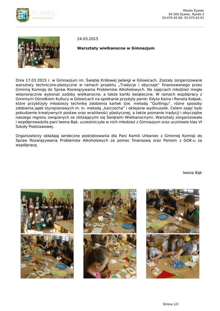 Miasto Żywiec 34-300 Żywiec, Rynek 2 33-475-42-00, 33-475-42-01 24.03.2015 Warsztaty wielkanocne w Gimnazjum Dnia 17.03.2015 r. w Gimnazjum im. Świętej Królowej Jadwigi w Gilowicach. Zostały zorganizowane warsztaty techniczno-plastyczne w ramach projektu „Tradycje i obyczaje” finansowanego przez Gminną Komisję do Spraw Rozwiązywania Problemów Alkoholowych. Na zajęciach młodzież mogła własnoręcznie wykonać ozdoby wielkanocne, a także kartki świąteczne. W ramach współpracy z Gminnym Ośrodkiem Kultury w Gilowicach na spotkanie przybyły panie: Edyta Kania i Renata Kołpak, które przybliżyły młodzieży technikę zdobienia kartek tzw. metodą ”Quillingu”, różne sposoby zdobienia jajek styropianowych m. in. metodą „karczocha” i oklejanie wydmuszek. Celem zajęć było pobudzenie kreatywnych postaw oraz wrażliwości plastycznej, a także poznanie tradycji i obyczajów naszego regionu związanych ze zbliżającymi się Świętami Wielkanocnymi. Warsztaty zorganizowała i współprowadziła pani Iwona Bąk, uczestniczyła w nich młodzież z Gimnazjum oraz uczniowie klas VI Szkoły Podstawowej. Organizatorzy składają serdeczne podziękowania dla Pani Kamili Urbaniec z Gminnej Komisji do Spraw Rozwiązywania Problemów Alkoholowych za pomoc finansową oraz Paniom z GOK-u za współpracę. Iwona Bąk Strona 1/2 Miasto Żywiec 34-300 Żywiec, Rynek 2 33-475-42-00, 33-475-42-01 Strona 2/2 Powered by TCPDF (www.tcpdf.org)