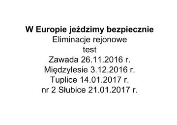 W Europie jeździmy bezpiecznie Eliminacje rejonowe test Zawada 26.11.2016 r. Międzylesie 3.12.2016 r. Tuplice 14.01.2017 r. nr 2 Słubice 21.01.2017 r. Zasady udzielania odpowiedzi Piszemy pismem czytelnym, najlepiej technicznym, Wpisujemy swoje nazwisko, imię, miejscowość gdzie jest szkoła, nr szkoły, jeżeli jest. Odpowiadamy wyłącznie na tej karcie odpowiedzi. Zaznaczamy znakiem x właściwe pole. Wypełniamy długopisem - nie czerwonym Na każde pytanie jest jedna odpowiedź. Nie wolno robić błędów, poprawiać odpowiedzi. Siedzicie obok siebie, nie zaglądajcie do sąsiada, bo on robi błędy. Nie spieszymy się. Czy każdy widzi ekran ? Przesiąść się. Czy są jeszcze jakieś pytania ? W trakcie można pytać, po podniesieniu ręki i udzieleniu głosu. 1. Postawa kierującego ruchem policjanta, który zwrócony jest bokiem do nadjeżdżającego rowerzysty oznacza: • A. uwaga, będzie zmiana, • B. zakaz wjazdu na skrzyżowanie, • C. ruch otwarty, można jechać. 2. Podczas jazdy ze szkolnymi opiekunami w zorganizowanej kolumnie rowerów, rowerzysta w wieku 14 lat : A. nie musi mieć karty rowerowej, B. nie musi stosować się do przepisów ruchu drogowego, C. musi stosować się do przepisów ruchu drogowego. 3. Pasażera może przewozić na rowerze: A – tylko osoba dorosła, B – osoba, która ukończyła 17 lat, C – osoba, która ma kartę rowerową. 4. Dopuszczalna prędkość rowerzysty w strefie zamieszkania: A. wynosi 20 km/h, B. wynosi 45 km/h, C. wynosi 50 km/h. 5. Który ze znaków nakazuje nam ustąpienie pierwszeństwa przejazdu? A. B. C. 6. Śluza dla rowerów jest częścią skrzyżowania przeznaczoną do: A. zatrzymywania rowerów w celu odpoczynku, B. oczekiwania rowerzystów przed innymi pojazdami na światło zielone umożliwiające kontynuację jazdy w planowanym kierunku, C. postoju 7. Rowerzysta, który przejeżdża z chodnika na chodnik po przejściu dla pieszych: A. może tak się poruszać, ale tylko gdy nie ma na przejściu pieszych; B. postępuje niezgodnie z prawem; C. postępuje prawidłowo, gdy nie przeszkadza pieszym. 8. W którym przypadku nadjeżdżający z prawej strony ma pierwszeństwo? A B C 9. Obowiązkowe wyposażenie roweru to: A - sprawne dwa hamulce, czerwony odblask z tyłu. B – czerwone światło z tyłu, odblaski na szprychach roweru. C - sygnał dźwiękowy, sprawny jeden hamulec. 10. Dojeżdżając do skrzyżowania ze znakiem STOP rowerzysta: A. musi zatrzymać się przed znakiem STOP B. nie musi się zatrzymywać, jedzie dalej, jeżeli nie nadjeżdżają pojazdy, C. musi się zatrzymać w miejscu o dobrej widoczności 11. W tej sytuacji kierujący pojazdem: A. 3 ma pierwszeństwo przed pojazdem 1, B. 2 ma pierwszeństwo przed pojazdem 3, C. 1 przejeżdża pierwszy. 12. Dwaj rowerzyści mogą jechać na drodze obok siebie, jeżeli: A – nie wolno jechać obok siebie, B – jeżeli nie utrudniają jazdy innym, C – jeżeli jadą odpowiednio szybko. 13. Rowerzysta może wyprzedzać z prawej strony: A - wolno jadące samochody B – wolniej jadących rowerzystów C – z prawej strony nie wolno wyprzedzać 14. Pieszy idący poza terenem zabudowanym: A. ma pierwszeństwo przed pojazdami i może korzystać z całej szerokości drogi, B. powinien poruszać się lewym poboczem, C. jeżeli ma odblaski, to może poruszać się lewą lub prawą stroną drogi. 15. W tej sytuacji: A. kierujący pojazdem nr 1 ma pierwszeństwo przed pieszym, B. kierujący pojazdem nr 2 ma pierwszeństwo przed pieszym, C. piesi mają pierwszeństwo przed pojazdami nr 1 i 2. 16. Na tym skrzyżowaniu: A. kierujący pojazdem nr 1 przejeżdża pierwszy; B. kierujący pojazdem nr 2 przejeżdża pierwszy; C. kierujący pojazdem nr 3 przejeżdża pierwszy. 17. Jeżeli wzdłuż drogi jest wyznaczona ścieżka rowerowa w obu kierunkach, to: A. rowerzysta może jechać po chodniku, B. rowerzysta może jechać po jezdni C. rowerzysta musi jechać po ścieżce. 18. W tej sytuacji rowerzysta: A. Jedzie pierwszy B. Jedzie drugi C. Jedzie trzeci 19. Gdy włączasz się do ruchu z zatoki musisz: A – zasygnalizować, obejrzeć się, gdy jest bezpiecznie ruszać, B – ruszyć, zasygnalizować, obejrzeć się, C – obejrzeć się, zasygnalizować, jeszcze raz się obejrzeć, ruszać. 20. Kontrapas dla rowerzystów może być wyznaczony na drodze: A- jednokierunkowej; B- dwukierunkowej; C- dwujezdniowej.