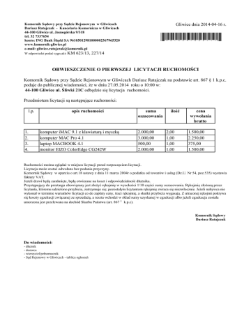 Komornik Sądowy przy Sądzie Rejonowym w Gliwicach Dariusz Ratajczak - Kancelaria Komornicza w Gliwicach 44-100 Gliwice ul. Jasnogórska 9/318 tel. 32 7337654 konto: ING Bank Śląski SA 96105012981000002367965320 www.komornik-gliwice.pl e-mail: [email protected] W odpowiedzi podać sygn.akt: KM Gliwice dnia 2014-04-16 r. *4014041600111* 623/13, 227/14 OBWIESZCZENIE O PIERWSZEJ LICYTACJI RUCHOMOŚCI Komornik Sądowy przy Sądzie Rejonowym w Gliwicach Dariusz Ratajczak na podstawie art. 867 § 1 k.p.c. podaje do publicznej wiadomości, że w dniu 27.05.2014 roku o 10:00 w: 44-100 Gliwice ul. Śliwki 21C odbędzie się licytacja ruchomości. Przedmiotem licytacji są następujące ruchomości: l.p. 1. 2. 3. 4. opis ruchomości komputer iMAC 9.1 z klawiaturą i myszką komputer MAC Pro 4.1 laptop MACBOOK 4.1 monitor EIZO ColorEdge CG242W suma oszacowania 2.000,00 3.000,00 500,00 2.000,00 ilość 2,00 1,00 1,00 1,00 cena wywołania brutto 1.500,00 2.250,00 375,00 1.500,00 Ruchomości można oglądać w miejscu licytacji przed rozpoczęciem licytacji. Licytacja może zostać odwołana bez podania przyczyny. Komornik Sądowy w oparciu o art.18 ustawy z dnia 11 marca 2004r o podatku od towarów i usług (Dz.U. Nr 54, poz.535) wystawia faktury VAT. Jeżeli drzwi będą zamknięte, będą otwierane na koszt i odpowiedzialność dłużnika. Przystępujący do przetargu obowiązany jest złożyć rękojmię w wysokości 1/10 części sumy oszacowania. Rękojmię złożoną przez licytanta, któremu udzielono przybicia, zatrzymuje się; pozostałym licytantom rękojmię zwraca się niezwłocznie. Jeżeli nabywca nie wykonał w terminie warunków licytacji co do zapłaty ceny, traci rękojmię, a skutki przybicia wygasają. Z utraconej rękojmi pokrywa się koszty egzekucji związanej ze sprzedażą, a reszta wchodzi w skład sumy uzyskanej w egzekucji albo jeżeli egzekucja została umorzona jest przelewana na dochód Skarbu Państwa (art. 867 1 k.p.c). Komornik Sądowy Dariusz Ratajczak Do wiadomości: - dłużnik - dozorca - wierzyciel/pełnomocnik - Sąd Rejonowy w Gliwicach - tablica ogłoszeń
