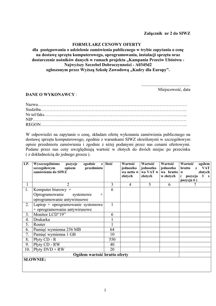 Załącznik nr 2 do SIWZ FORMULARZ CENOWY OFERTY dla postępowania o udzielenie zamówienia publicznego w trybie zapytania o cenę na dostawę sprzętu komputerowego, oprogramowania, instalacji sprzętu oraz dostarczenie nośników danych w ramach projektu „Kampania Przeciw Ubóstwu Najwyższy Szczebel Dobroczynności - A0345d2 ogłoszonym przez Wyższą Szkołę Zawodową „Kadry dla Europy”. ............................................. Miejscowość, data DANE O WYKONAWCY : Nazwa…………………………………………………………………………………………. Siedziba……………………………………………………………………………………….. Nr tel/faks……………………………………………………………………………………... NIP……………………………………………………………………………………………. REGON……………………………………………………………………………………….. W odpowiedzi na zapytanie o cenę, składam ofertę wykonania zamówienia publicznego na dostawę sprzętu komputerowego, zgodnie z warunkami SIWZ określonymi w szczegółowym opisie przedmiotu zamówienia i zgodnie z niżej podanymi przez nas cenami ofertowymi. Podane przez nas ceny uwzględniają wartość w złotych do dwóch miejsc po przecinku ( z dokładnością do jednego grosza ). LP. Wyszczególnione pozycje szczegółowym opisem zamówienia do SIWZ zgodnie z Ilość przedmiotu 1 1. Wartość jednostko wa netto w złotych 2 3 4 Komputer biurowy + 6 Oprogramowanie systemowe + oprogramowanie antywirusowe 2. Laptop + oprogramowanie systemowe 1 + oprogramowanie antywirusowe 3. Monitor LCD”19” 6 4. Drukarka 1 5. Router 1 6. Pamięć wymienna 256 MB 64 7. Pamięć wymienna 1 GB 10 8. Płyty CD - R 550 9. Płyty CD - RW 40 10. Płyty DVD + RW 20 Ogółem wartość brutto oferty SŁOWNIE: 1 Wartość jednostko wa VAT w złotych Wartość jednostko wa brutto w złotych Wartość ogółem brutto z VAT w złotych ( pozycja 3 x pozycja 6 ) 5 6 7 Ogółem wartość brutto oferty obejmuje koszt transportu do Zamawiającego, dostawę i instalację sprzętu i oprogramowania na adres: Wyższa Szkoła Zawodowa „Kadry dla Europy”, ul. P. Mansfelda 4, 60-855 Poznań Przystępując do ww. postępowania oświadczam\y, że: • zapoznaliśmy się ze Specyfikacją Istotnych Warunków Zamówienia i nie wnosimy do niej zastrzeżeń. • akceptujemy postanowienia umowy stanowiące załącznik do Specyfikacji Istotnych Warunków Zamówienia . • uważamy się za związani niniejszą ofertą w terminie 30 dni od upływu terminu składania ofert. • w przypadku wyboru naszej oferty zobowiązujemy się do podpisania umowy w terminie i miejscu wskazanym przez Zamawiającego. .............................,dnia .............................. .............................................................. pieczęć i podpi s osoby upoważnionej do reprezentowania wykonawcy 2