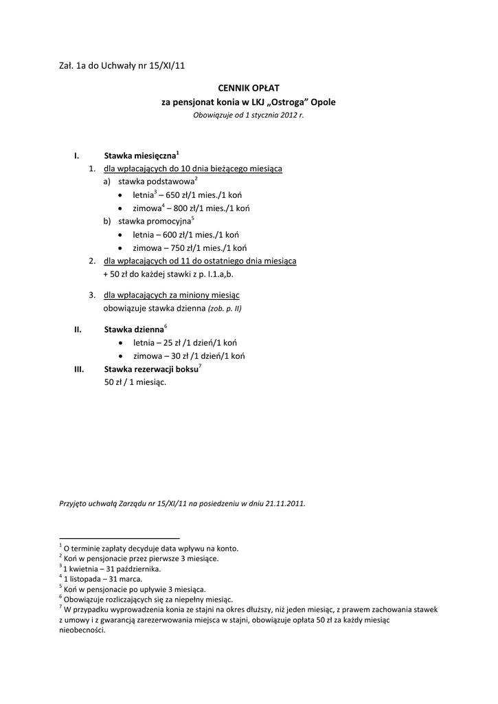 Zał. 1a do Uchwały nr 15/XI/11 CENNIK OPŁAT za pensjonat konia w LKJ „Ostroga” Opole Obowiązuje od 1 stycznia 2012 r. I. Stawka miesięczna1 1. dla wpłacających do 10 dnia bieżącego miesiąca a) stawka podstawowa2 letnia3 – 650 zł/1 mies./1 koo zimowa4 – 800 zł/1 mies./1 koo b) stawka promocyjna5 letnia – 600 zł/1 mies./1 koo zimowa – 750 zł/1 mies./1 koo 2. dla wpłacających od 11 do ostatniego dnia miesiąca + 50 zł do każdej stawki z p. I.1.a,b. 3. dla wpłacających za miniony miesiąc obowiązuje stawka dzienna (zob. p. II) II. III. Stawka dzienna6 letnia – 25 zł /1 dzieo/1 koo zimowa – 30 zł /1 dzieo/1 koo Stawka rezerwacji boksu7 50 zł / 1 miesiąc. Przyjęto uchwałą Zarządu nr 15/XI/11 na posiedzeniu w dniu 21.11.2011. 1 O terminie zapłaty decyduje data wpływu na konto. Koo w pensjonacie przez pierwsze 3 miesiące. 3 1 kwietnia – 31 października. 4 1 listopada – 31 marca. 5 Koo w pensjonacie po upływie 3 miesiąca. 6 Obowiązuje rozliczających się za niepełny miesiąc. 7 W przypadku wyprowadzenia konia ze stajni na okres dłuższy, niż jeden miesiąc, z prawem zachowania stawek z umowy i z gwarancją zarezerwowania miejsca w stajni, obowiązuje opłata 50 zł za każdy miesiąc nieobecności. 2 Zał. 1b do Uchwały nr 15/XI/11 CENNIK OPŁAT za korzystania z ujeżdżalni w LKJ „Ostroga” Opole Obowiązuje od 1 stycznia 2012 r. Korzystanie z ujeżdżalni krytych i zewnętrznych, dla koni nie będących w pensjonacie. 1. 1 godz. na wyłącznośd – 150 zł., w czasie ujętym w harmonogramie dla jazd na prywatnych koniach, bez względu na ilośd koni i rodzaj zajęd (ujeżdżenie czy skoki). Termin należy uzgodnid z Dyrektorem Klubu (uzgadniad z wyprzedzeniem, w godzinach urzędowania). 2. 1 godz. wspólna ze stałymi zajęciami klubowymi – 50 zł/1 koo ; 35 zł/1 koo członka LKJ „Ostroga”, w czasie ujętym w harmonogramie dla jazd rekreacyjnych lub treningów. Termin należy uzgodnid z instruktorem/trenerem wpisanym do harmonogramu jazd (uzgadniad co najmniej z 1.dniowym wyprzedzeniem). Korzystanie płatne z góry, przelewem. Przyjęto uchwałą Zarządu nr 15/XI/11 na posiedzeniu w dniu 21.11.2011.