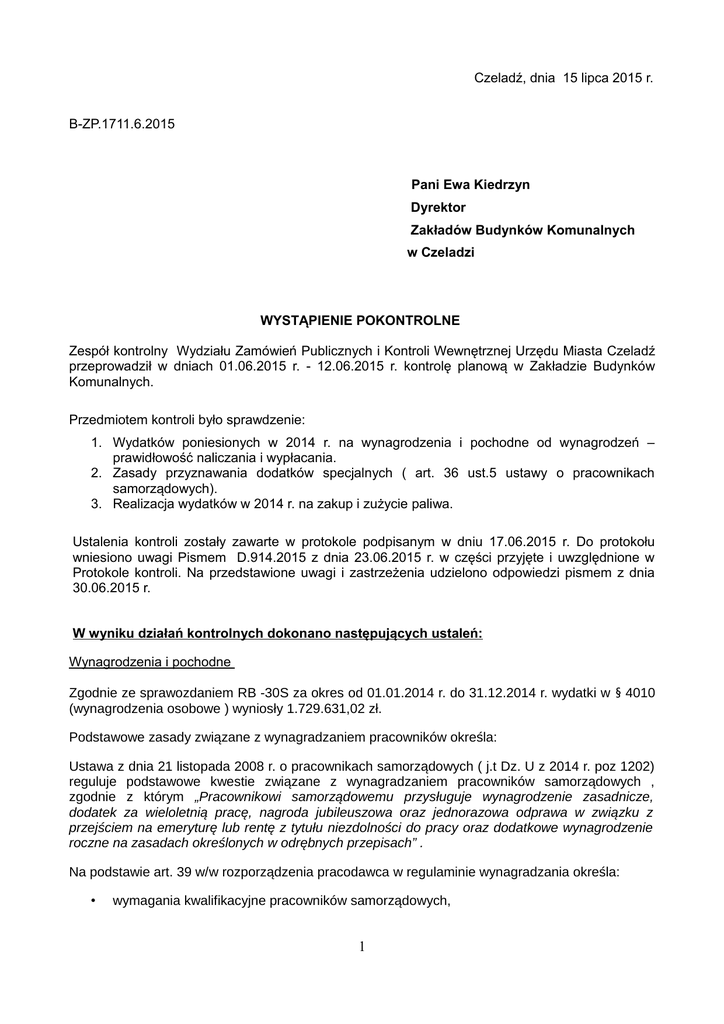Czeladź, dnia 15 lipca 2015 r. B-ZP.1711.6.2015 Pani Ewa Kiedrzyn Dyrektor Zakładów Budynków Komunalnych w Czeladzi WYSTĄPIENIE POKONTROLNE Zespół kontrolny Wydziału Zamówień Publicznych i Kontroli Wewnętrznej Urzędu Miasta Czeladź przeprowadził w dniach 01.06.2015 r. - 12.06.2015 r. kontrolę planową w Zakładzie Budynków Komunalnych. Przedmiotem kontroli było sprawdzenie: 1. Wydatków poniesionych w 2014 r. na wynagrodzenia i pochodne od wynagrodzeń – prawidłowość naliczania i wypłacania. 2. Zasady przyznawania dodatków specjalnych ( art. 36 ust.5 ustawy o pracownikach samorządowych). 3. Realizacja wydatków w 2014 r. na zakup i zużycie paliwa. Ustalenia kontroli zostały zawarte w protokole podpisanym w dniu 17.06.2015 r. Do protokołu wniesiono uwagi Pismem D.914.2015 z dnia 23.06.2015 r. w części przyjęte i uwzględnione w Protokole kontroli. Na przedstawione uwagi i zastrzeżenia udzielono odpowiedzi pismem z dnia 30.06.2015 r. W wyniku działań kontrolnych dokonano następujących ustaleń: Wynagrodzenia i pochodne Zgodnie ze sprawozdaniem RB -30S za okres od 01.01.2014 r. do 31.12.2014 r. wydatki w § 4010 (wynagrodzenia osobowe ) wyniosły 1.729.631,02 zł. Podstawowe zasady związane z wynagradzaniem pracowników określa: Ustawa z dnia 21 listopada 2008 r. o pracownikach samorządowych ( j.t Dz. U z 2014 r. poz 1202) reguluje podstawowe kwestie związane z wynagradzaniem pracowników samorządowych , zgodnie z którym „Pracownikowi samorządowemu przysługuje wynagrodzenie zasadnicze, dodatek za wieloletnią pracę, nagroda jubileuszowa oraz jednorazowa odprawa w związku z przejściem na emeryturę lub rentę z tytułu niezdolności do pracy oraz dodatkowe wynagrodzenie roczne na zasadach określonych w odrębnych przepisach” . Na podstawie art. 39 w/w rozporządzenia pracodawca w regulaminie wynagradzania określa: • wymagania kwalifikacyjne pracowników samorządowych, 1 • szczegółowe warunki wynagradzania, w tym maksymalny poziom wynagrodzenia zasadniczego . Dodatkowo określić może: • warunki przyznawania oraz warunki i sposób wypłacania premii i nagród innych niż nagroda jubileuszowa, • warunki i sposób przyznawania dodatków, o których mowa w art.36 ust. 4 i 5 (dodatek funkcyjny i dodatek specjalny) oraz innych dodatków. Szczegółowe zasady wynagradzania reguluje Rozporządzenie Rady Ministrów z 18 marca 2009 r. w sprawie wynagradzania pracowników samorządowych (j.t. Dz. U z 2014 r. poz 1786). Rozporządzenie określa m.in.: • wykaz stanowisk z uwzględnieniem podziału na stanowiska kierownicze urzędnicze, urzędnicze, pomocnicze i obsługi oraz doradców i asystentów; • minimalne wymagania kwalifikacyjne niezbędne do wykonywania pracy na poszczególnych stanowiskach; • warunki i sposób wynagradzania pracowników samorządowych zatrudnionych na podstawie umowy o pracę, w tym minimalny poziom wynagrodzenia zasadniczego na poszczególnych stanowiskach; • warunki przyznawania i wypłacania nagrody jubileuszowej i dodatku za wieloletnią pracę; • warunki ustalania prawa do jednorazowej odprawy w związku z przejściem na emeryturę lub rentę z tytułu niezdolności do pracy i jej wypłacania. Na podstawie powyższych regulacji Zarządzeniem Nr 26/2012 Dyrektora Zakładu Budynków Komunalnych z dnia 24 sierpnia 2012 r. wprowadzono „Regulamin wynagradzania pracowników zatrudnionych w ZBK”. Regulamin określa: 1. Wymagania kwalifikacyjne - zapisy odnoszą się do wymagań określonych w Rozporządzeniu i zawarto je w załączniku nr 3 , który obejmuje stanowiska kierownicze, stanowiska urzędnicze, stanowiska biurowe, pomocnicze i obsługi. W tabeli określono rodzaj stanowiska, kategorię zaszeregowania, maksymalny poziom dodatku funkcyjnego oraz wymagania kwalifikacyjne do poszczególnych stanowisk. Po zmianie Regulaminu Organizacyjnego brak w regulaminie ujęcia nowych stanowisk w zakresie wydziałów i referatów. 2. Szczegółowe warunki wynagradzania z określeniem przysługujących pracownikowi elementów wynagrodzenia od wynagrodzenia zasadniczego do świadczeń z ubezpieczenia społecznego. 3. Inne świadczenia związane z pracą – określono warunki nabycia uprawnień do dodatku stażowego i jego wysokość procentową i zasady nabycia uprawnień do nagrody jubileuszowej, wysokość procentową i zasady uprawniające do odprawy emerytalnej lub rentowej. 4. Dodatkowe świadczenia pieniężne wynikające ze stosunku pracy: - dodatek funkcyjny - określono rodzaj stanowisk uprawniający do otrzymania dodatku w wysokości wskazanej w załączniku nr 2 do zarządzenia, - dodatek specjalny – określono zasady jego przyznawania i wysokość % , - dodatek kasowy – wskazano wysokość dodatku do 200 zł na stałe pracownikowi, który w zastępstwie pełni obowiązki kasjera. - nagrody – określono kryteria w oparciu ,o które są przyznawane, 2 5. Podróże służbowe na terenie kraju – opisane zasady odnoszą się do diet, przejazdów i zwrotów kosztów. W regulaminie brak określenia zasad przyznawania dodatków wymienionych w § 5 : • dodatek za opiekę nad pracownikiem w służbie przygotowawczej, • dodatek za pracę w porze nocnej, • dodatek za pracę w niedziele i święta, • dodatek za pracę w godzinach nadliczbowych, • odprawa pośmiertna – brak odwołania do przepisów. Wynagrodzenie zasadnicze Wynagrodzenie pracownika ustala się na podstawie kategorii zaszeregowania ( zał. nr 3 do Regulaminu) i miesięcznej stawki wynagrodzenia zasadniczego odpowiadającej kategorii zaszeregowania (zał. nr 1 do regulaminu).W sprawdzonych 7 angażach w jednym przypadku pracownik zatrudniony w ramach prac interwencyjnych w angażu nie posiadał określonej kategorii zaszeregowania. W wykazie stanowisk określających kategorię zaszeregowania i inne przysługujące dodatki brak ujęcia stanowiska pracownika na pracach interwencyjnych Rozporządzenie Rady Ministrów z 18 marca 2